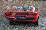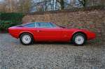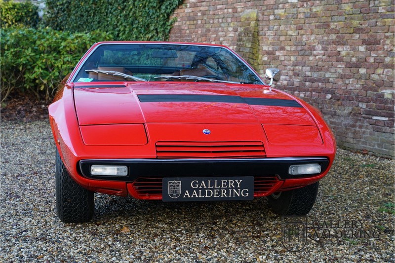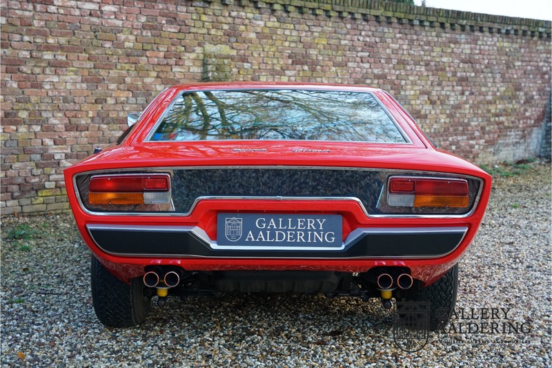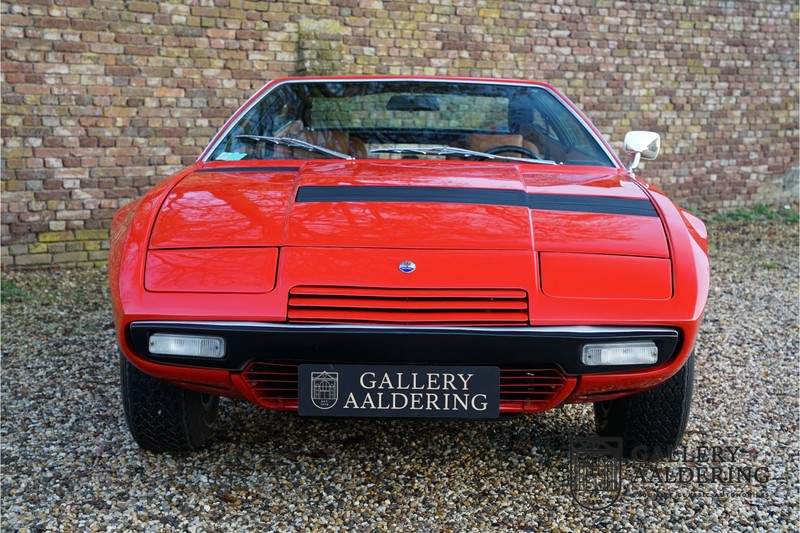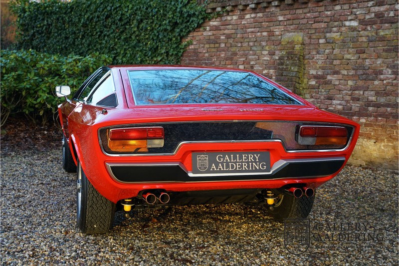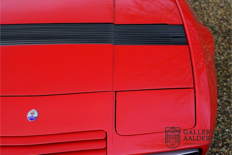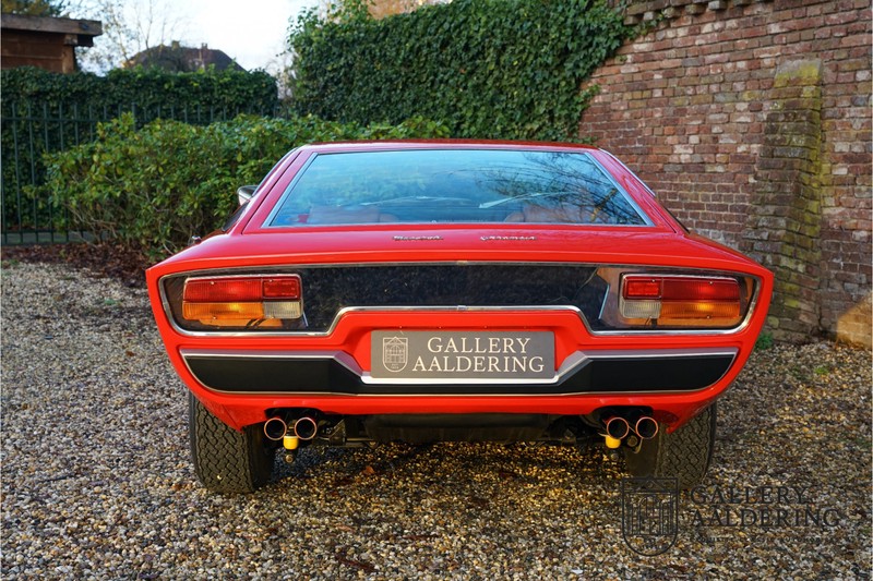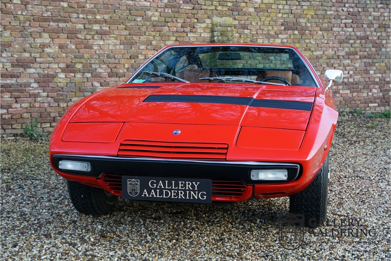 Het is toch fantastisch? Wanneer zag u voor het laatst een Maserati Khamsin? Bent u bekend met het model? De Maserati Khamsin is een ultieme 70’s Gran Tourer en was Maserati’s idee van een auto die tot doel had om op snelheid door Europa te reizen. Dit specifieke exemplaar is voor het eerst tot het verkeer toegelaten in 1974 heeft nog maar 28.745 kilometer op de teller en verkeert in een hele goede staat. Laten we eens beginnen met hoe en waarom dit model tot stand kwam. In 1972 kreeg Studio Bertone voor de eerste keer de opdracht om een Maserati te ontwerpen. De Khamsin werd op de autoshow van Turijn in 1972 als studiemodel voor het eerst aan het publiek getoond op de stand van Bertone. Het model werd zeer goed ontvangen en in maart 1973 stond het productiemodel op de Maserati stand op de Autosalon van Parijs te schitteren. De Khamsin werd gepresenteerd als de opvolger van de Maserati Ghibli. Maserati had ten tijde van de Khamsin ook de Bora in het gamma maar die werd door veel klanten meer als sportwagen gezien in plaats van Gran Tourer vanwege de middenmotor achter de voorstoelen. De Khamsin lostte dat probleem op met zijn meer conventioneel gepositioneerde voor-middenmotor. Als kers op de taart was de Khamsin ook nog eens een 2+2 en had de auto voor zijn afmetingen een hele behoorlijke kofferbakruimte. Hoewel de Maserati Khamsin in theorie een daverend succes zou moeten zijn gooide de oliecrisis roet in het eten en verkocht Maserati er uiteindelijk slechts 435 stuks. De auto die u hier ziet betreft de showauto van de Turin Motorshow in 1974. Mocht u nog foto’s hebben uit die tijd dan klopt het dat u de auto niet direct herkend. De Khamsin werd al eens volledig gerestaureerd en werd opnieuw gespoten in de “Fuoco” rode kleur die ze vandaag de dag nog steeds draagt. Het Maserati certificaat bij de auto leert ons dat de auto werd uitgeleverd met een “Celeste Chiaro” exterieur en een “Senape” Conolly lederen interieur. De Khamsin is in elke hoedanigheid een fraaie auto maar deze sportieve rode kleur accentueert de sportieve lijnen van de koets nog net even iets beter dan een lichtblauwe lak. De carrosserie verkeert in prachtige staat met mooi strak plaatwerk en correcte passingen. Ook de verchroomde sierlijsten zijn in prima conditie. Het met leder beklede interieur is in prachtige staat. Het leder is zeer goed verzorgd en is heerlijk soepel. De zwarte tapijten zien er eveneens zeer fraai uit. De bovenzijde van het dashboard is bekleed met zwart alcantara, dat er niet alleen sportief uitziet maar ook voorkomt dat er hinderlijke reflecties van de ruit doorkomen tijdens het rijden. De auto is altijd zeer goed onderhouden en rijdt dan ook fantastisch. Recentelijk is de auto voorzien van volledig nieuwe remmen, nieuwe ophangingsrubbers en zijn de schokbrekers gereviseerd. De motor loopt fantastisch en heeft in elk toerenbereik voldoende power tot zijn beschikking. De motor is gekoppeld aan een handgeschakelde transmissie van ZF die zich precies laat bedienen en fijne bakverhoudingen heeft. Dankzij de recente werkzaamheden aan ondre andere het onderstel en de remmen heeft deze “Gran Tourer” een verrukkelijk rijgedrag. De auto wordt geleverd met een uitgebreide map met documentatie, zo is er onder andere het eerdergenoemde Maserati certificaat aanwezig, de originele handleiding, een werkplaatshandboek, een originele folder en veel correspondentie betreffende de auto teruggaand tot het jaar 1975! Kortom een prachtige Maserati Khamsin met een mooie kleurstelling in goede conditie.