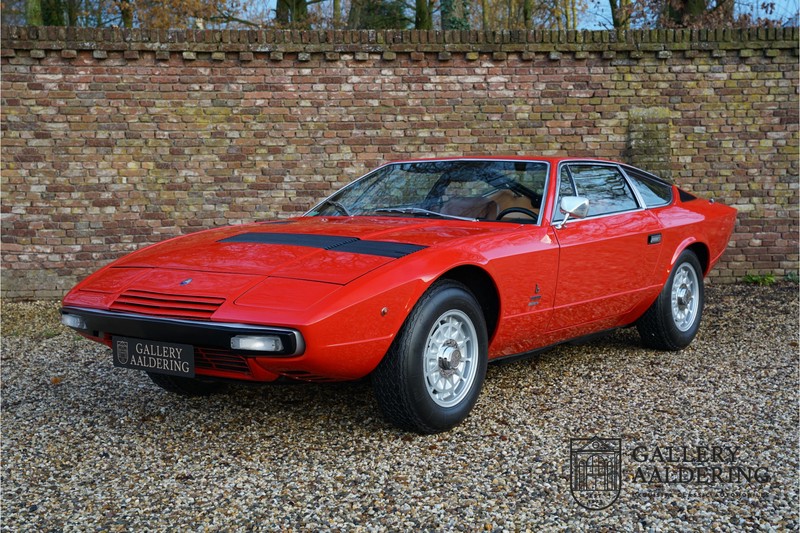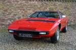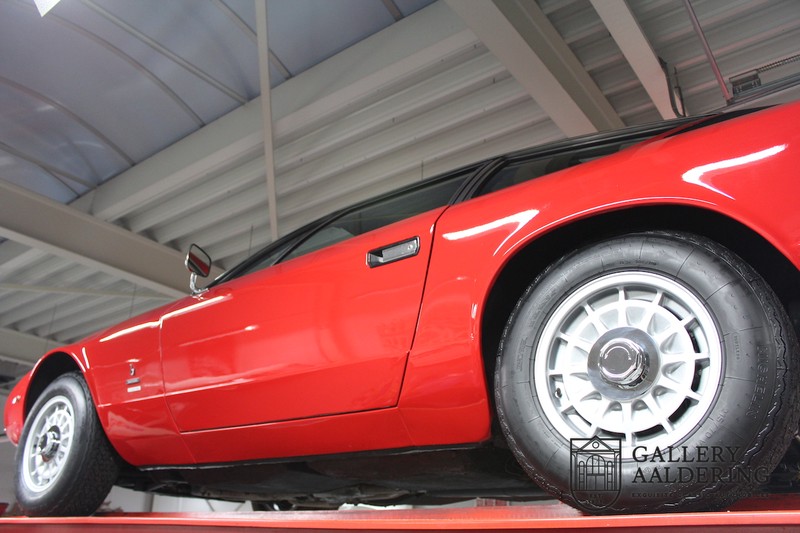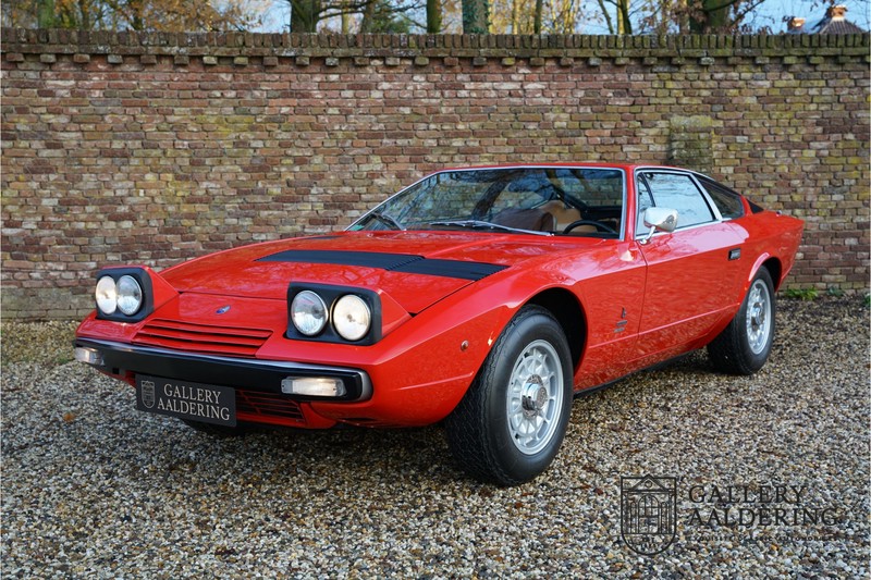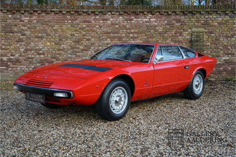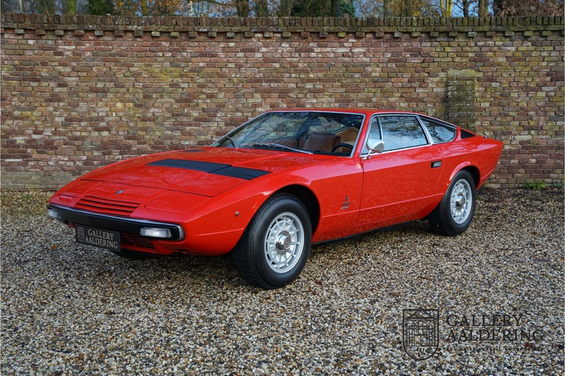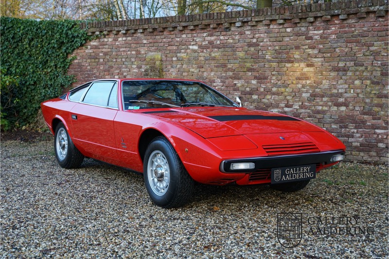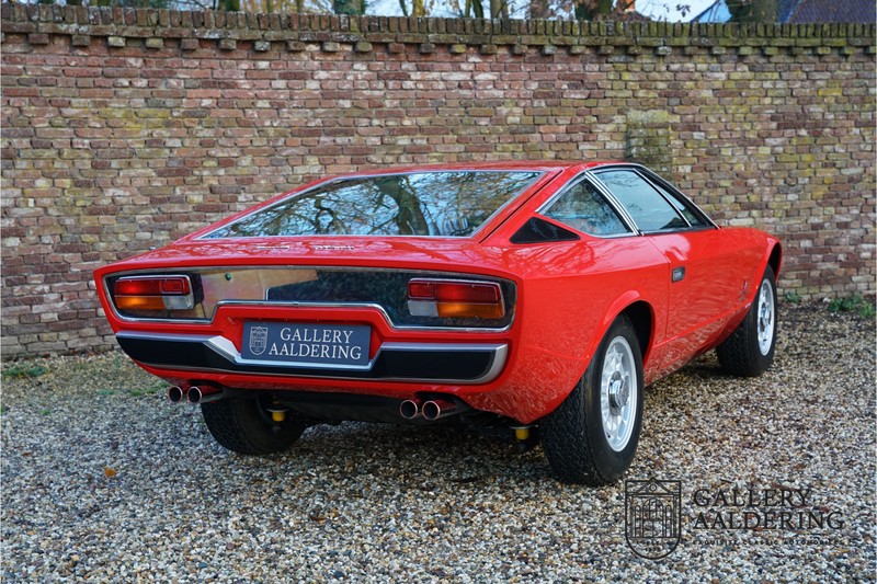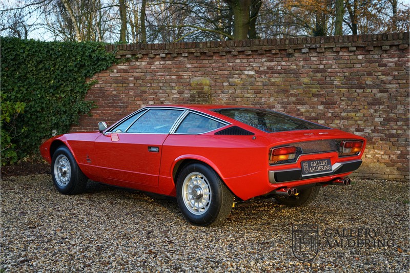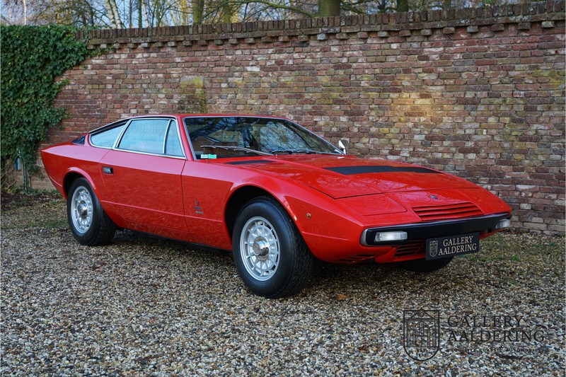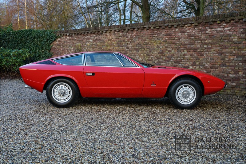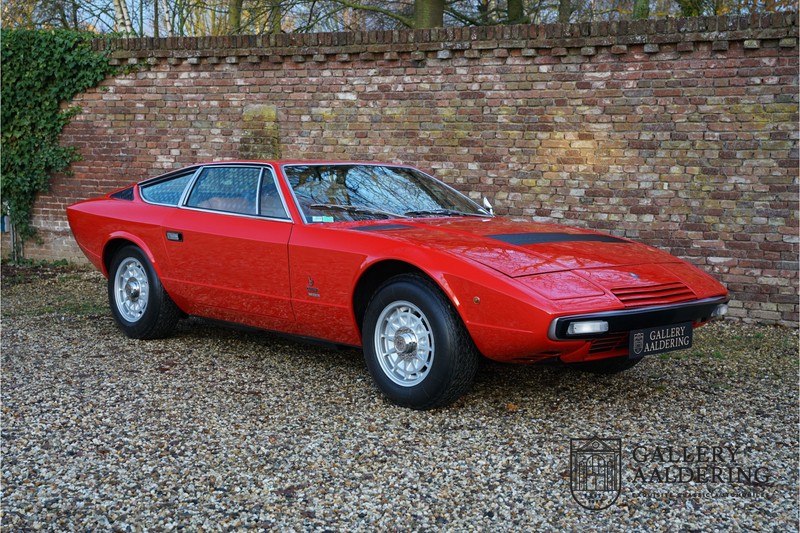 sehr guten Zustand, es hatte seine Zulassung in 1974 und die Laufleistung beträgt nur 28.745 Km. In 1972 bekam Bertone zum 1. Mal den Auftrag einen Maserati zu entwerfen, das Ergebnis war der Khamsin, der, einer Tradition des Unternehmens folgend, nach einem Wind benannt war. Der Chamsin ist ein Wind aus der arabischen Wüste in den Ländern südöstlich des Mittelmeers. Die Karosserie aus Stahl war selbsttragend ausgelegt. Marcello Gandini hatte sie für Bertone entworfen, bei Bertone wurden auch die Rohkarosserien gefertigt. Ein Studienmodell wurde in 1972 dem Publikum präsentiert beim Turiner Autosalon. Die Kritiken war gut und in März 1973 wurde das Produktionsmodell beim Pariser Autoshow introduziert. Der Maserati Ghibli war inzwischen „in die Jahre gekommen“ und in1971 entschied sich Maserati für die Entwicklung eines Nachfolgers mit dem technischen Konzept des Ghibli, so ist der Khamsin entstanden. Ab Beginn der 1970er-Jahre setzte Maserati auf Mittelmotorsportwagen, die eine Reaktion auf die erfolgreichen Sportwagen des Konkurrenten Lamborghini sein sollten. So entstand mit Blick auf den Lamborghini Miura der Maserati Bora. Dieses Auto wurde von vielen Kunden viel mehr als Sportwagen betrachtet. Maserati hatte folgende Lösung: der Motor wurde hinter der Vorderachse eingebaut; dadurch ergab sich eine nahezu ausgewogene Gewichtsverteilung. Dazu hatte der Khamsin eine 2+2 Karosserie und einen ziemlich guten und brauchbaren Kofferraum. Das Auto sollte einen großen Erfolg werden, aber dann war leider die Ölkrise da und Maserati verkaufte nur 435 Exemplare. Dieses Auto ist das Fahrzeug vom Turiner Autoshow in 1974. Vielleicht haben Sie noch Bilder davon, Sie werden das Auto nicht mehr erkennen, denn es wurde schon mal komplett restauriert. Dabei wurde der Maserati neu lackiert in der Farbe “Fuoco Rot“. Das Zertifikat von Maserati zeigt und, dass die Originalfarbe “Celeste Chiaro“ war mit einem “Senape Conolly“ Interieur aus Leder. Es ist natürlich Geschmacksache, aber wir finden diese rote Farbe besser zu dem Sportwagen passen im Vergleich zu der originalen hellblauen Farbe. Die Karosserie befindet sich in einem wunderschönen Zustand, sie ist sehr glatt und hat korrekte Passungen. Auch die Chrom Zierleisten befinden sich in einem guten Zustand und das Lederinterieur befindet sich ebenfalls in einem wunderschönen Zustand, das Leder wurde gut gepflegt und ist sehr geschmeidig. Die schwarze Teppiche sehen sehr gut aus und das schöne Armaturenbrett wurde an der Oberseite mit Alcantara überzogen. Es sieht sehr schön aus und vermeidet Reflexionen der Windschutzscheibe beim Fahren. Das Fahrzeug wurde immer gut gepflegt und der Maserati lässt sich dementsprechend sehr gut fahren. Vor kurzem wurden folgende Arbeiten durchgeführt: eine neue Bremsanlage, Gummis der Radaufhängung erneuert und eine Revidierung der Stoßdämpfer. Der Motor läuft fantastisch und ist sehr kräftig bei jeder Drehzahl, das ZF Schaltgetriebe funktioniert einwandfrei. Dank der guten Pflege und den vor kurzem durchgeführten Arbeiten hat der GT ein herrliches Fahrverhalten. Der Khamsin ist gut dokumentiert mit u.a. dem Zertifikat von Maserati, der originalen Bedienungsanleitung, dem Werkstattbuch und der originalen Broschüre. Auch gibt es viel Korrespondenz, welche zurückgeht bis 1975! Ein wunderschöner Maserati Khamsin mit einer schönen Farbkombination in einem guten Zustand. Die Gallery Aaldering in den Niederlanden existiert seit 1975 und ist Marktführer in Europa im Bereich von klassischen Fahzreugen. Es sind immer 400 klassische Fahzreuge und Sportwagen auf Vorrat. Bitte besuchen Sie unsere Website www.gallery-aaldering.com für den aktuellen Vorrat und weitere Informationen. Alle gezeigte Fahrzeuge sind zu besichtingen in unseren Ausstellungsräumen. Wir haben unseren Sitz unweit der deutschen Grenze, 95 Km Entfernung von Düsseldorf und 90 Km Entfernung von Amsterdam, gut erreichbar mit dem Zug, Auto, Taxi und Flugzeug. Transport und Versand weltweit kann versorgt werden, innerhalb von Europa fallen keine Importsteuern oder Zollkosten an. Unsere Kerntätigkeiten sind Ankauf, Verkauf und Konsignationverkauf. (im Auftrag vom Kunde) Wir versorgen alle Zulassungsunterlagen (H-Kennzeichen, Fahrzeugbrief, Wertgutachten usw.) für unsere deutsche- und Beneluxkunden. Bei uns können Sie auch leasen oder finanzieren! Unser Leasingpartner bietet maßgeschneiderte Lösungen für private und gewerbliche Kunden. Gallery Aaldering, Arnhemsestraat 47, 6971 AP Brummen in den Niederlanden. T. 0031-575-564055 Qualität, Erfahrung und Transparenz sind unsere besondere Merkmale! Wir freuen und auf Ihren Besuch.