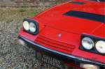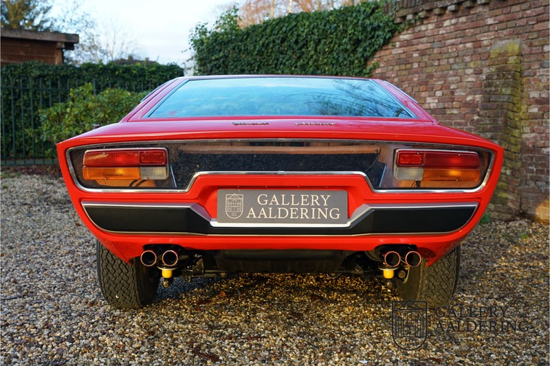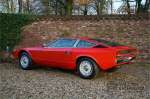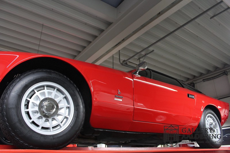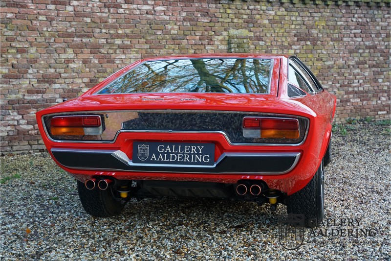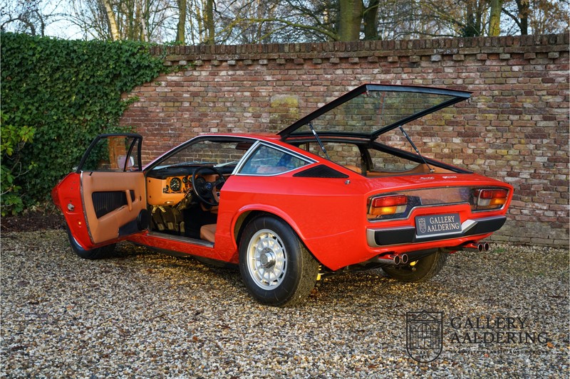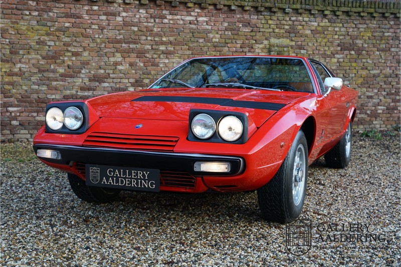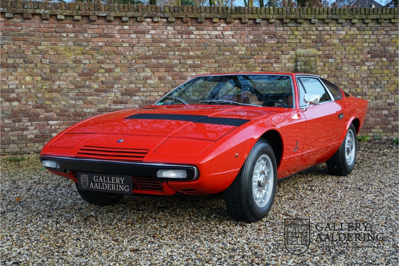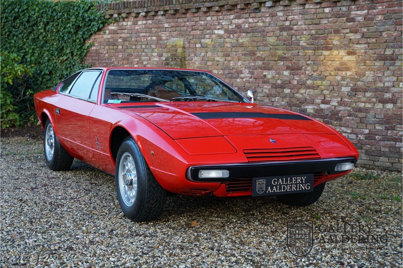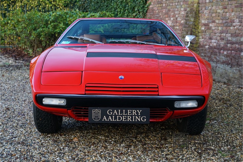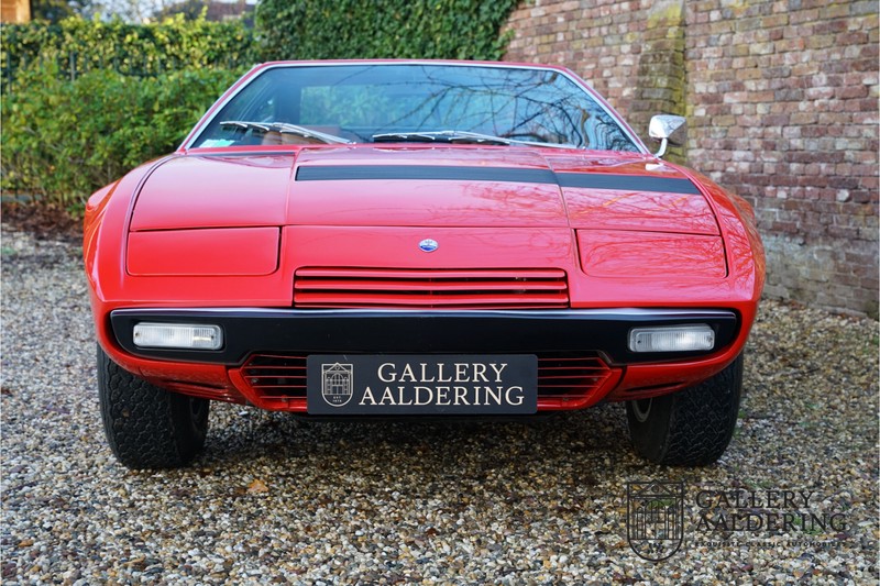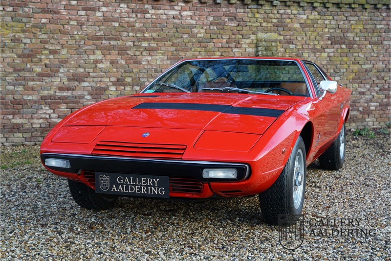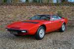 sehr guten Zustand, es hatte seine Zulassung in 1974 und die Laufleistung beträgt nur 28.745 Km. In 1972 bekam Bertone zum 1. Mal den Auftrag einen Maserati zu entwerfen, das Ergebnis war der Khamsin, der, einer Tradition des Unternehmens folgend, nach einem Wind benannt war. Der Chamsin ist ein Wind aus der arabischen Wüste in den Ländern südöstlich des Mittelmeers. Die Karosserie aus Stahl war selbsttragend ausgelegt. Marcello Gandini hatte sie für Bertone entworfen, bei Bertone wurden auch die Rohkarosserien gefertigt. Ein Studienmodell wurde in 1972 dem Publikum präsentiert beim Turiner Autosalon. Die Kritiken war gut und in März 1973 wurde das Produktionsmodell beim Pariser Autoshow introduziert. Der Maserati Ghibli war inzwischen „in die Jahre gekommen“ und in1971 entschied sich Maserati für die Entwicklung eines Nachfolgers mit dem technischen Konzept des Ghibli, so ist der Khamsin entstanden. Ab Beginn der 1970er-Jahre setzte Maserati auf Mittelmotorsportwagen, die eine Reaktion auf die erfolgreichen Sportwagen des Konkurrenten Lamborghini sein sollten. So entstand mit Blick auf den Lamborghini Miura der Maserati Bora. Dieses Auto wurde von vielen Kunden viel mehr als Sportwagen betrachtet. Maserati hatte folgende Lösung: der Motor wurde hinter der Vorderachse eingebaut; dadurch ergab sich eine nahezu ausgewogene Gewichtsverteilung. Dazu hatte der Khamsin eine 2+2 Karosserie und einen ziemlich guten und brauchbaren Kofferraum. Das Auto sollte einen großen Erfolg werden, aber dann war leider die Ölkrise da und Maserati verkaufte nur 435 Exemplare. Dieses Auto ist das Fahrzeug vom Turiner Autoshow in 1974. Vielleicht haben Sie noch Bilder davon, Sie werden das Auto nicht mehr erkennen, denn es wurde schon mal komplett restauriert. Dabei wurde der Maserati neu lackiert in der Farbe “Fuoco Rot“. Das Zertifikat von Maserati zeigt und, dass die Originalfarbe “Celeste Chiaro“ war mit einem “Senape Conolly“ Interieur aus Leder. Es ist natürlich Geschmacksache, aber wir finden diese rote Farbe besser zu dem Sportwagen passen im Vergleich zu der originalen hellblauen Farbe. Die Karosserie befindet sich in einem wunderschönen Zustand, sie ist sehr glatt und hat korrekte Passungen. Auch die Chrom Zierleisten befinden sich in einem guten Zustand und das Lederinterieur befindet sich ebenfalls in einem wunderschönen Zustand, das Leder wurde gut gepflegt und ist sehr geschmeidig. Die schwarze Teppiche sehen sehr gut aus und das schöne Armaturenbrett wurde an der Oberseite mit Alcantara überzogen. Es sieht sehr schön aus und vermeidet Reflexionen der Windschutzscheibe beim Fahren. Das Fahrzeug wurde immer gut gepflegt und der Maserati lässt sich dementsprechend sehr gut fahren. Vor kurzem wurden folgende Arbeiten durchgeführt: eine neue Bremsanlage, Gummis der Radaufhängung erneuert und eine Revidierung der Stoßdämpfer. Der Motor läuft fantastisch und ist sehr kräftig bei jeder Drehzahl, das ZF Schaltgetriebe funktioniert einwandfrei. Dank der guten Pflege und den vor kurzem durchgeführten Arbeiten hat der GT ein herrliches Fahrverhalten. Der Khamsin ist gut dokumentiert mit u.a. dem Zertifikat von Maserati, der originalen Bedienungsanleitung, dem Werkstattbuch und der originalen Broschüre. Auch gibt es viel Korrespondenz, welche zurückgeht bis 1975! Ein wunderschöner Maserati Khamsin mit einer schönen Farbkombination in einem guten Zustand. Die Gallery Aaldering in den Niederlanden existiert seit 1975 und ist Marktführer in Europa im Bereich von klassischen Fahzreugen. Es sind immer 400 klassische Fahzreuge und Sportwagen auf Vorrat. Bitte besuchen Sie unsere Website www.gallery-aaldering.com für den aktuellen Vorrat und weitere Informationen. Alle gezeigte Fahrzeuge sind zu besichtingen in unseren Ausstellungsräumen. Wir haben unseren Sitz unweit der deutschen Grenze, 95 Km Entfernung von Düsseldorf und 90 Km Entfernung von Amsterdam, gut erreichbar mit dem Zug, Auto, Taxi und Flugzeug. Transport und Versand weltweit kann versorgt werden, innerhalb von Europa fallen keine Importsteuern oder Zollkosten an. Unsere Kerntätigkeiten sind Ankauf, Verkauf und Konsignationverkauf. (im Auftrag vom Kunde) Wir versorgen alle Zulassungsunterlagen (H-Kennzeichen, Fahrzeugbrief, Wertgutachten usw.) für unsere deutsche- und Beneluxkunden. Bei uns können Sie auch leasen oder finanzieren! Unser Leasingpartner bietet maßgeschneiderte Lösungen für private und gewerbliche Kunden. Gallery Aaldering, Arnhemsestraat 47, 6971 AP Brummen in den Niederlanden. T. 0031-575-564055 Qualität, Erfahrung und Transparenz sind unsere besondere Merkmale! Wir freuen und auf Ihren Besuch.