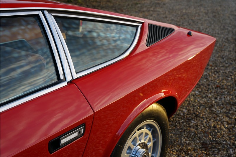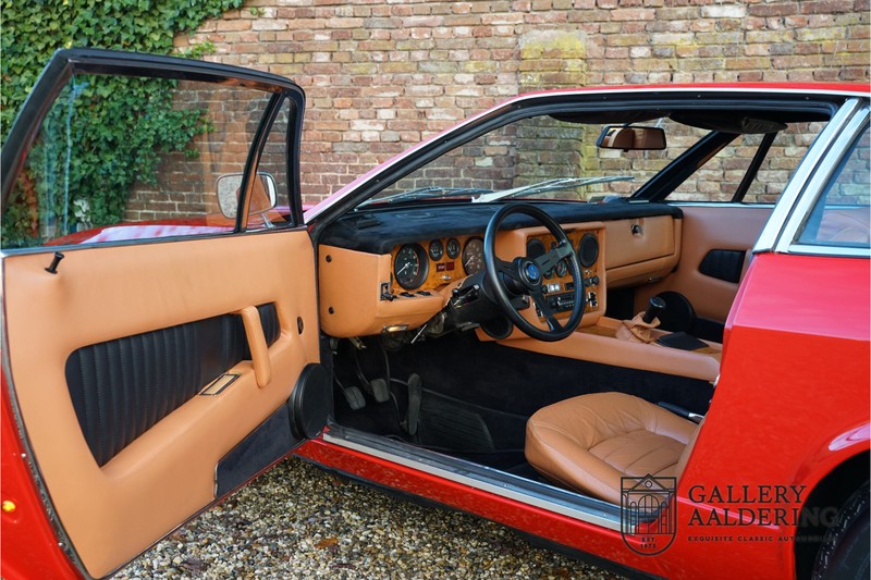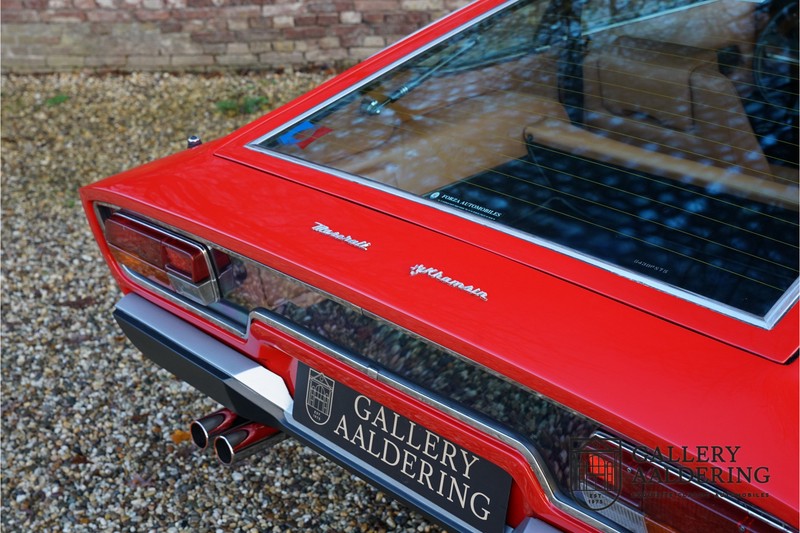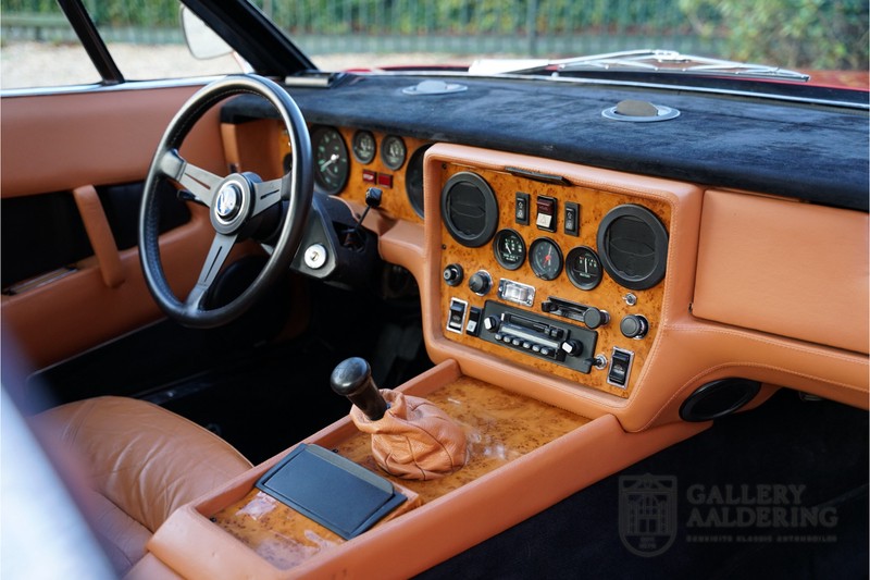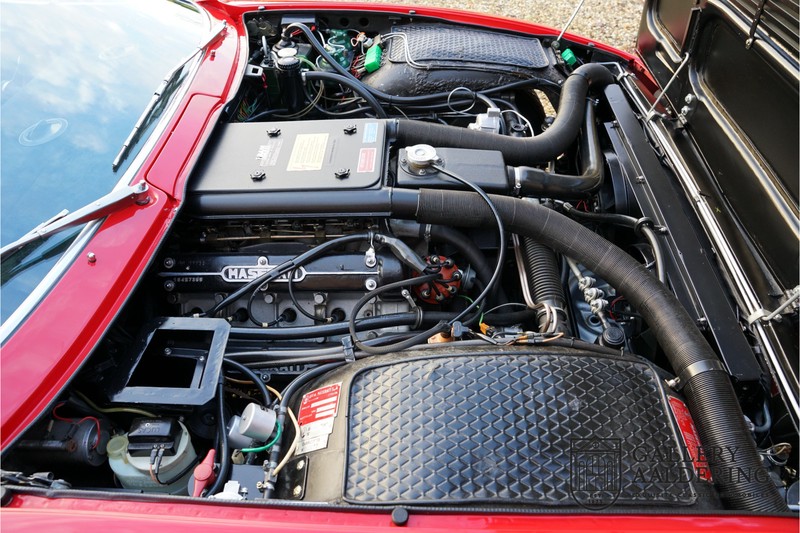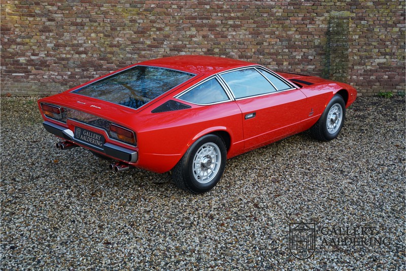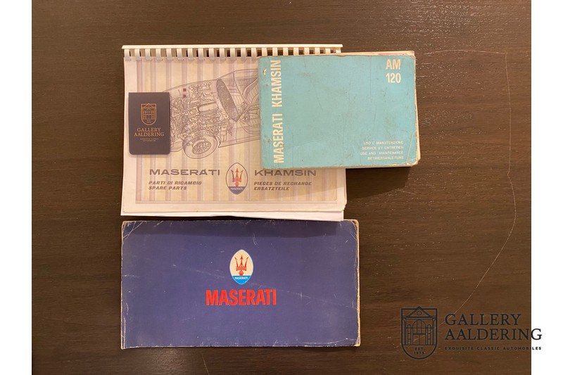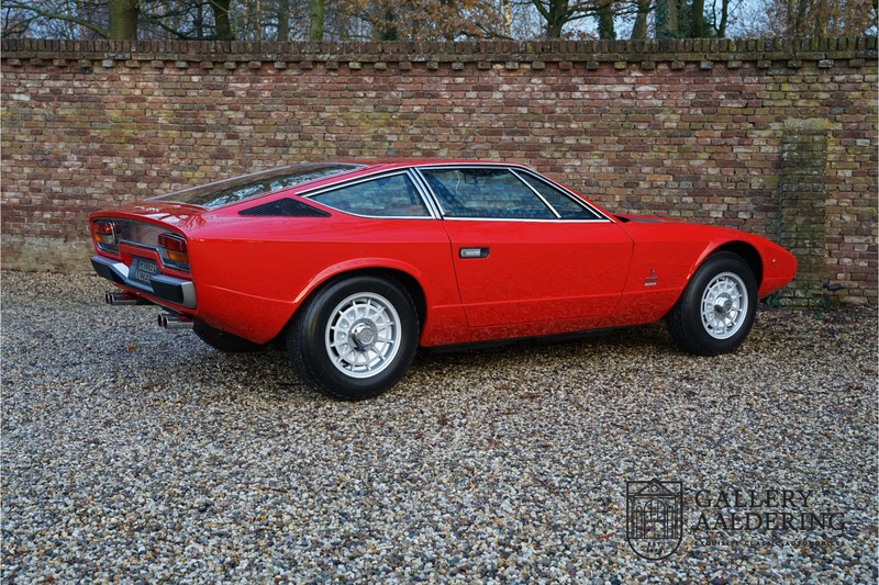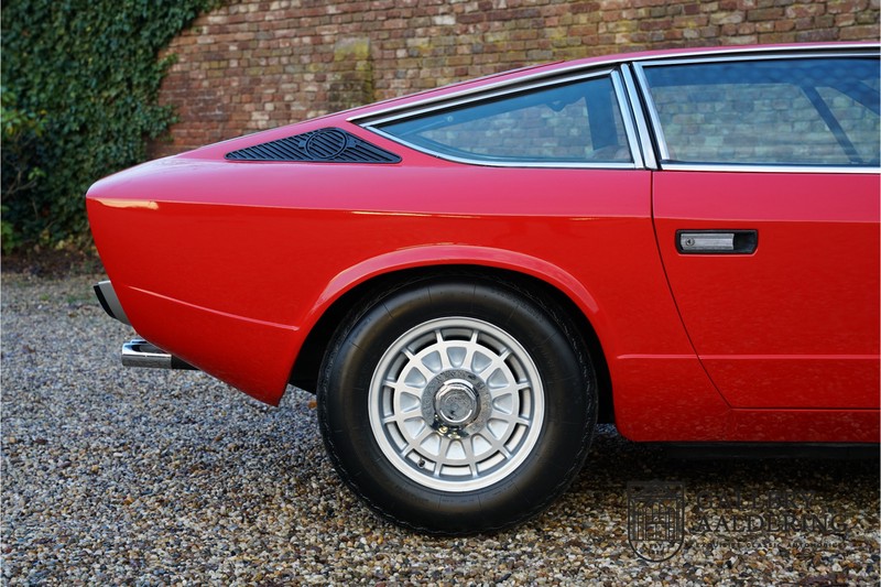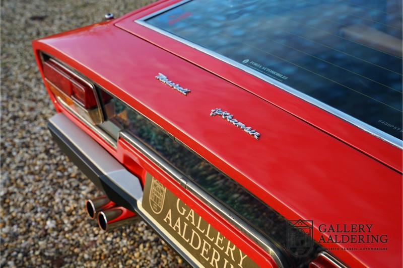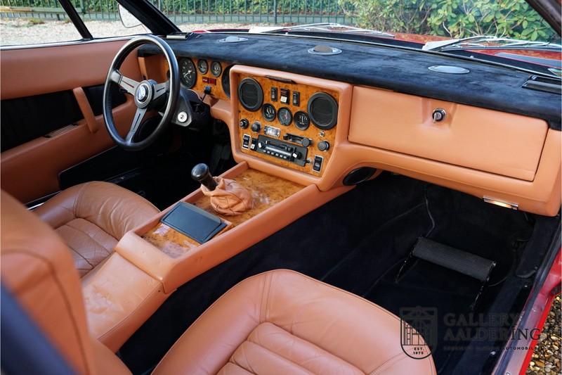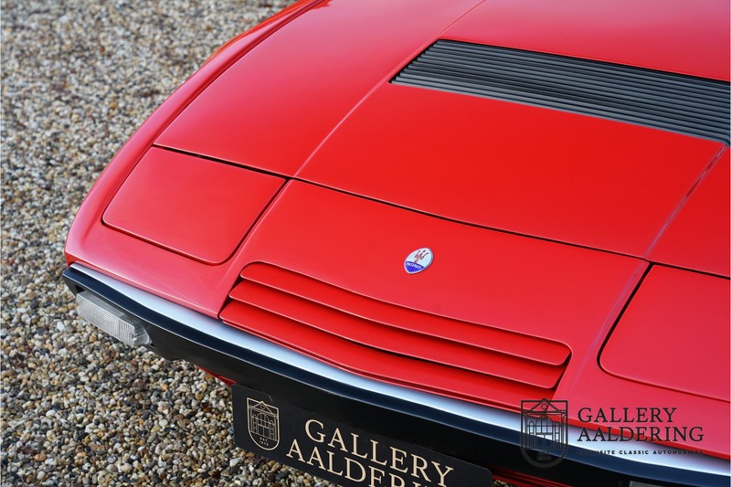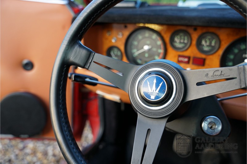 finish she has today. The accompanying Maserati certificate shows the car initially had a “Celeste Chiaro” exterior and a “Senape” Conolly” leather interior trim. Already a stunning car to behold the sporty red colour show off the Khamsin’s sporty lines just that little bit than the light blue finish. The lovely bodywork is in great shape with straight and correctly aligned panelwork. The chrome brightwork is in fine condition. The leather clad interior is also in great shape. The leather has been very well preserved and is lovely and supple. The black carpets also look great. The dashboard top is clad in black alcantara, preventing nuisance window glare whilst driving. The car has always been very well maintained and as a consequence drives a treat. Recently new brakes and suspension rubbers have been fitted and the shock breakers have been refurbished. The engine runs fantastically and has ample power over the whole range. The engine is coupled to a manual ZF gearbox delivering well-known precision and fine gear ratios. Thanks to the recent work carried out to the brakes and suspension amongst others this Grand Tourer has impeccable roadholding manners. The car comes with an extensive documentation file including the earlier mentioned Maserati certificate, the original owner’s manual, a workshop manual, an original brochure and lots of correspondence relating to the car going back to 1975! This is without doubt a gorgeous Maserati Khamsin with a fetching finish and in good condition. Gallery Aaldering is Europe’s leading Classic Cars specialist since 1975! Always 400 Classic and Sportscars in stock, please visit www.gallery-aaldering.com for the current stock list (all offered cars are available in our showroom) and further information. We are located near the German border, 95 km from Düsseldorf and 90 km from Amsterdam. So easy traveling by plane, train, taxi and car. Transport and worldwide shipping can be arranged. No duties/import costs within Europe. We buy, sell and provide consignment sales (selling on behalf of the owner). We can arrange/provide registration/papers for our German (H-Kennzeichen, TÜV, Fahrzeugbrief, Wertgutachten usw.) and Benelux customers. Gallery Aaldering, Arnhemsestraat 47, 6971 AP Brummen, The Netherlands. Tel: 0031-575-564055. Quality, experience and transparency is what sets us apart. We look forward to welcoming you in our showroom
