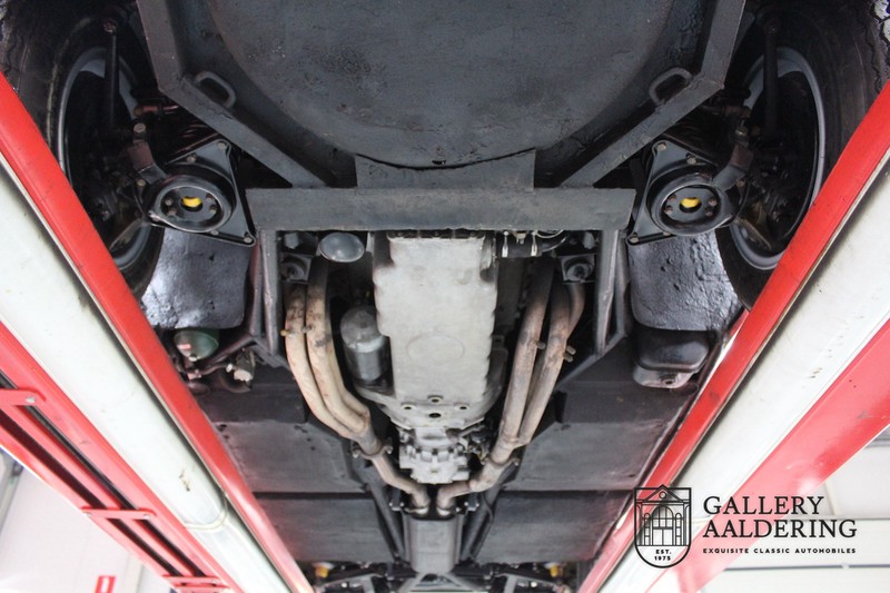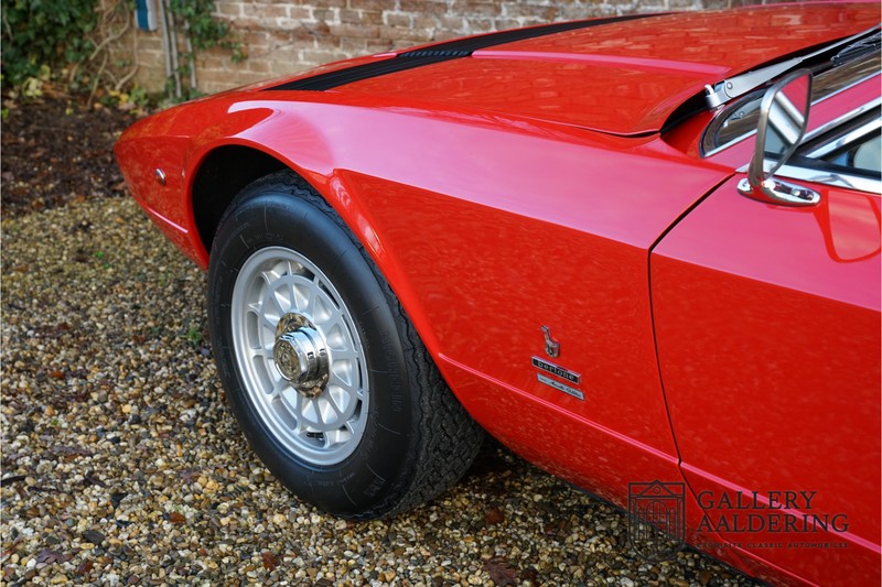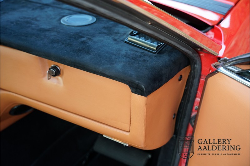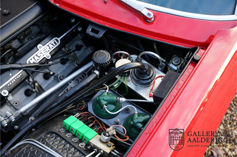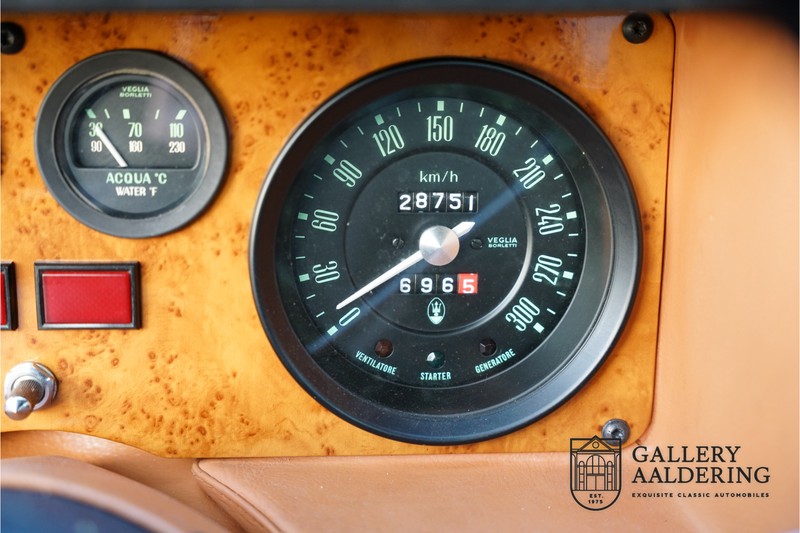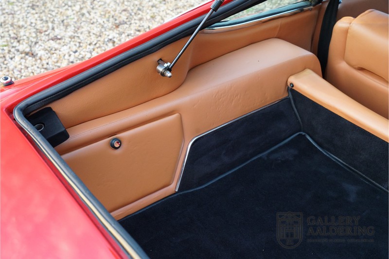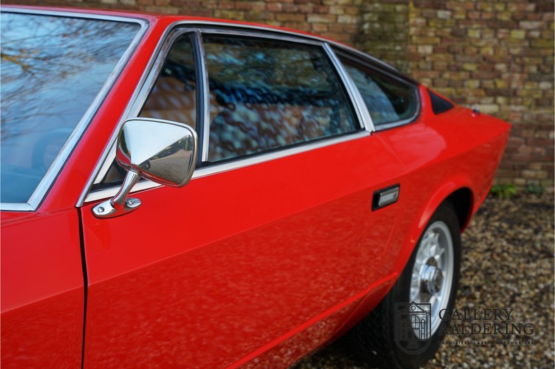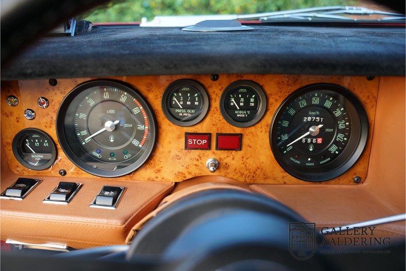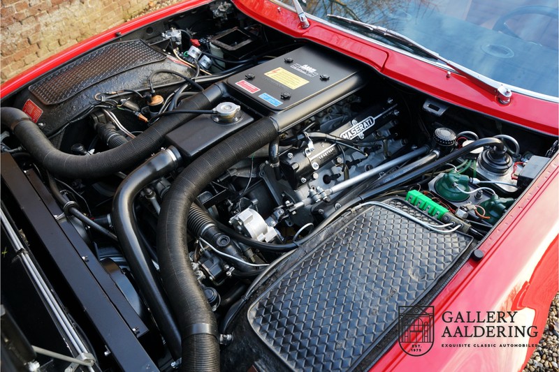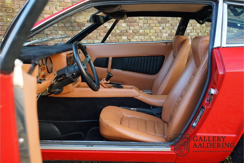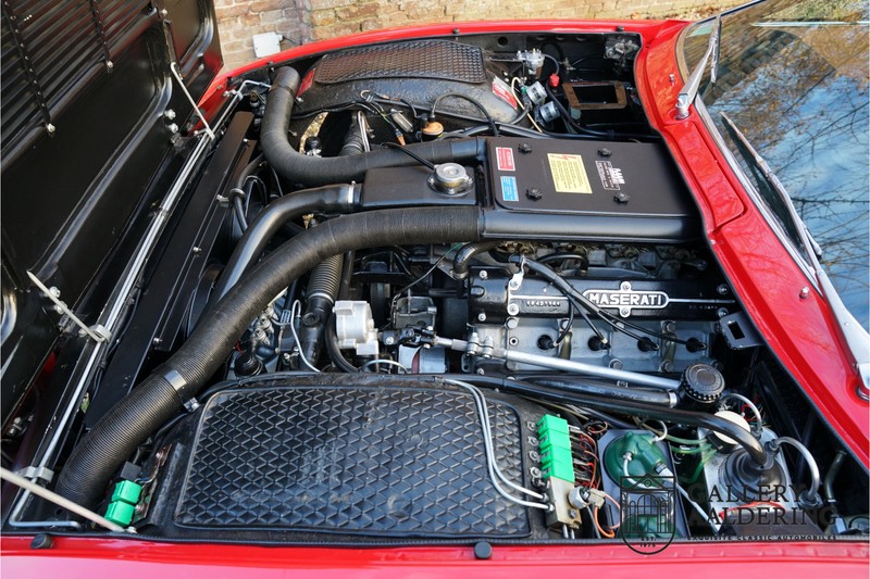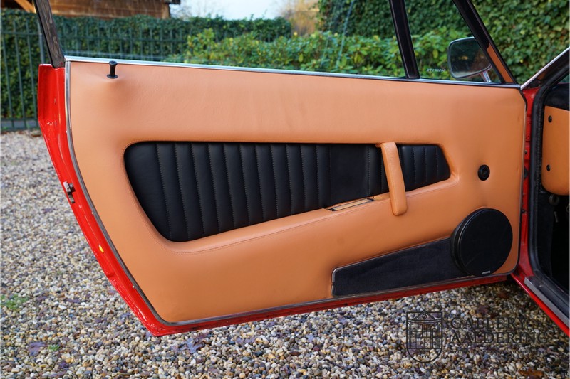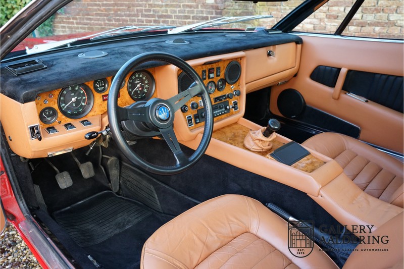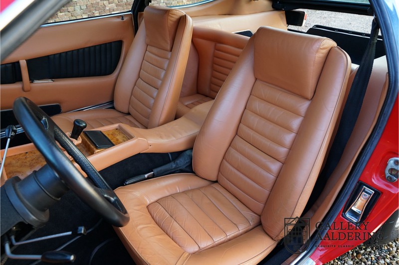 finish she has today. The accompanying Maserati certificate shows the car initially had a “Celeste Chiaro” exterior and a “Senape” Conolly” leather interior trim. Already a stunning car to behold the sporty red colour show off the Khamsin’s sporty lines just that little bit than the light blue finish. The lovely bodywork is in great shape with straight and correctly aligned panelwork. The chrome brightwork is in fine condition. The leather clad interior is also in great shape. The leather has been very well preserved and is lovely and supple. The black carpets also look great. The dashboard top is clad in black alcantara, preventing nuisance window glare whilst driving. The car has always been very well maintained and as a consequence drives a treat. Recently new brakes and suspension rubbers have been fitted and the shock breakers have been refurbished. The engine runs fantastically and has ample power over the whole range. The engine is coupled to a manual ZF gearbox delivering well-known precision and fine gear ratios. Thanks to the recent work carried out to the brakes and suspension amongst others this Grand Tourer has impeccable roadholding manners. The car comes with an extensive documentation file including the earlier mentioned Maserati certificate, the original owner’s manual, a workshop manual, an original brochure and lots of correspondence relating to the car going back to 1975! This is without doubt a gorgeous Maserati Khamsin with a fetching finish and in good condition. Gallery Aaldering is Europe’s leading Classic Cars specialist since 1975! Always 400 Classic and Sportscars in stock, please visit www.gallery-aaldering.com for the current stock list (all offered cars are available in our showroom) and further information. We are located near the German border, 95 km from Düsseldorf and 90 km from Amsterdam. So easy traveling by plane, train, taxi and car. Transport and worldwide shipping can be arranged. No duties/import costs within Europe. We buy, sell and provide consignment sales (selling on behalf of the owner). We can arrange/provide registration/papers for our German (H-Kennzeichen, TÜV, Fahrzeugbrief, Wertgutachten usw.) and Benelux customers. Gallery Aaldering, Arnhemsestraat 47, 6971 AP Brummen, The Netherlands. Tel: 0031-575-564055. Quality, experience and transparency is what sets us apart. We look forward to welcoming you in our showroom