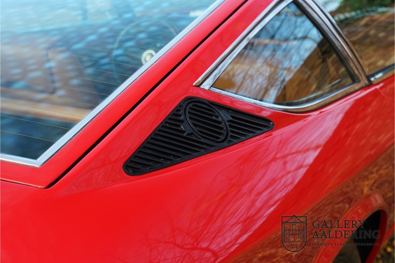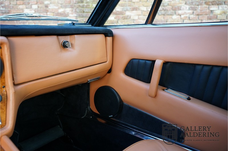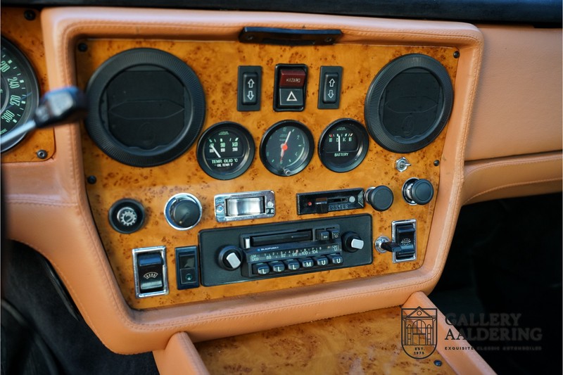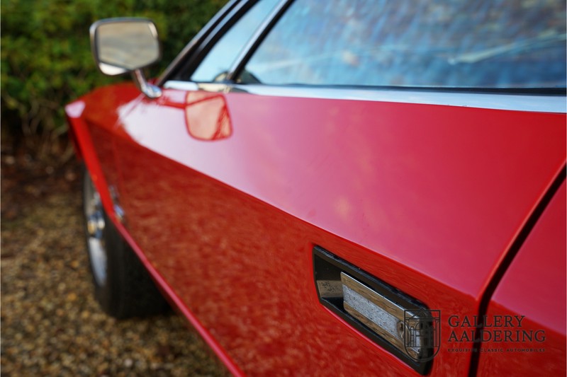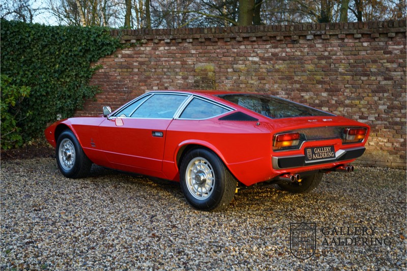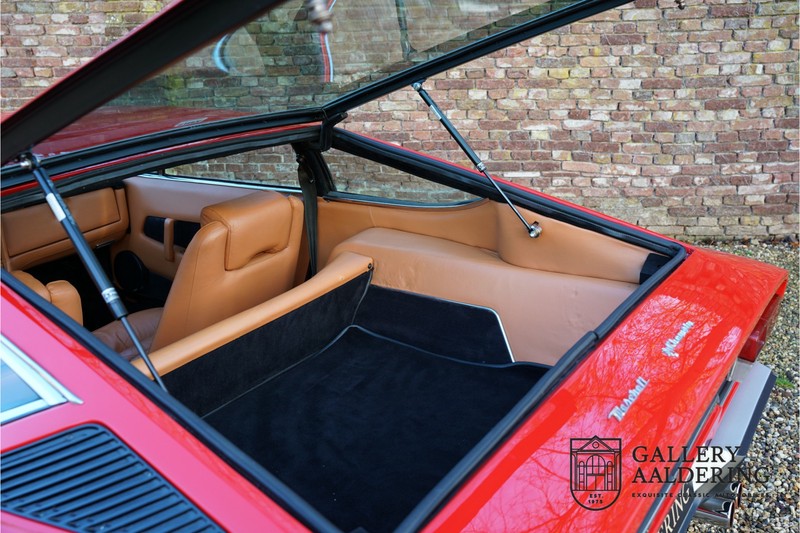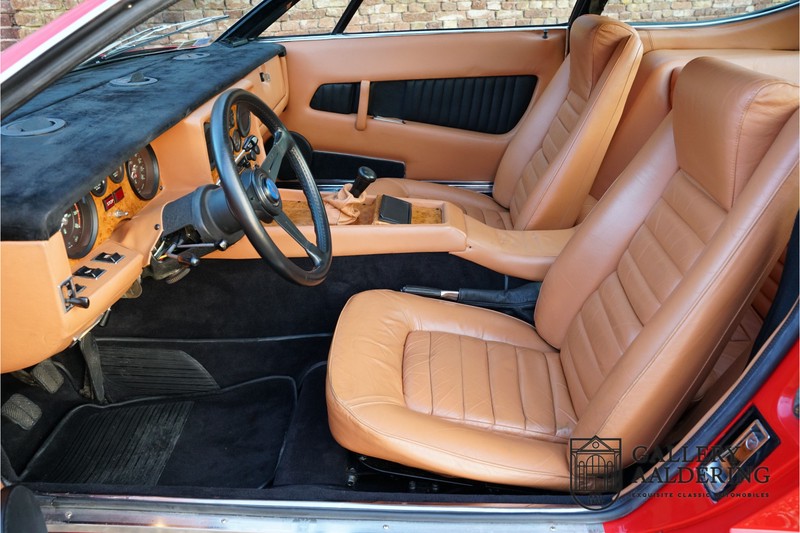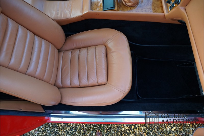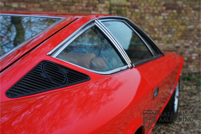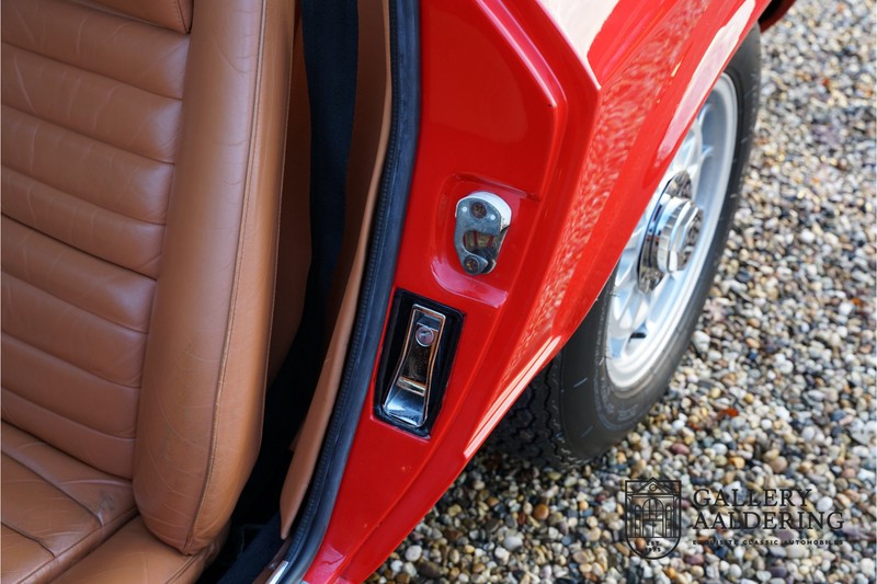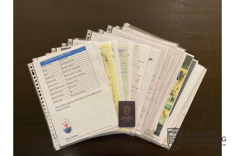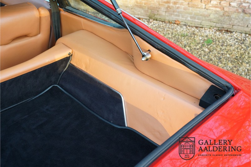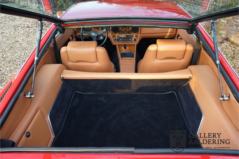 finish she has today. The accompanying Maserati certificate shows the car initially had a “Celeste Chiaro” exterior and a “Senape” Conolly” leather interior trim. Already a stunning car to behold the sporty red colour show off the Khamsin’s sporty lines just that little bit than the light blue finish. The lovely bodywork is in great shape with straight and correctly aligned panelwork. The chrome brightwork is in fine condition. The leather clad interior is also in great shape. The leather has been very well preserved and is lovely and supple. The black carpets also look great. The dashboard top is clad in black alcantara, preventing nuisance window glare whilst driving. The car has always been very well maintained and as a consequence drives a treat. Recently new brakes and suspension rubbers have been fitted and the shock breakers have been refurbished. The engine runs fantastically and has ample power over the whole range. The engine is coupled to a manual ZF gearbox delivering well-known precision and fine gear ratios. Thanks to the recent work carried out to the brakes and suspension amongst others this Grand Tourer has impeccable roadholding manners. The car comes with an extensive documentation file including the earlier mentioned Maserati certificate, the original owner’s manual, a workshop manual, an original brochure and lots of correspondence relating to the car going back to 1975! This is without doubt a gorgeous Maserati Khamsin with a fetching finish and in good condition. Gallery Aaldering is Europe’s leading Classic Cars specialist since 1975! Always 400 Classic and Sportscars in stock, please visit www.gallery-aaldering.com for the current stock list (all offered cars are available in our showroom) and further information. We are located near the German border, 95 km from Düsseldorf and 90 km from Amsterdam. So easy traveling by plane, train, taxi and car. Transport and worldwide shipping can be arranged. No duties/import costs within Europe. We buy, sell and provide consignment sales (selling on behalf of the owner). We can arrange/provide registration/papers for our German (H-Kennzeichen, TÜV, Fahrzeugbrief, Wertgutachten usw.) and Benelux customers. Gallery Aaldering, Arnhemsestraat 47, 6971 AP Brummen, The Netherlands. Tel: 0031-575-564055. Quality, experience and transparency is what sets us apart. We look forward to welcoming you in our showroom