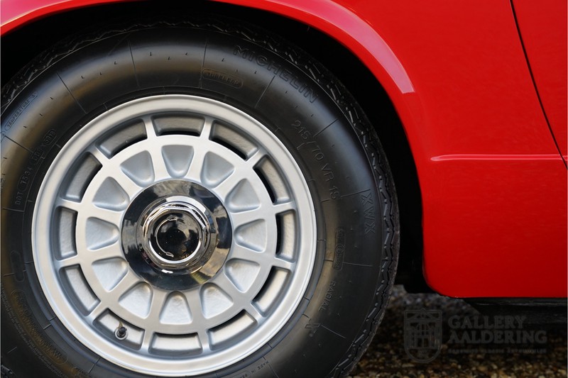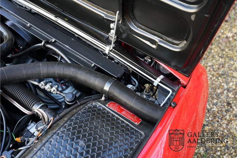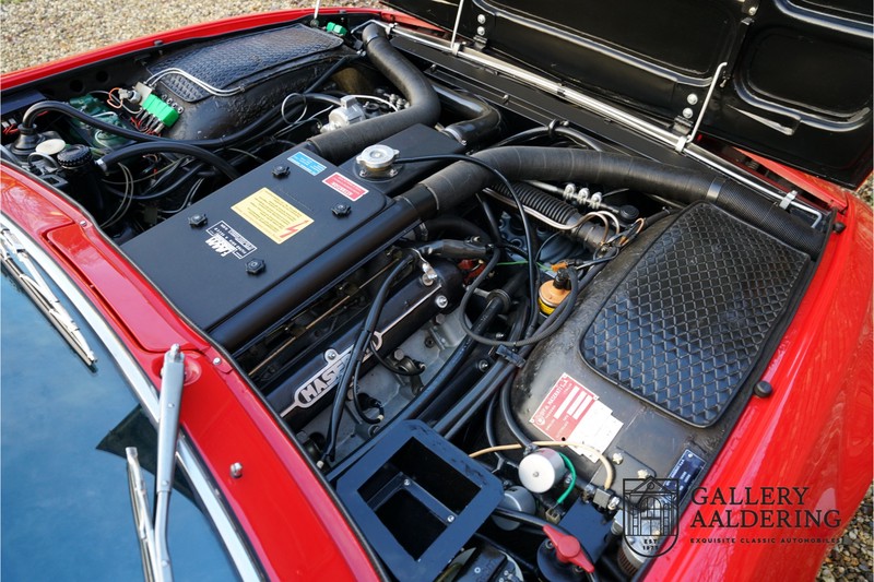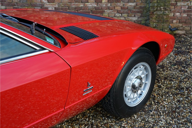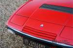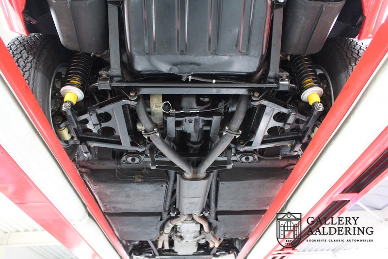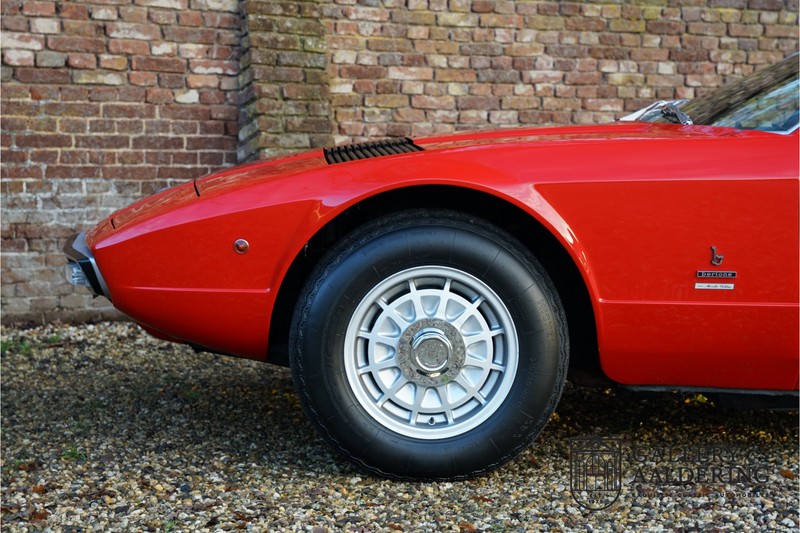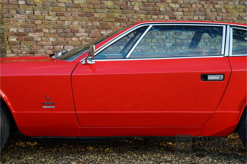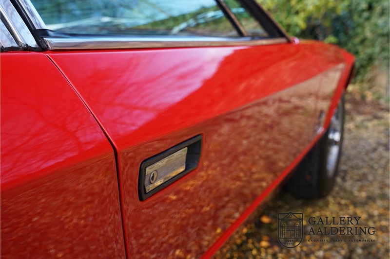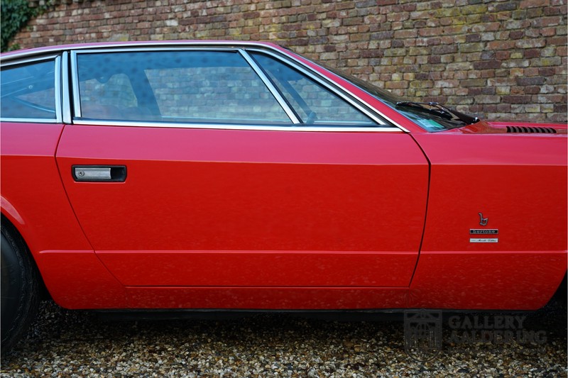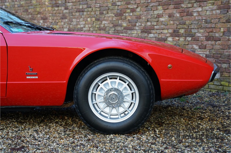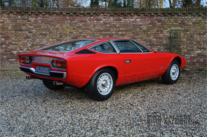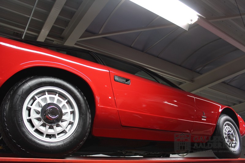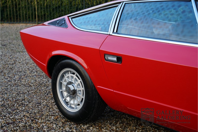 finish she has today. The accompanying Maserati certificate shows the car initially had a “Celeste Chiaro” exterior and a “Senape” Conolly” leather interior trim. Already a stunning car to behold the sporty red colour show off the Khamsin’s sporty lines just that little bit than the light blue finish. The lovely bodywork is in great shape with straight and correctly aligned panelwork. The chrome brightwork is in fine condition. The leather clad interior is also in great shape. The leather has been very well preserved and is lovely and supple. The black carpets also look great. The dashboard top is clad in black alcantara, preventing nuisance window glare whilst driving. The car has always been very well maintained and as a consequence drives a treat. Recently new brakes and suspension rubbers have been fitted and the shock breakers have been refurbished. The engine runs fantastically and has ample power over the whole range. The engine is coupled to a manual ZF gearbox delivering well-known precision and fine gear ratios. Thanks to the recent work carried out to the brakes and suspension amongst others this Grand Tourer has impeccable roadholding manners. The car comes with an extensive documentation file including the earlier mentioned Maserati certificate, the original owner’s manual, a workshop manual, an original brochure and lots of correspondence relating to the car going back to 1975! This is without doubt a gorgeous Maserati Khamsin with a fetching finish and in good condition. Gallery Aaldering is Europe’s leading Classic Cars specialist since 1975! Always 400 Classic and Sportscars in stock, please visit www.gallery-aaldering.com for the current stock list (all offered cars are available in our showroom) and further information. We are located near the German border, 95 km from Düsseldorf and 90 km from Amsterdam. So easy traveling by plane, train, taxi and car. Transport and worldwide shipping can be arranged. No duties/import costs within Europe. We buy, sell and provide consignment sales (selling on behalf of the owner). We can arrange/provide registration/papers for our German (H-Kennzeichen, TÜV, Fahrzeugbrief, Wertgutachten usw.) and Benelux customers. Gallery Aaldering, Arnhemsestraat 47, 6971 AP Brummen, The Netherlands. Tel: 0031-575-564055. Quality, experience and transparency is what sets us apart. We look forward to welcoming you in our showroom