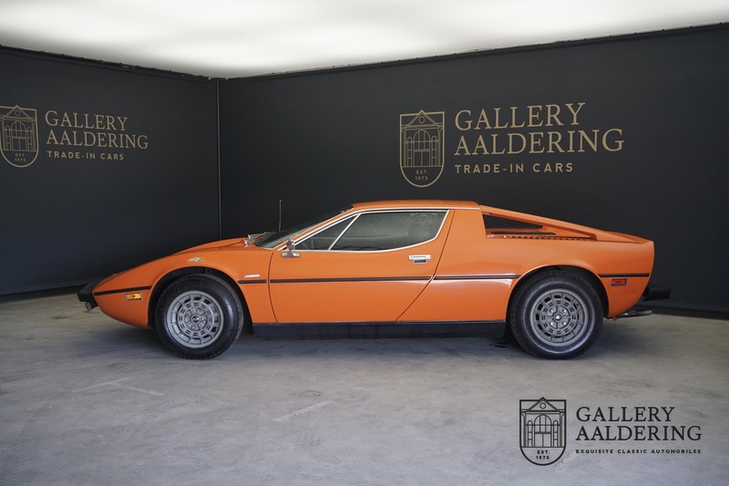 Maserati Merak. Our car is a Maserati Merak 3000. It has its original ‘Arancione’ finish with black leather interior trim. Produced on the 28th November 1974 it was first registered in California in 1975. This very authentic Merak 3.0 is in excellent solid and sound condition! It has only clocked up 28,035 true miles and which is reflected in the car’s condition in a positive sense! The bodywork is very authentic and exceptionally solid. It has correctly aligned shut lines and in the main stands in its first coat of paint, which could do with a re-spray to enhance its appearance. All the body panels are original and rust-free. The underbody is original and perfect and will only need cosmetic attention and certainly will not need restoring. It has a lovely, fully original interior, the black leather is in good condition together with the original carpets, dashboard covering and headliner and so forth. On the mechanical side this car was still being driven when it was put into storage 10 years ago, the engine removed. All mechanical aspect appear to be in good order awaiting to be reassembled and serviced after this long period of inactivity. Of importance is the presence of all the well-preserved brightwork and plastics. It also still has its original rims. This Merak has its, original, matching numbers engine. For the enthusiast this car represents a very attractive and feasible project, we have seldom come across such a complete and solid example., Considering its original finish, matching numbers and relatively small amount of manageable work needed, all ingredients are present bring this Merak up to a top-quality standard. Gallery Aaldering is Europe’s leading Classic Cars specialist since 1975! Always 300-350 Classic and Sportscars in stock, please visit www.gallery-aaldering.com for the current stock list (all offered cars are available in our showroom) and further information. We are located near the German border, 95 km from Düsseldorf and 90 km from Amsterdam. So easy traveling by plane, train, taxi and car. Transport and worldwide shipping can be arranged. No duties/import costs within Europe. We buy, sell and provide consignment sales (selling on behalf of the owner). We can arrange/provide registration/papers for our German (H-Kennzeichen, TÜV, Fahrzeugbrief, Wertgutachten usw.) and Benelux customers. Gallery Aaldering, Arnhemsestraat 47, 6971 AP Brummen, The Netherlands. Tel: 0031-575-564055. Quality, experience and transparency is what sets us apart. We look forward to welcoming you in our showroom