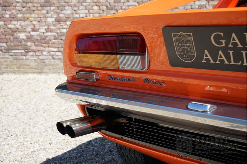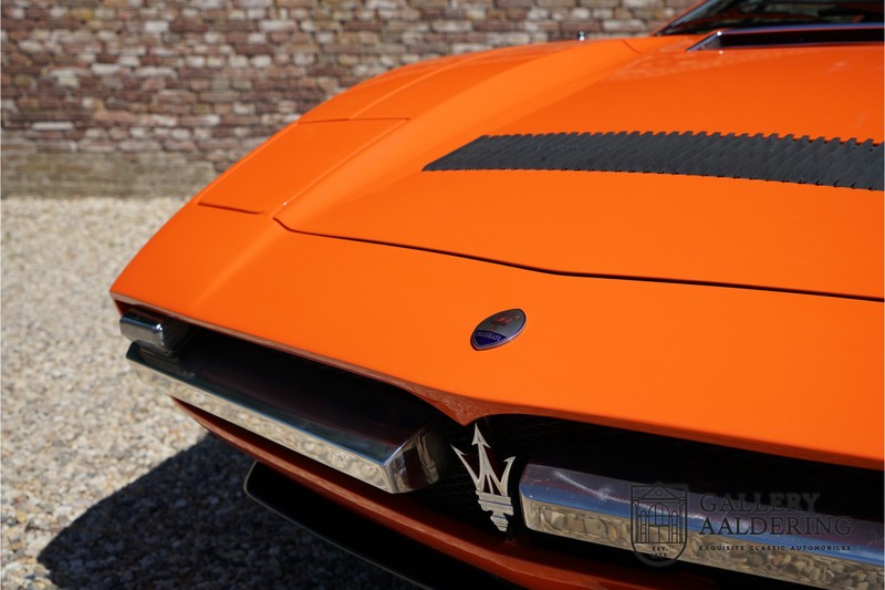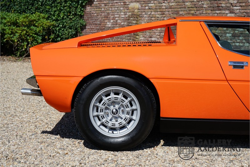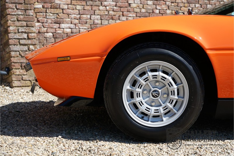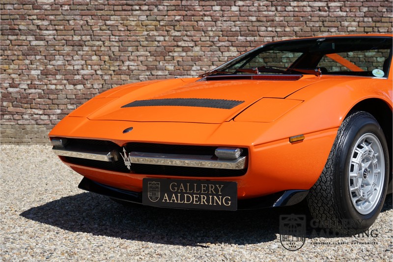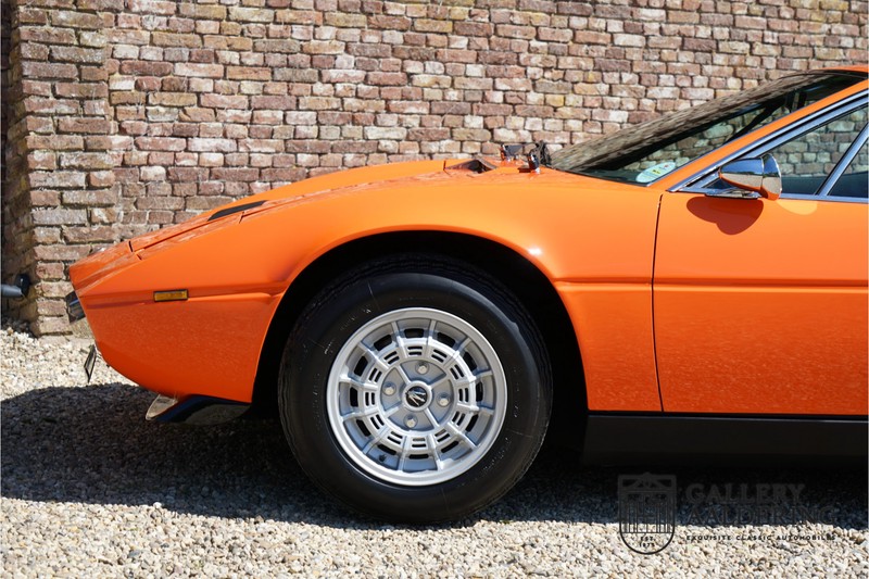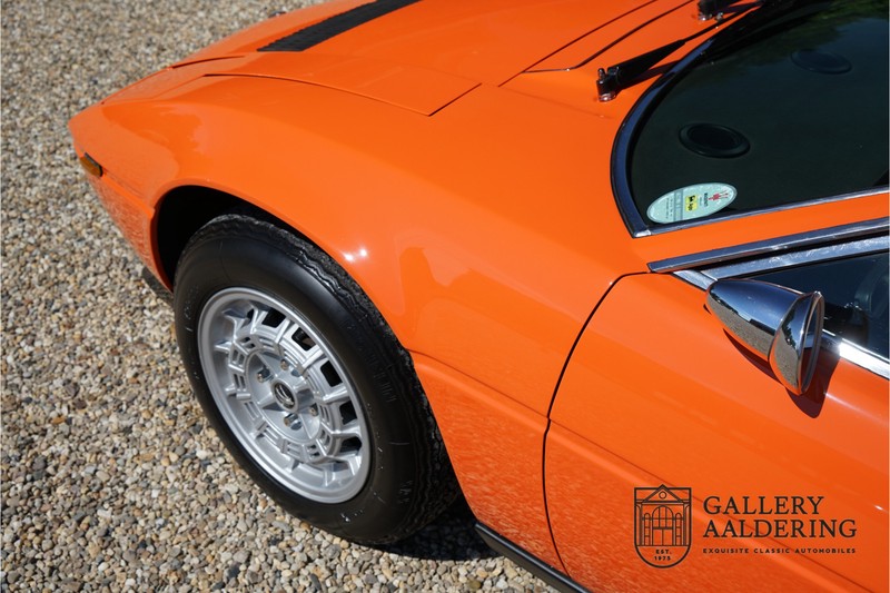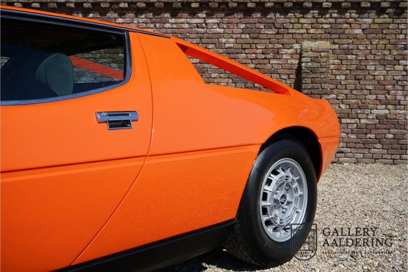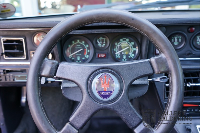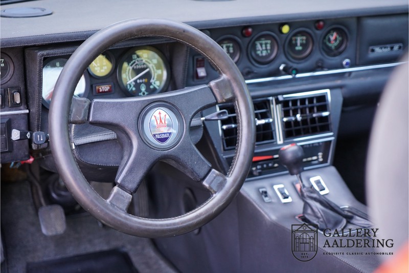 Fraaie Maserati Merak 3000 SS. Dit exemplaar rolde op 1 september 1976 uit de fabriek en is nieuw geleverd in België. Het betreft hier de snellere en zeldzame SS versie. De SS versie is ten opzichte van de normale Merak 50 kg lichter en heeft 30 pk meer. Dit komt de prestaties natuurlijk zeker ten goede. Van de SS versie zijn slechts 1.000 exemplaren geproduceerd. Ook is de SS herkenbaar aan het 4-spaaks stuurwiel en de zwarte grille tussen de klapkoplampen. Deze Merak is afkomstig uit een Maserati verzameling en werd altijd uitstekend behouden/onderhouden. In het verleden gerestaureerd met behoud van de originele details. Zo is het ‘Dark Grey Velvet’ interieur compleet origineel en verkeert in een verzorgde staat. De carrosserie is keurig, heeft mooi plaatwerk en goed lakwerk. De Merak beschikt over haar originele, matching numbers motor. Kortom, een fraaie Maserati met Italdesign-Giugiaro carrosserie.