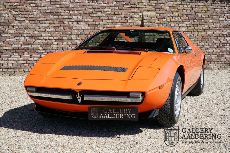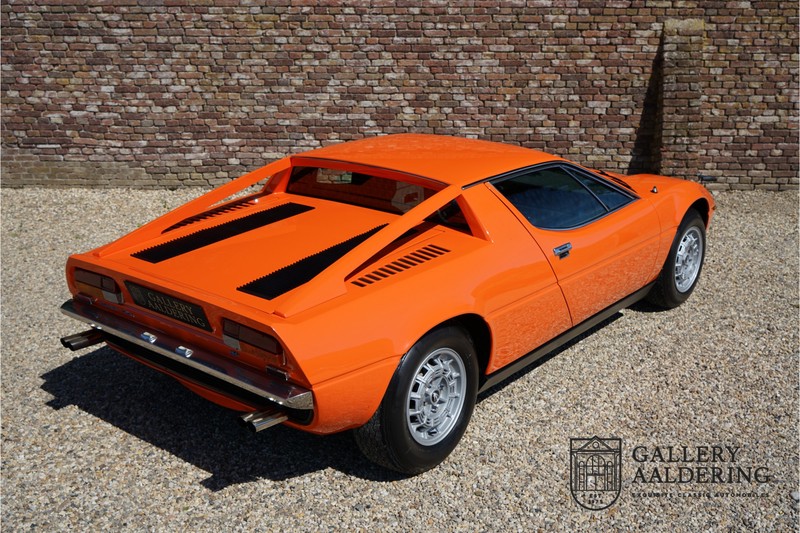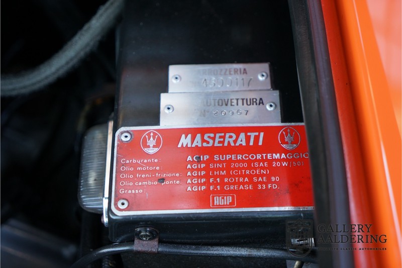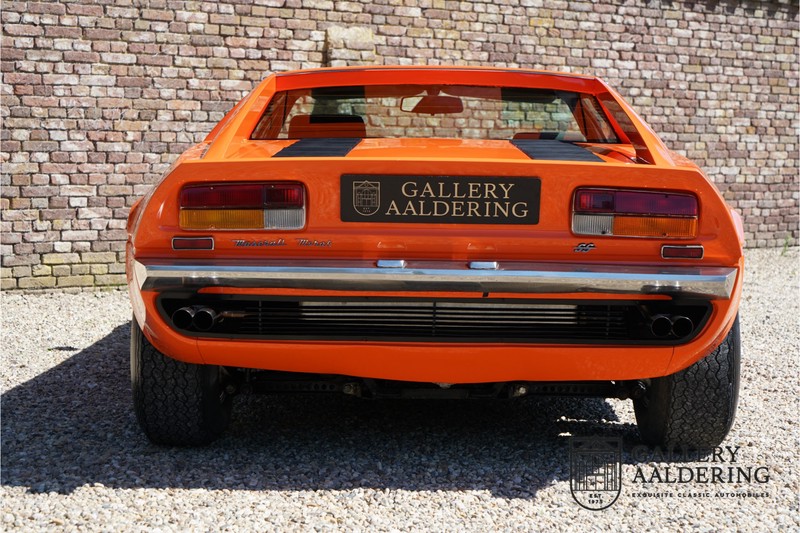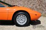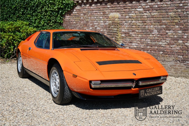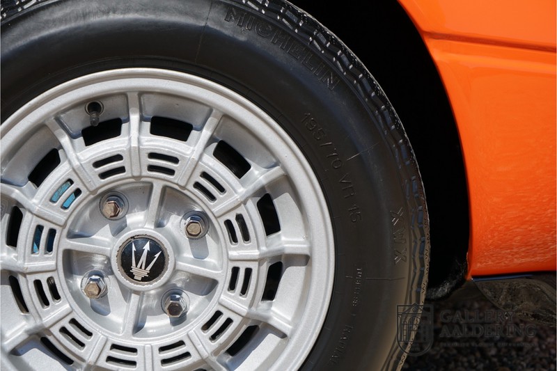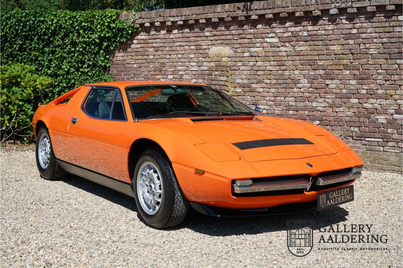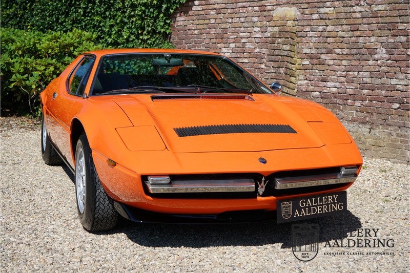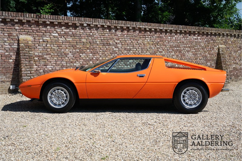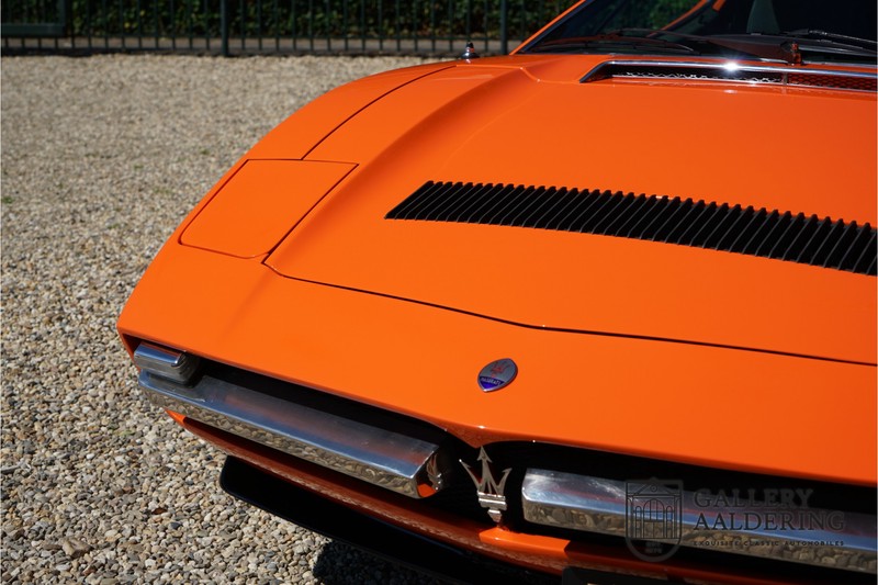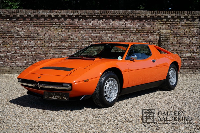 Fraaie Maserati Merak 3000 SS. Dit exemplaar rolde op 1 september 1976 uit de fabriek en is nieuw geleverd in België. Het betreft hier de snellere en zeldzame SS versie. De SS versie is ten opzichte van de normale Merak 50 kg lichter en heeft 30 pk meer. Dit komt de prestaties natuurlijk zeker ten goede. Van de SS versie zijn slechts 1.000 exemplaren geproduceerd. Ook is de SS herkenbaar aan het 4-spaaks stuurwiel en de zwarte grille tussen de klapkoplampen. Deze Merak is afkomstig uit een Maserati verzameling en werd altijd uitstekend behouden/onderhouden. In het verleden gerestaureerd met behoud van de originele details. Zo is het ‘Dark Grey Velvet’ interieur compleet origineel en verkeert in een verzorgde staat. De carrosserie is keurig, heeft mooi plaatwerk en goed lakwerk. De Merak beschikt over haar originele, matching numbers motor. Kortom, een fraaie Maserati met Italdesign-Giugiaro carrosserie.