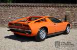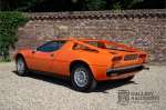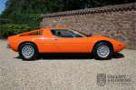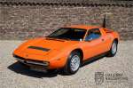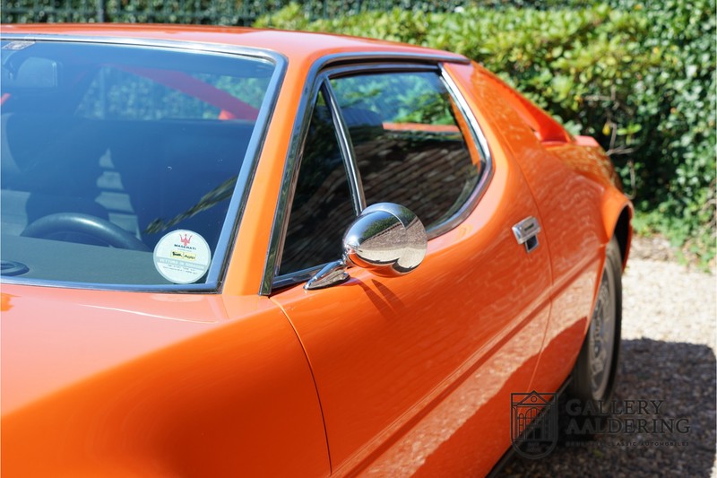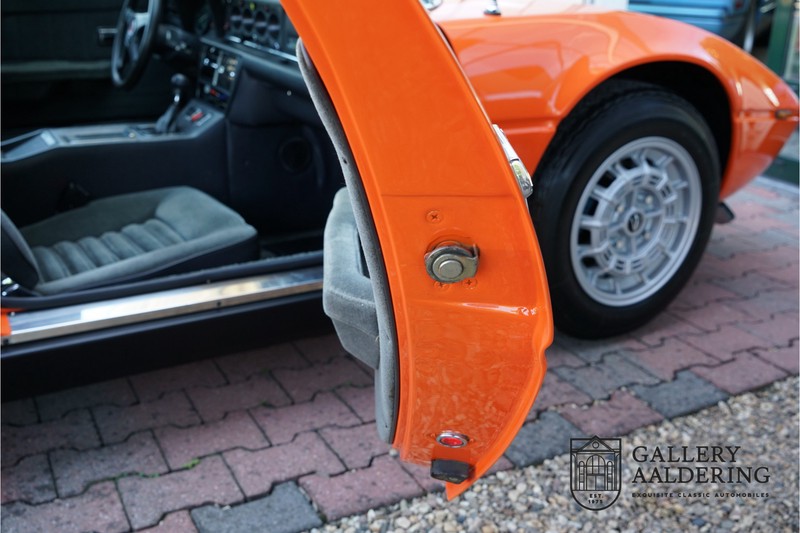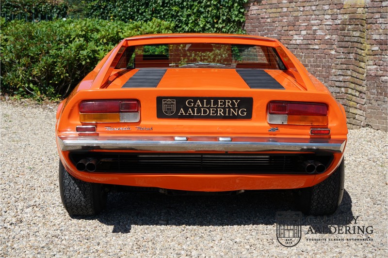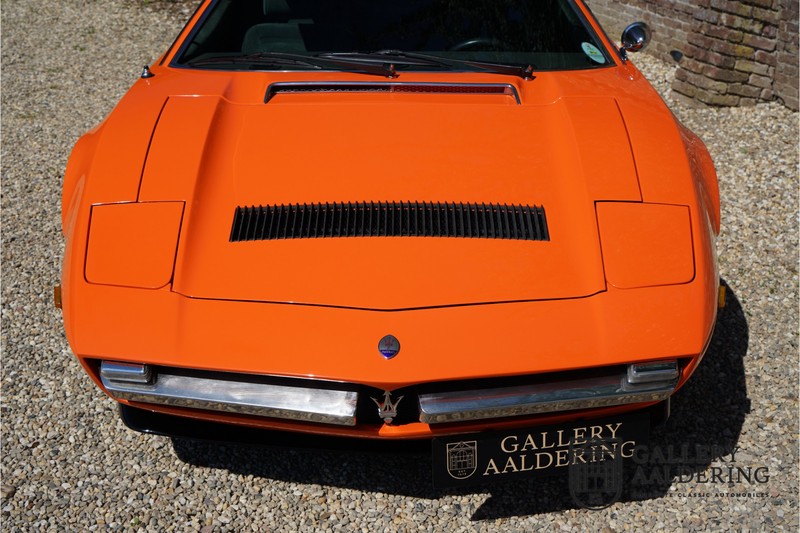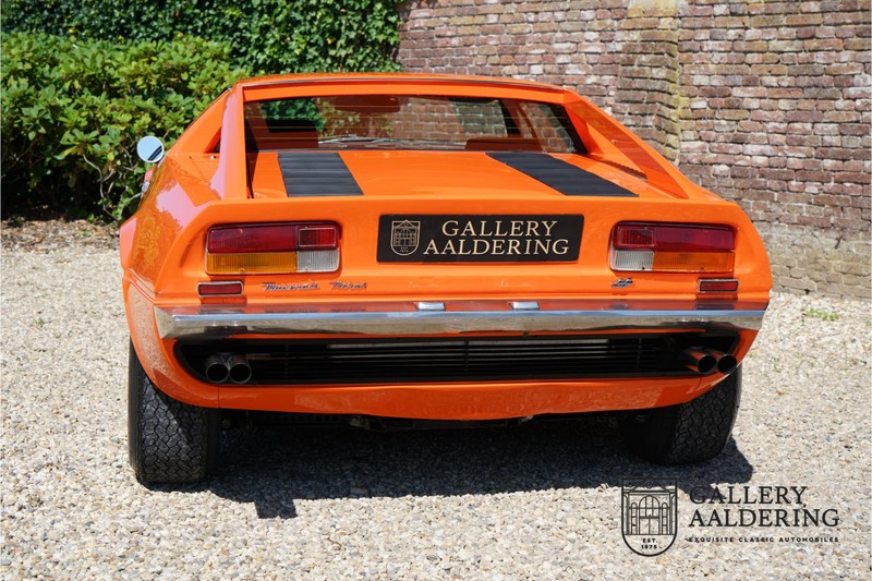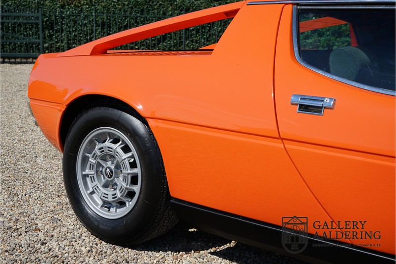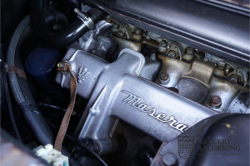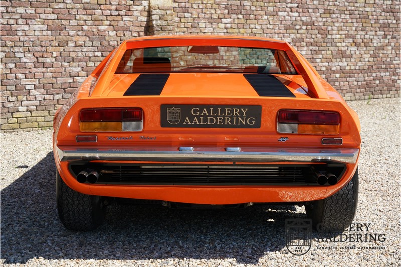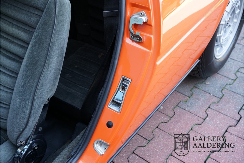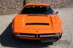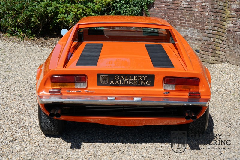 Fraaie Maserati Merak 3000 SS. Dit exemplaar rolde op 1 september 1976 uit de fabriek en is nieuw geleverd in België. Het betreft hier de snellere en zeldzame SS versie. De SS versie is ten opzichte van de normale Merak 50 kg lichter en heeft 30 pk meer. Dit komt de prestaties natuurlijk zeker ten goede. Van de SS versie zijn slechts 1.000 exemplaren geproduceerd. Ook is de SS herkenbaar aan het 4-spaaks stuurwiel en de zwarte grille tussen de klapkoplampen. Deze Merak is afkomstig uit een Maserati verzameling en werd altijd uitstekend behouden/onderhouden. In het verleden gerestaureerd met behoud van de originele details. Zo is het ‘Dark Grey Velvet’ interieur compleet origineel en verkeert in een verzorgde staat. De carrosserie is keurig, heeft mooi plaatwerk en goed lakwerk. De Merak beschikt over haar originele, matching numbers motor. Kortom, een fraaie Maserati met Italdesign-Giugiaro carrosserie.