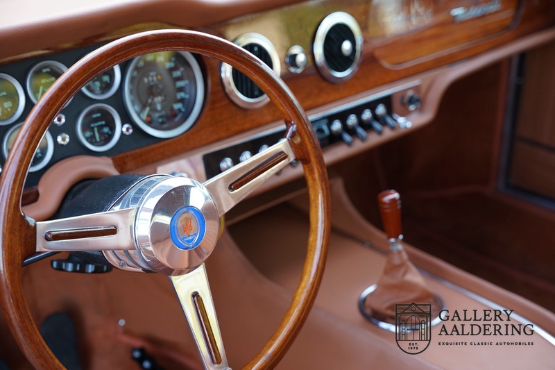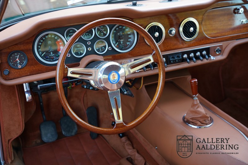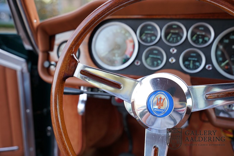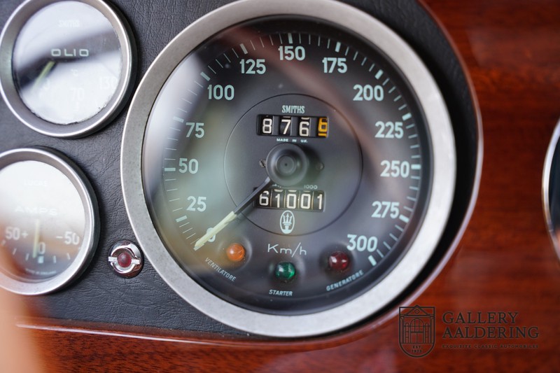 A Maserati specialist took care of the rebuilding all things mechanic in 2016. Every gasket, ball bearing and hose was replaced. As a result the engine runs smoothly and is very powerful. The V8 engine is as want with the Mexico attached to a manual ZF 5-speed transmission. Both brakes and suspension work exactly as you would expect from this large Italian “Gran Tourer”. The driving characteristic of the Maserati Mexico is intended to convey you effortlessly over large distances. You will step out of the car after travelling from Holland to Italy as fresh as a daisy. You are also accompanied by the sonorous exhaust notes emanating form that gorgeous V8, which in this case is the very same one it left the factory with.
