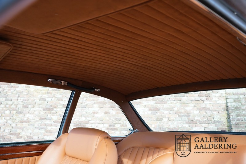 Das Interieur wurde 2015 und 2016 komplett mit diesem schönen braunen Leder bezogen. Die Teppiche sind aus Velourswolle und sehen wunderschön aus. Die Arbeiten hatten ein sehr hohes Niveau und das Interieur sieht daher immer noch sehr schön aus. Das Auto wurde seitdem nicht viel benutzt, denn auch das schöne braune Leder auf den Sitzen befindet sich ebenfalls in einem neuwertigen Zustand. Bei der Restaurierung wurden auch die Chromleisten im Innenraum neu aufgebracht und das Holz am Armaturenbrett wurde neu lackiert. Die Instrumente und Bedienelemente funktionieren natürlich alle wie sie sollen und auch der Schalthebel lässt sich präzise bedienen. Der Kofferraum ist mindestens genauso schön bekleidet wie der Rest vom Interieur. Es ist einmal mehr ein Maßstab für die Art und Weise, wie der Polsterer an diesem Auto gearbeitet hat. Eine Restaurierung auf diesem Niveau wäre natürlich nicht vollständig, wenn auch der Dachhimmel nicht auch so ein Topniveau gehabt hätte.