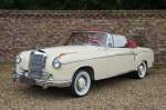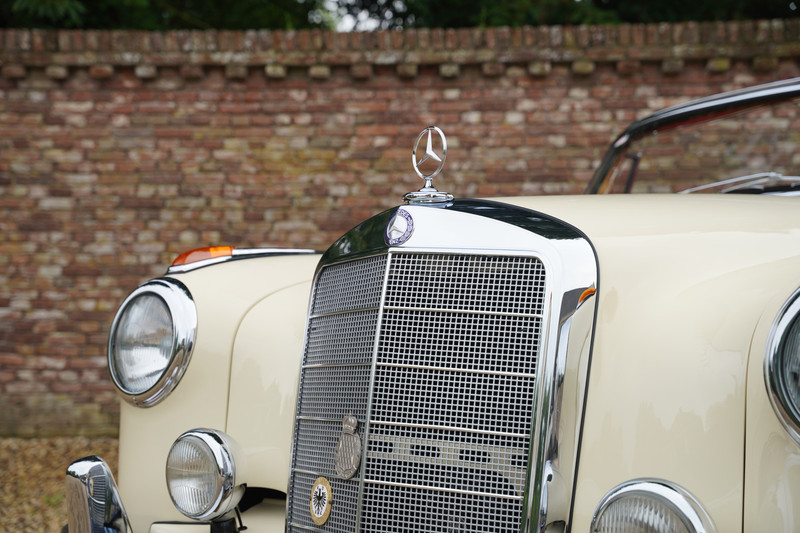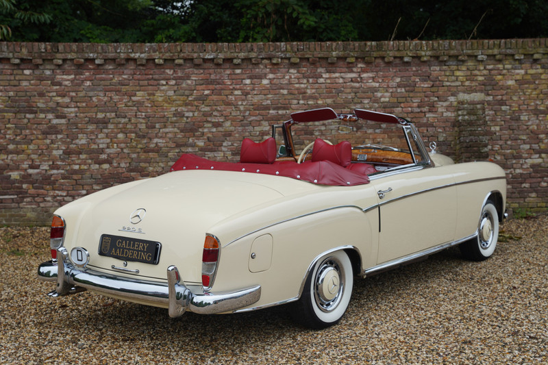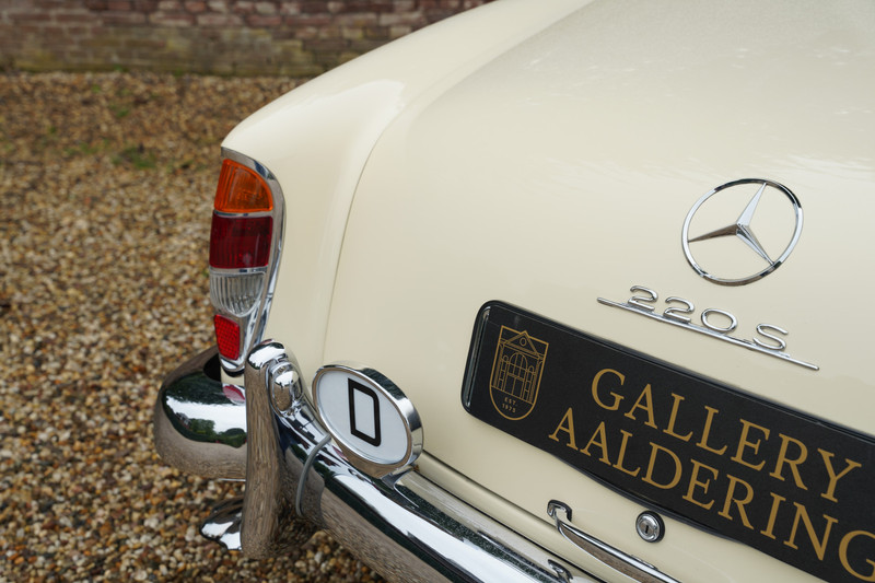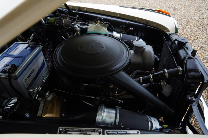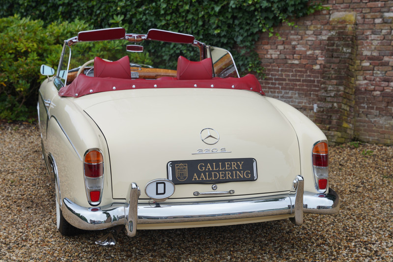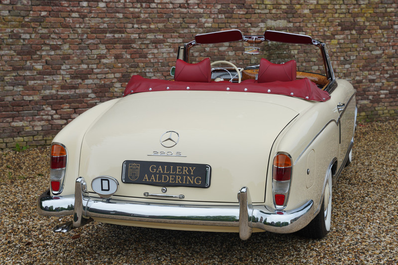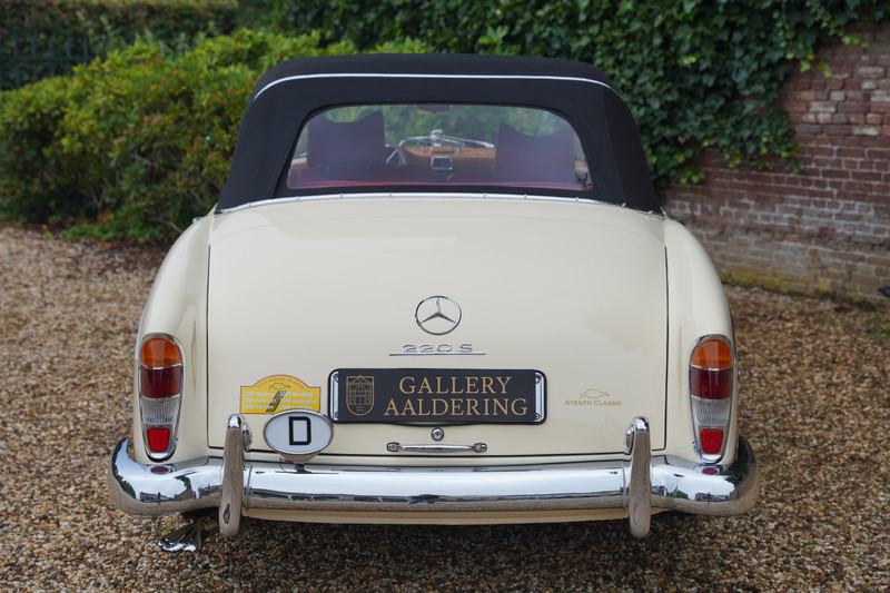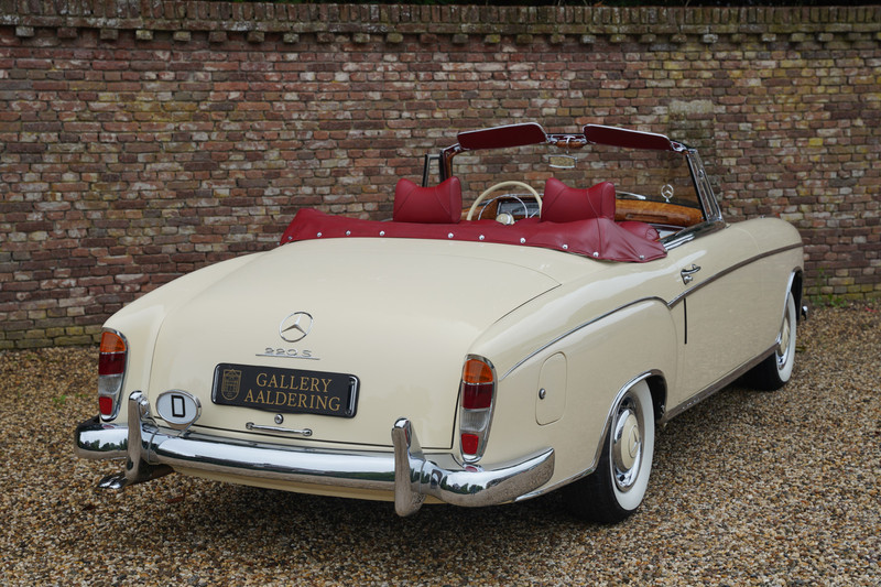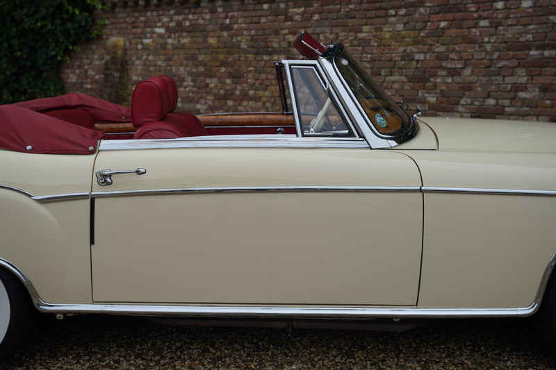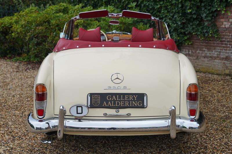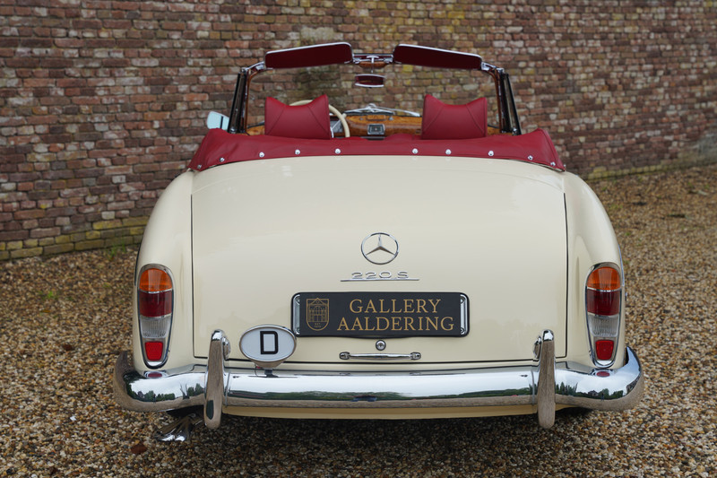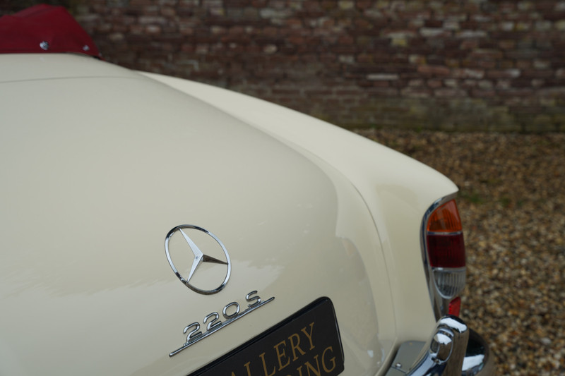 Uit de bijhorende documentatie en rekeningen welke wij in ons bezit hebben leert men dat er zorgvuldig voor is gezorgd en periodiek zijn onderhoud heeft genoten. De Mercedes staat op keurige zomer banden van het merk Goodrich in de juiste maten. Wat betreft het interieur welke luxe en weelde uitstraalt in het prachtige rood wat schitterend overeenkomt met de carrosserie kleur crème, zien wij geen enkele gebreken en functioneren alle instrumenten en is de Mercedes voorzien van een Halda tripmaster en zijn originele Becker radio. Kortom een unieke Mercedes-Benz 220S in een prachtige kleurstelling.