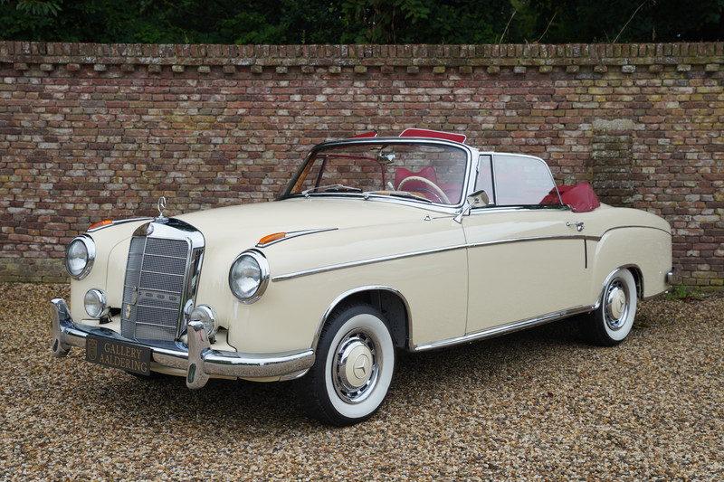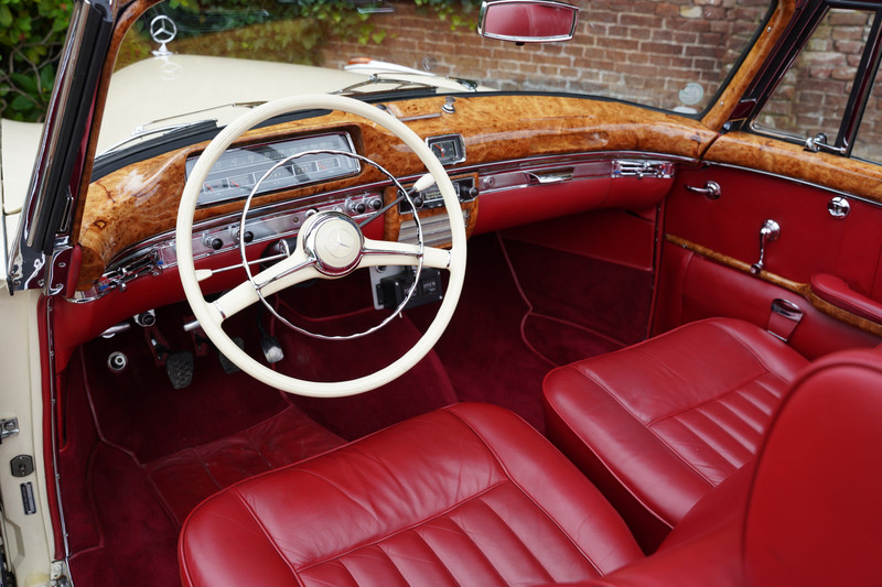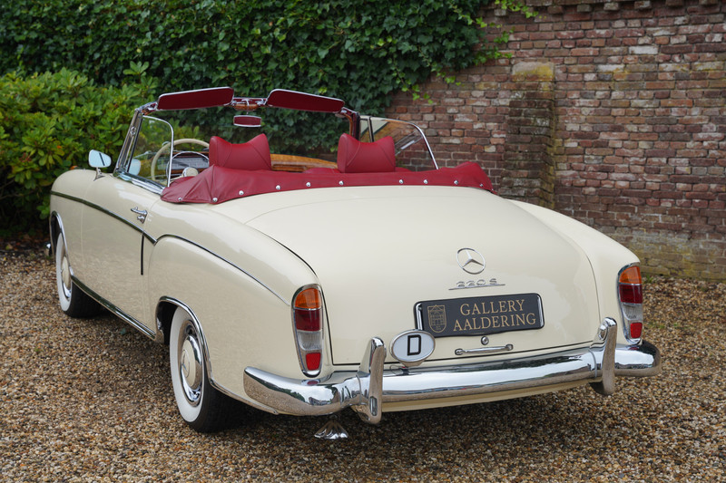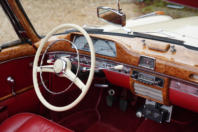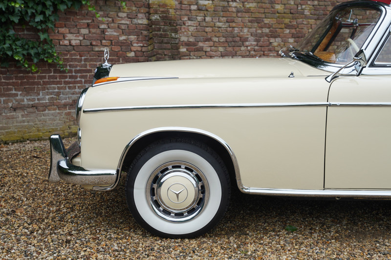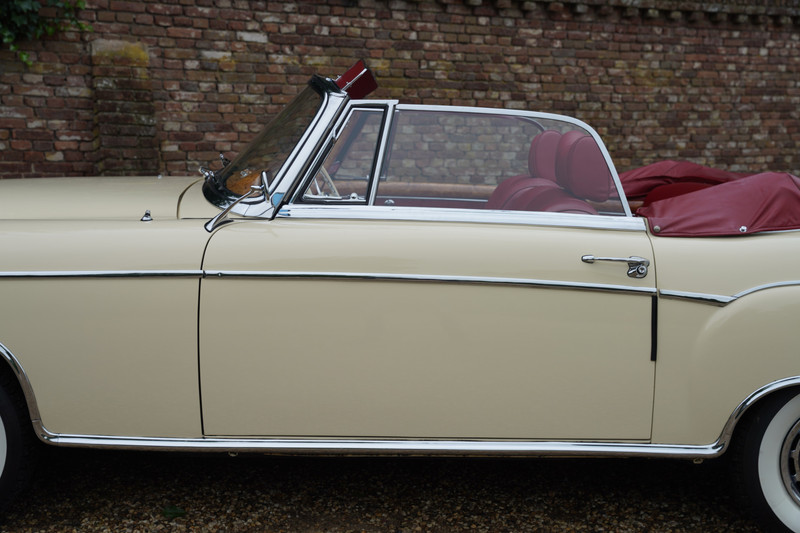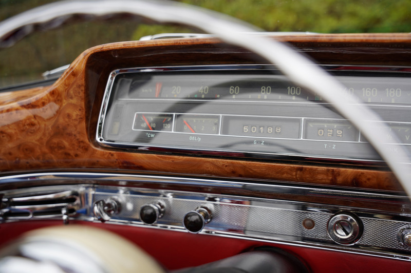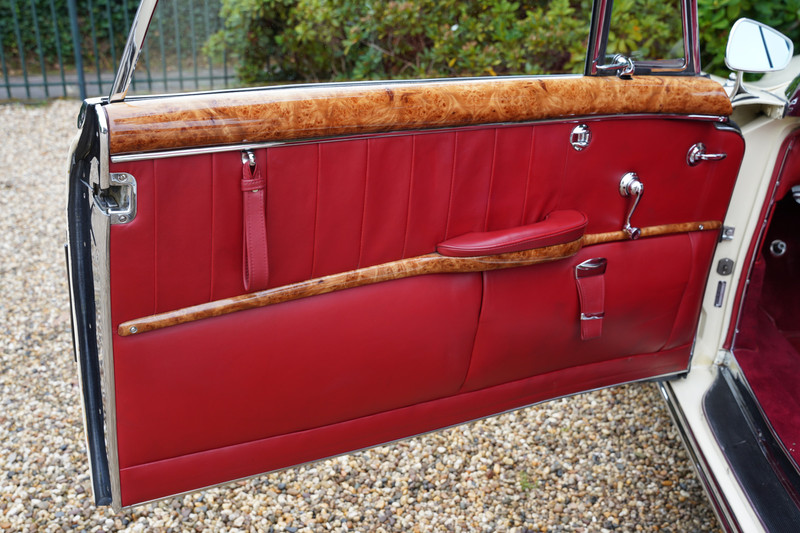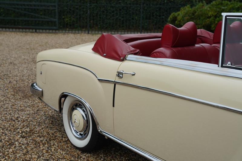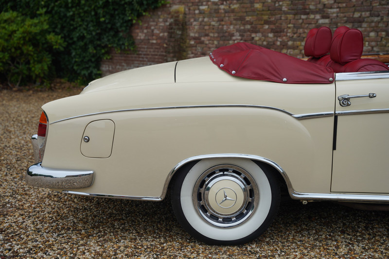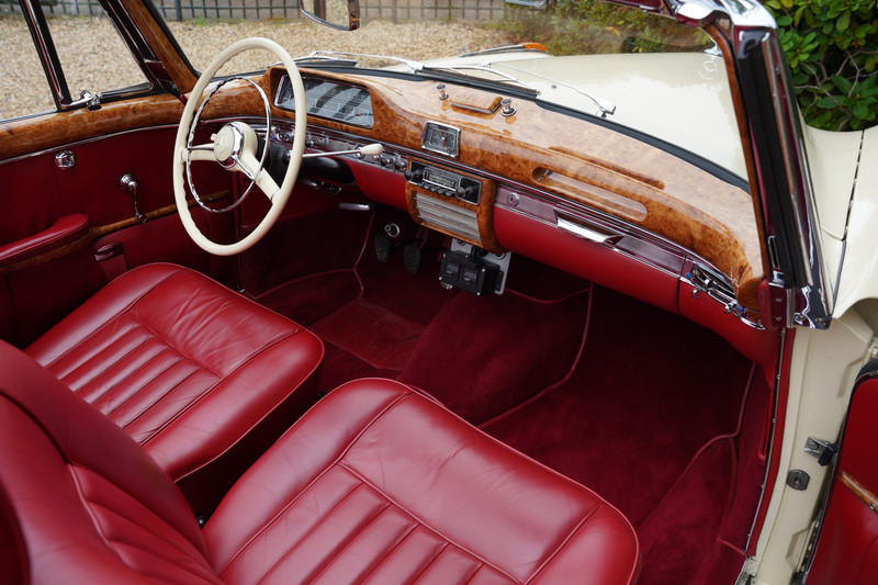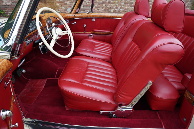From the accompanying documentation and invoices that we have in our possession, one learns that it has been carefully cared for and has received periodic maintenance. The Mercedes is on neat summer tires from the Goodrich brand in the right sizes. As for the interior which exudes luxury and opulence in the beautiful red which matches the body color cream beautifully, we see no flaws and all instruments function and the Mercedes is equipped with a Halda tripmaster and its original Becker radio. In short, a unique Mercedes-Benz 220S in a beautiful color scheme.