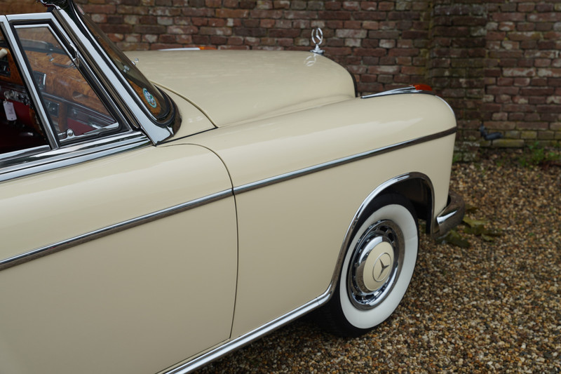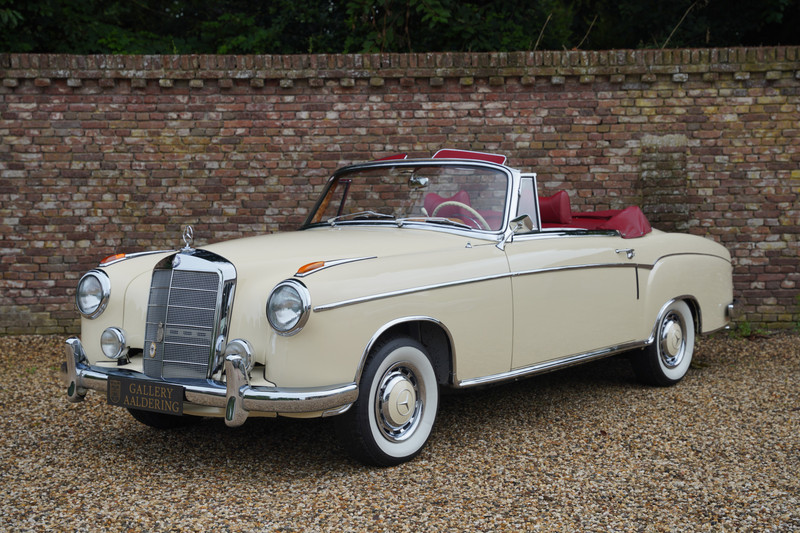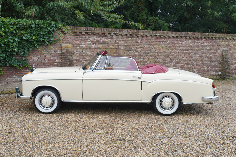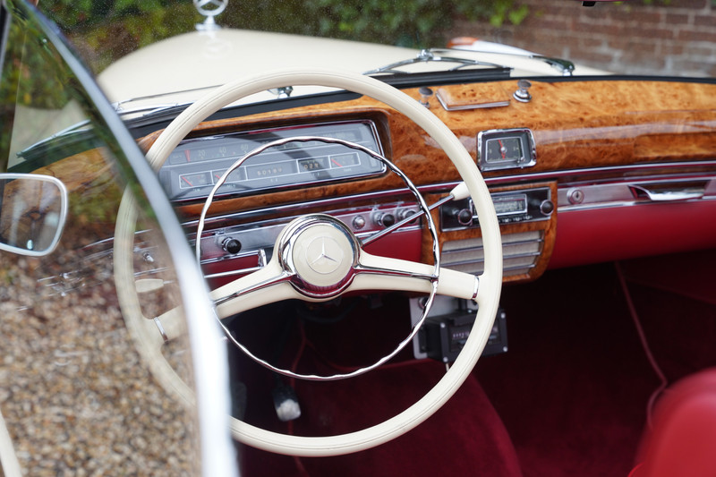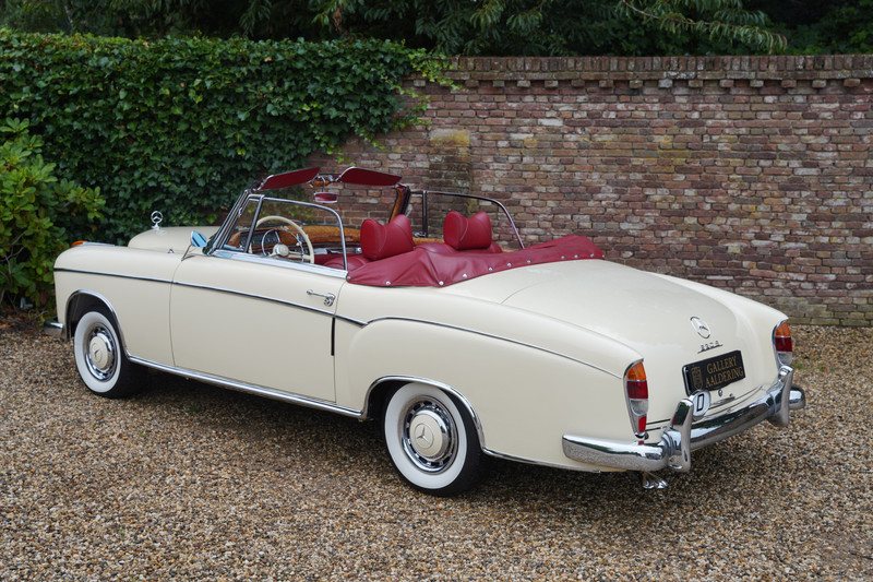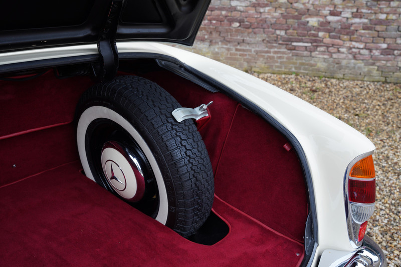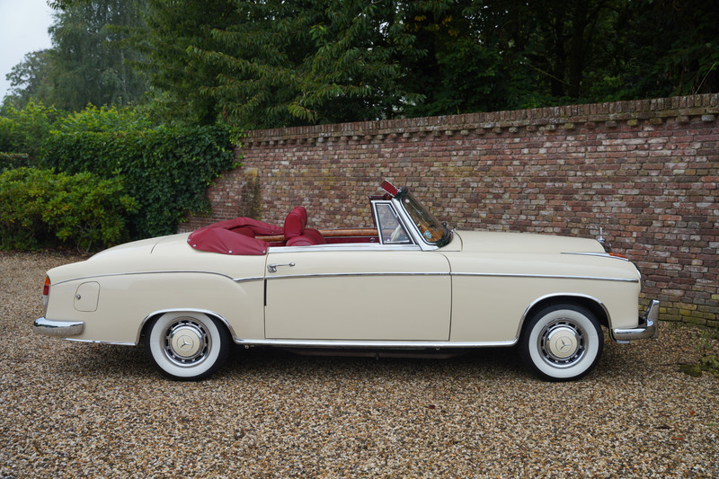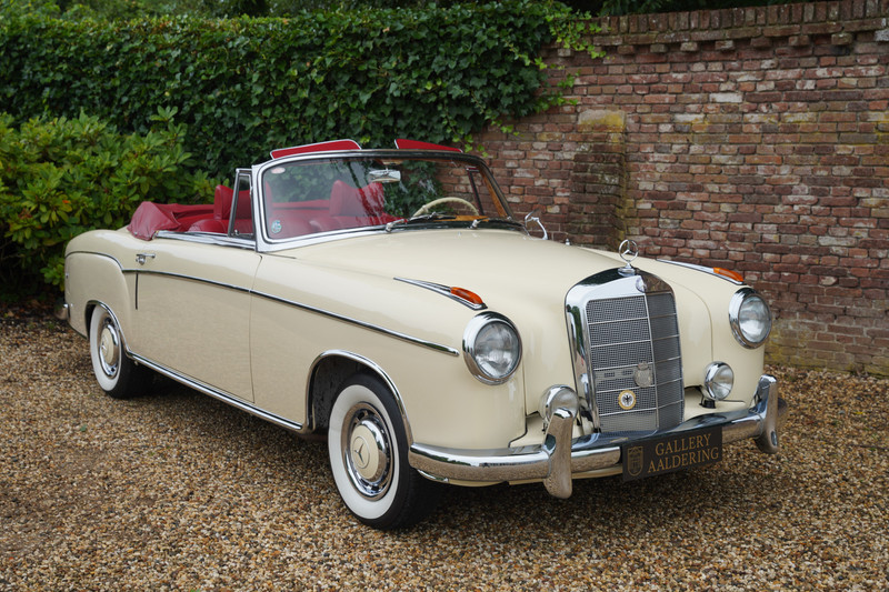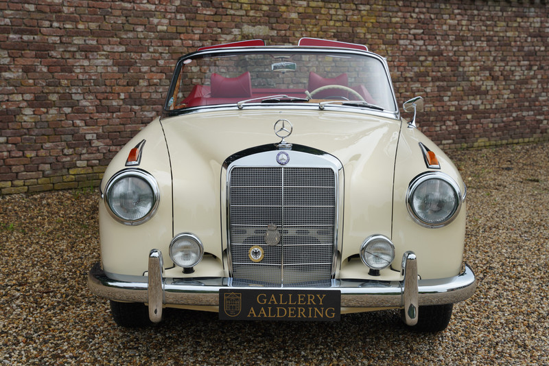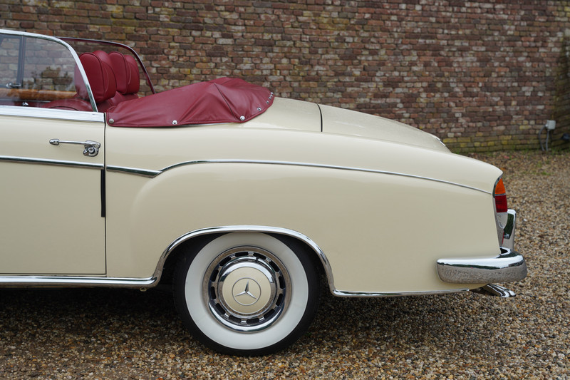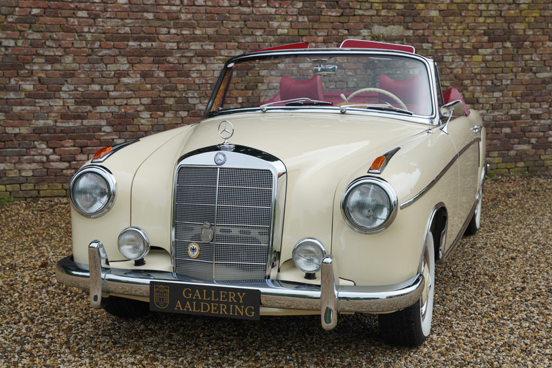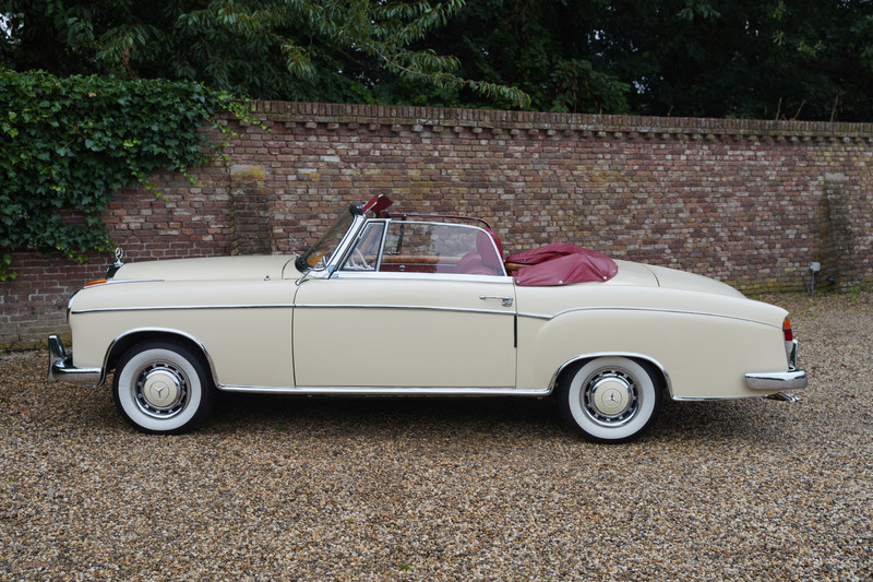From the accompanying documentation and invoices that we have in our possession, one learns that it has been carefully cared for and has received periodic maintenance. The Mercedes is on neat summer tires from the Goodrich brand in the right sizes. As for the interior which exudes luxury and opulence in the beautiful red which matches the body color cream beautifully, we see no flaws and all instruments function and the Mercedes is equipped with a Halda tripmaster and its original Becker radio. In short, a unique Mercedes-Benz 220S in a beautiful color scheme.