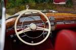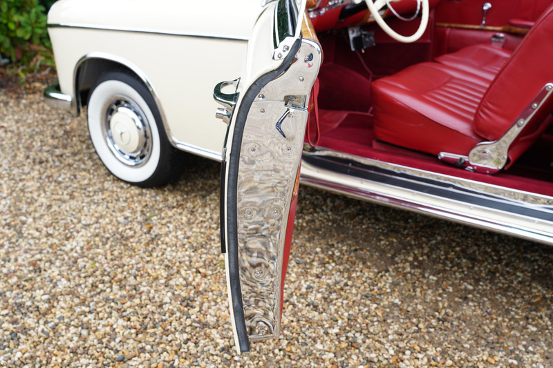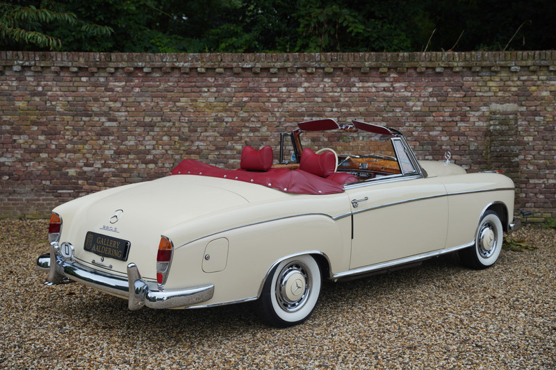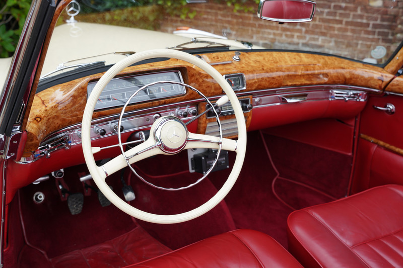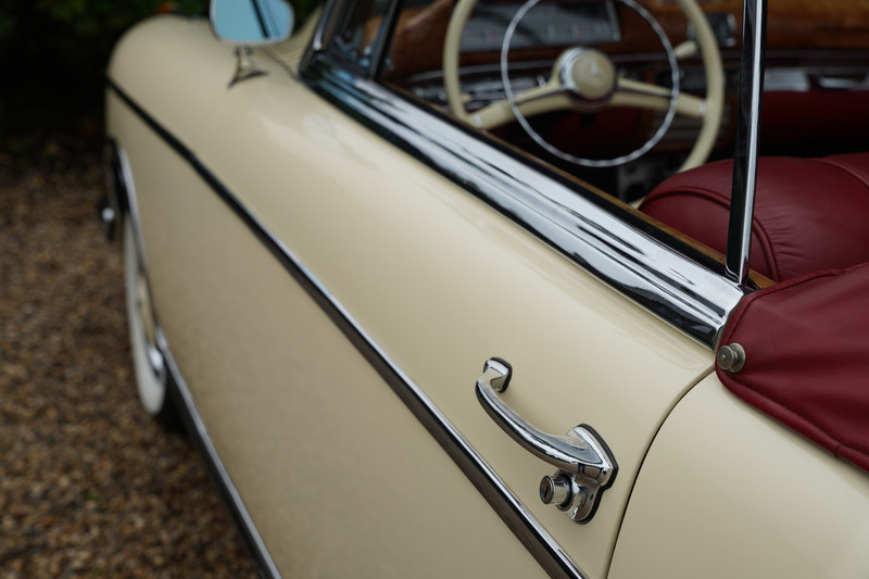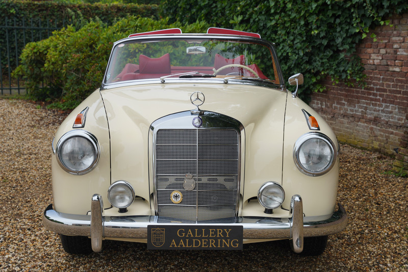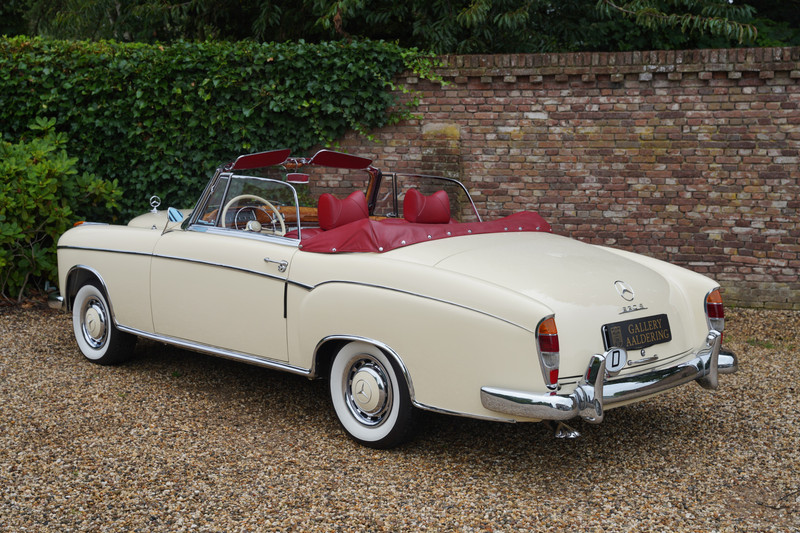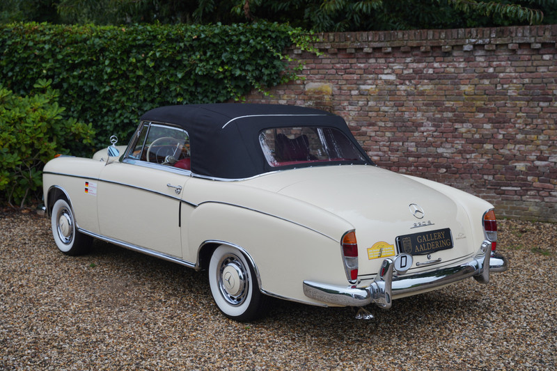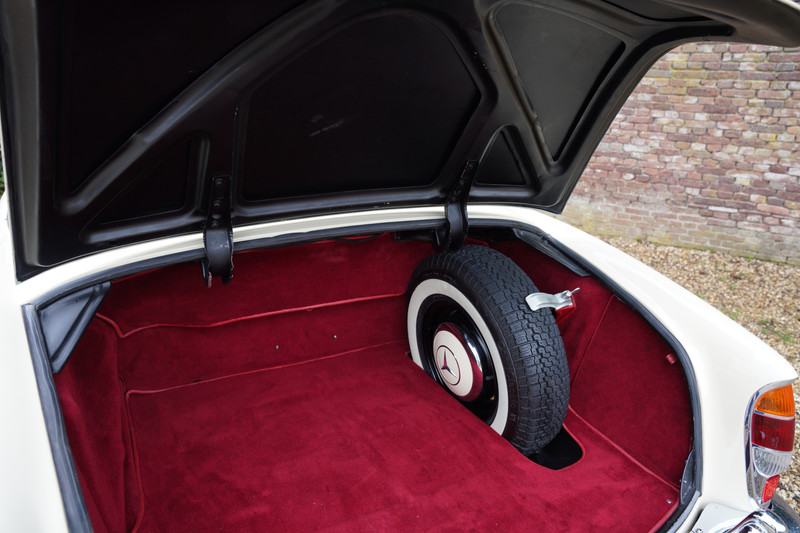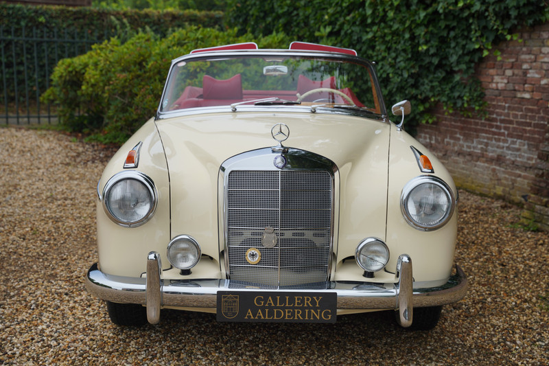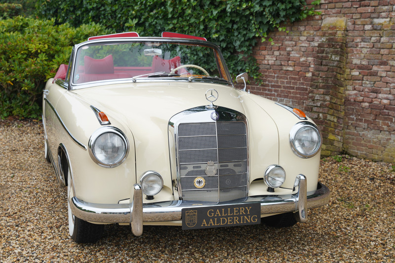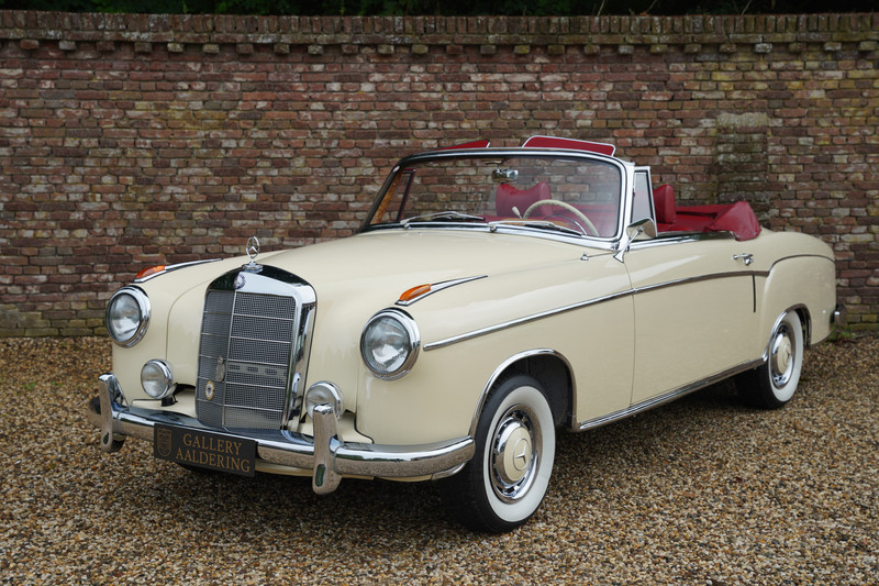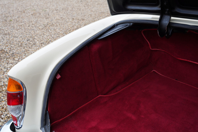 From the accompanying documentation and invoices that we have in our possession, one learns that it has been carefully cared for and has received periodic maintenance. The Mercedes is on neat summer tires from the Goodrich brand in the right sizes. As for the interior which exudes luxury and opulence in the beautiful red which matches the body color cream beautifully, we see no flaws and all instruments function and the Mercedes is equipped with a Halda tripmaster and its original Becker radio. In short, a unique Mercedes-Benz 220S in a beautiful color scheme.
