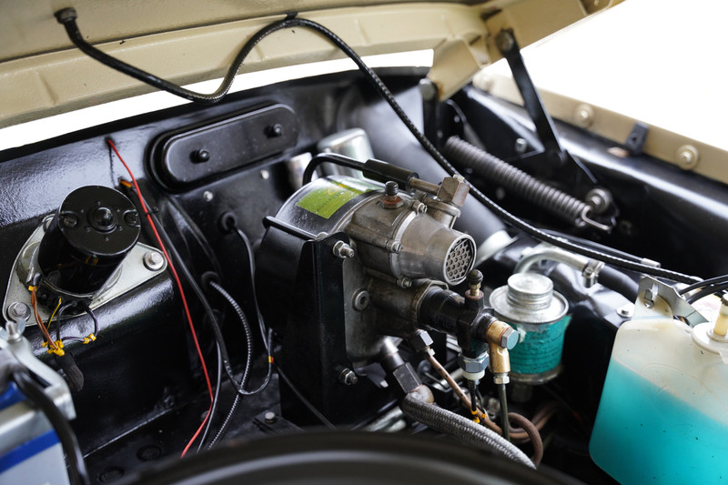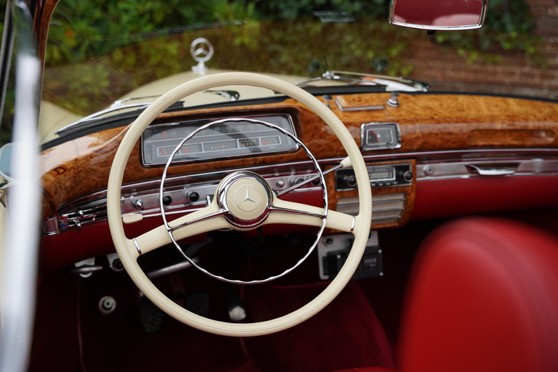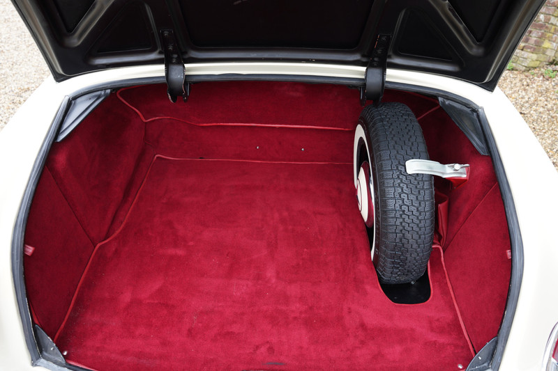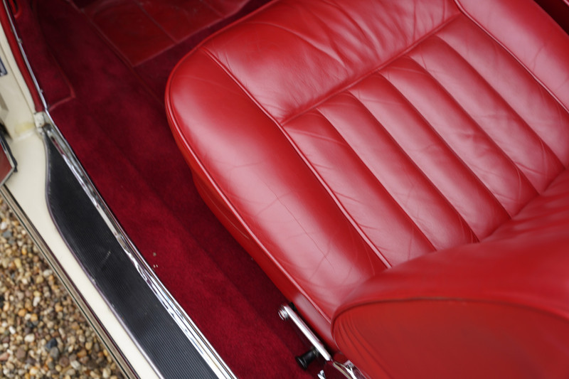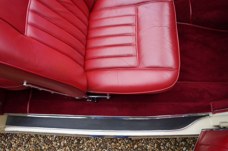 Aus den bei uns vorliegenden Begleitdokumenten und Rechnungen geht hervor, dass das Fahrzeug sorgfältig gepflegt und regelmäßig gewartet wurde. Der Mercedes ist auf gepflegten Sommerreifen der Marke Goodrich in den richtigen Größen unterwegs. Was den Innenraum betrifft, der Luxus und Opulenz in dem wunderschönen Rot ausstrahlt, das wunderbar zur Karosseriefarbe Creme passt, sehen wir keine Mängel und alle Instrumente funktionieren und der Mercedes ist mit einem Halda-Tripmaster und seinem originalen Becker-Radio ausgestattet. Kurz gesagt, ein einzigartiger Mercedes-Benz 220S in einer wunderschönen Farbgebung.