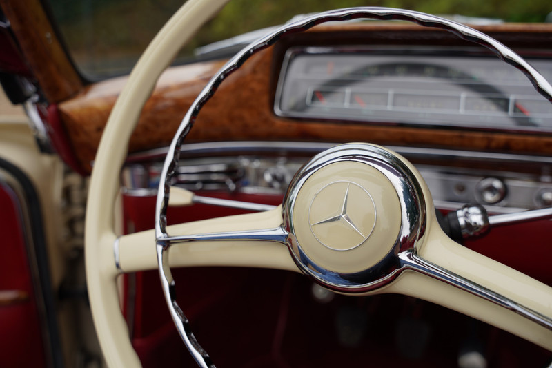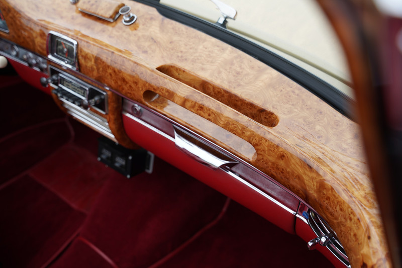 Die Passungen des Blechs sind so, wie man es von einem Mercedes-Benz dieses Kalibers erwarten würde, aber auch die Lackierung und die Chromarbeiten tragen zum Gesamtbild bei. Es ist immer ein angenehmes Erlebnis zu spüren, wie sich eine Autotür wie diese öffnet und schließt: solide vom Feinsten. Gebaut für die Ewigkeit. Dieser Mercedes Benz 220S wurde bereits in der Vergangenheit in einer so hohen Qualität restauriert und überholt, dass man ihn noch heute sehen kann.