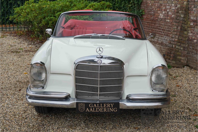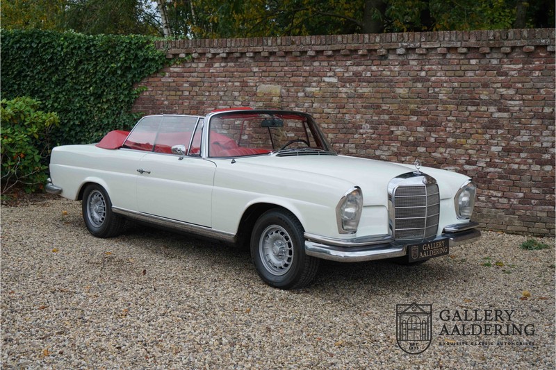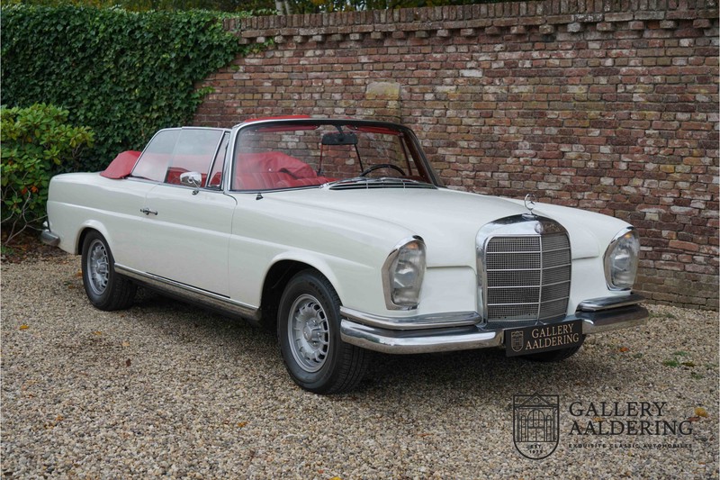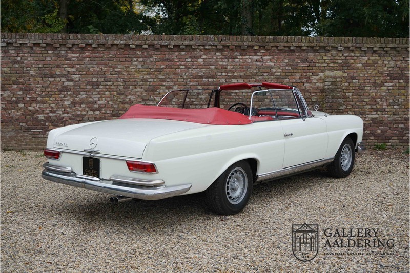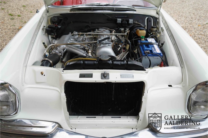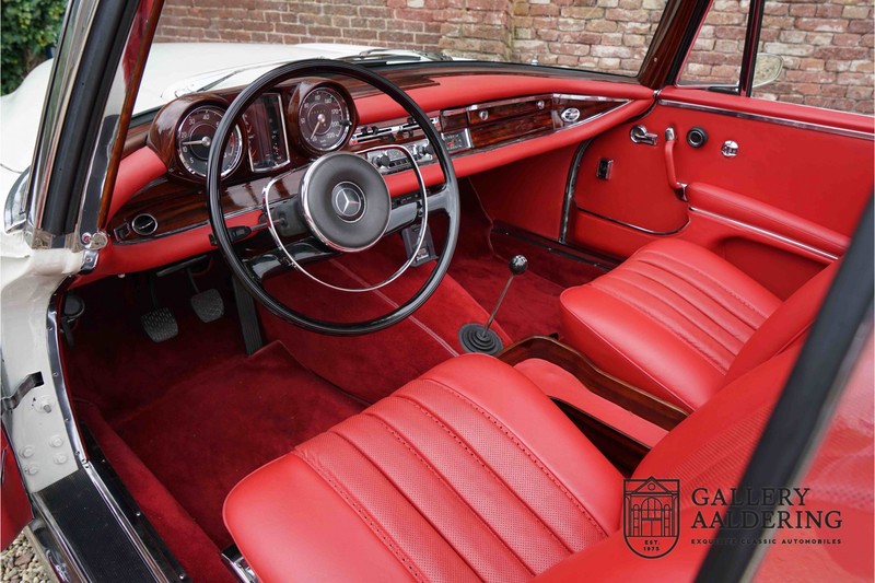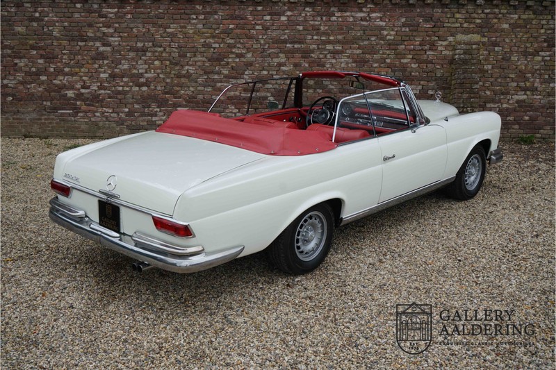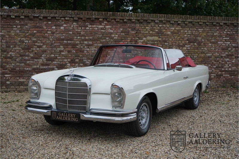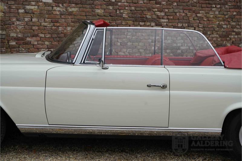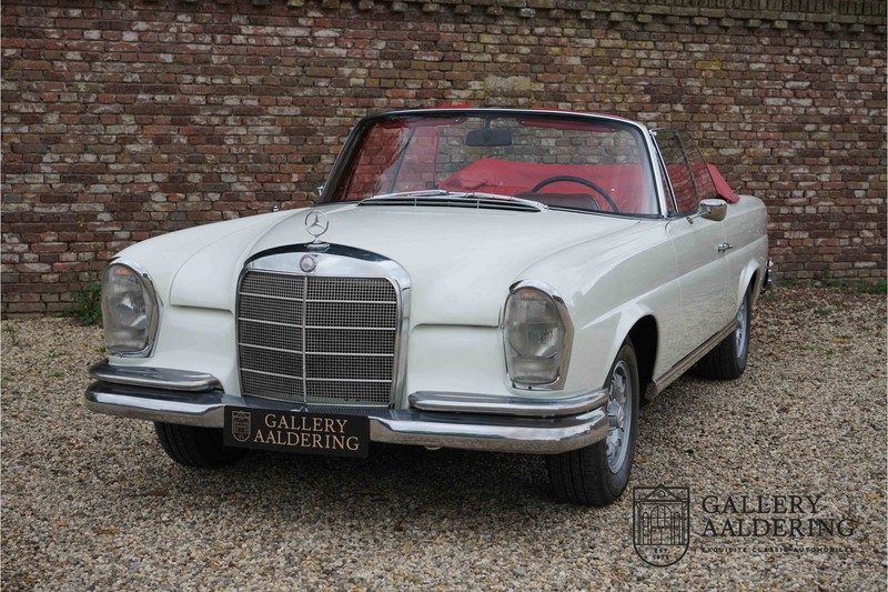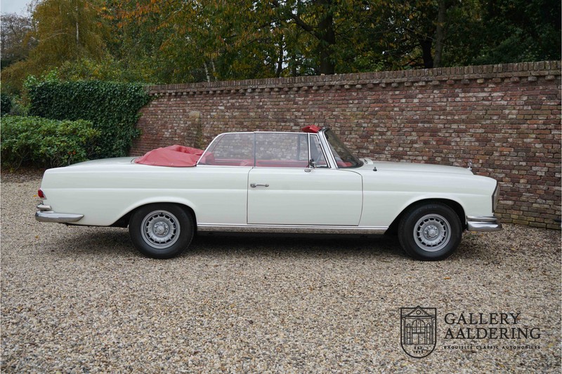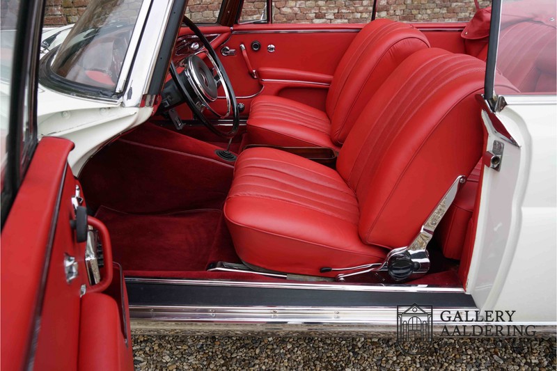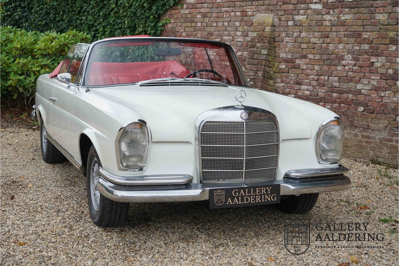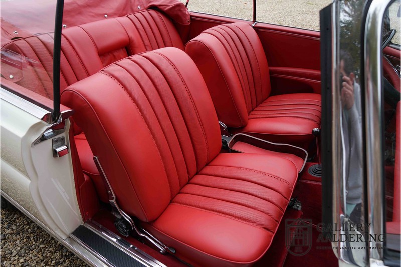 Dieser fantastische Mercedes Benz 250SE aus dem Jahr 1968 befindet jetzt in unserem Showroom. Es handelt sich um die Cabriolet Version von der W111 Reihe, wovon nur 5143 Exemplare hergestellt worden sind. Das Fahrzeug wurde als Cabriolet mit dem beliebten Schaltgetriebe ab Werk neu in Europa geliefert und ist also keine Konversion. Das Fahrzeug hatte eine sehr gute, schadenfreie und robuste Karosserie und hatte damit einer perfekten Grundlage für eine Komplettrestaurierung. Alle Teile der Karosserie waren nämlich noch komplett original und in einem guten Zustand. Die Restaurierung und Revidierung wurde bis ins Detail und fachmännisch durchgeführt, wobei Kosten noch Mühe gescheut wurden. Der 250 SE hat dementsprechend perfekte Passungen und eine wunderschöne Lackierung. Die Karosserie ist sehr glatt und wurde komplett und hochwertig neu lackiert. Das wunderschöne Interieur bekam ein neues Leder und neue Teppiche, alle Chrom- und Holzteile sehen wieder aus wie neu. Das neue rote Verdeck mit Tonneau kombinieren wunderschön mit der weißen Aussenfarbe. Auch die Technik ist natürlich tipptopp in Ordnung und befindet sich wieder in einem Neuzustand. Dieses wunderschöne Cabriolet mit Schaltgetriebe ist wirklich in allen Hinsichten top! Ein Topexemplar, das wartet auf seinen neuen und stolzen Besitzer!