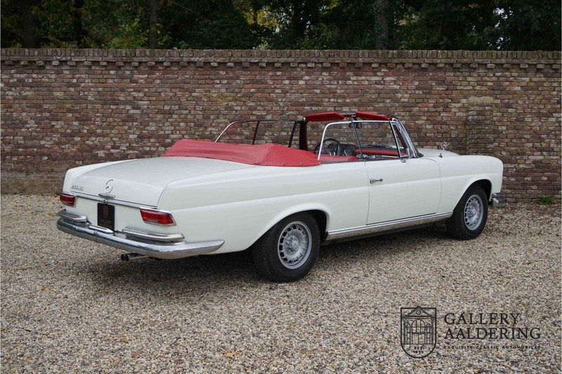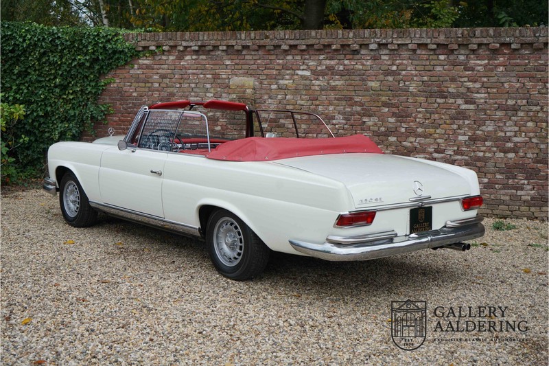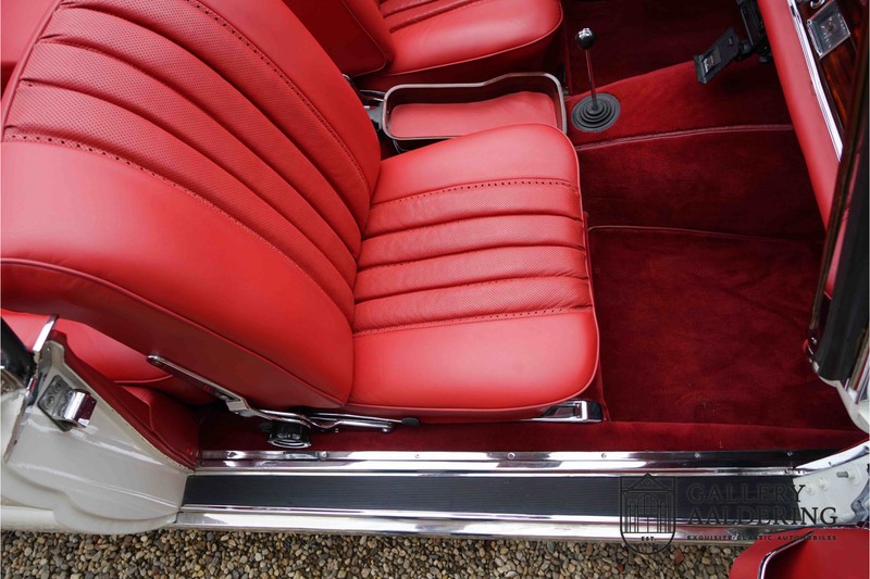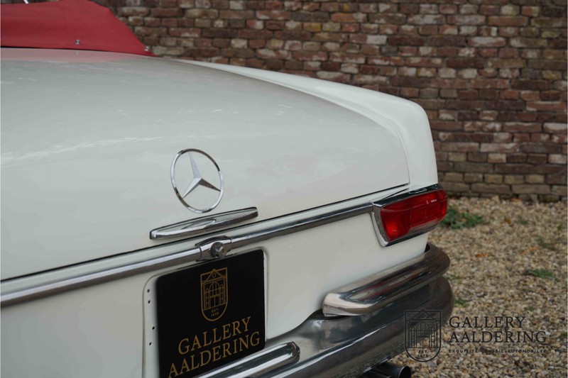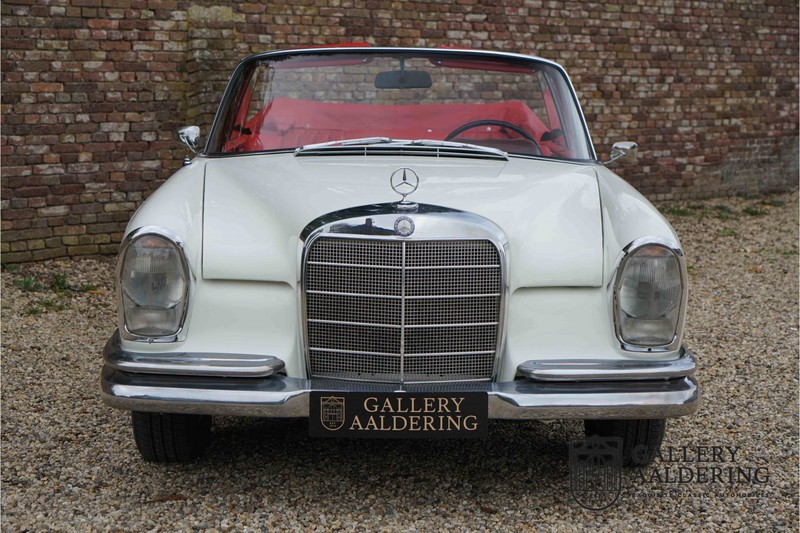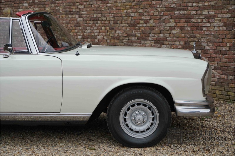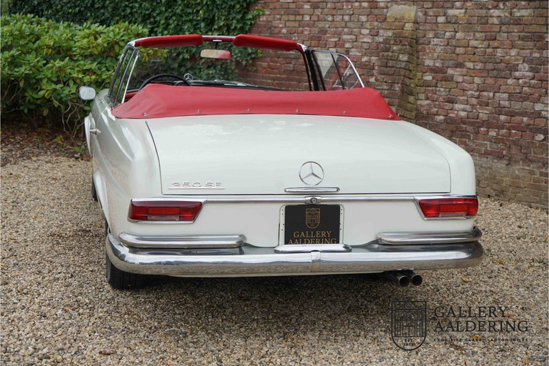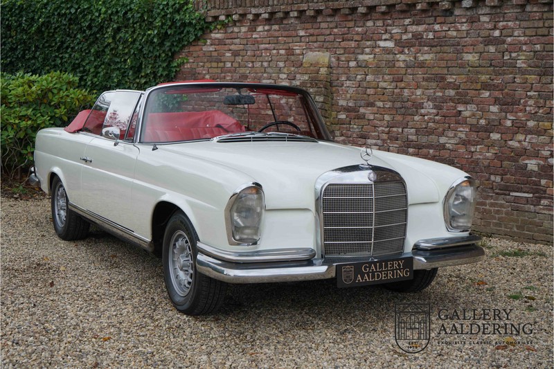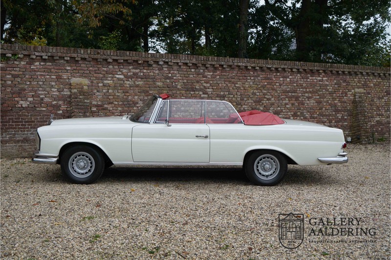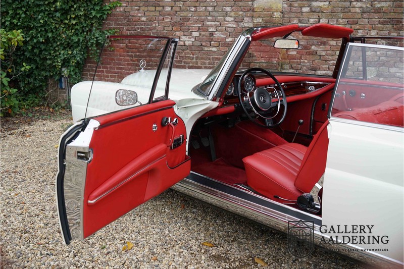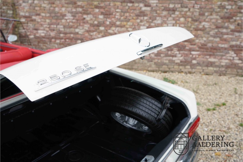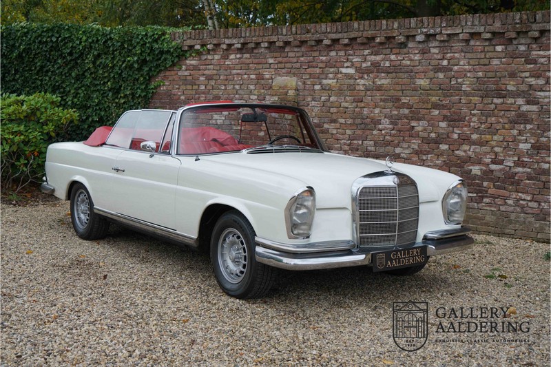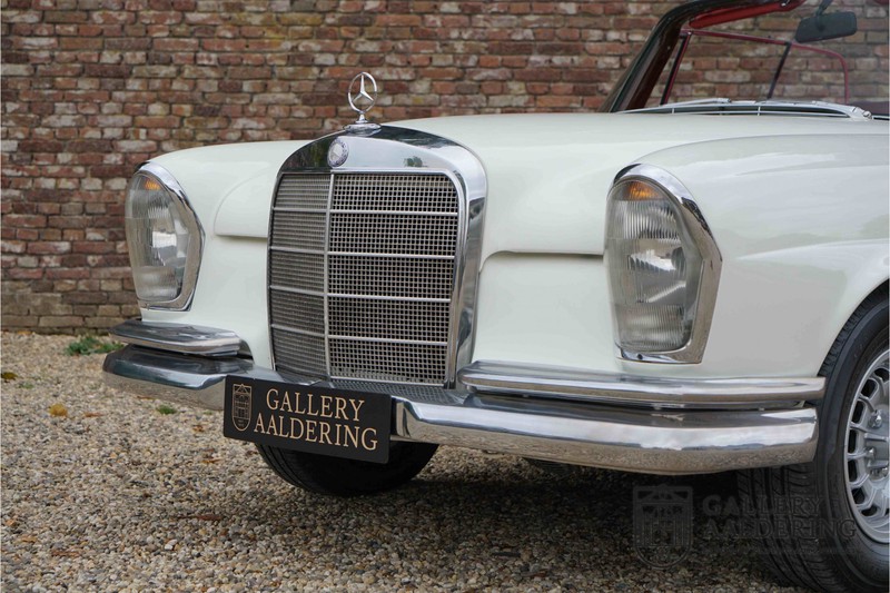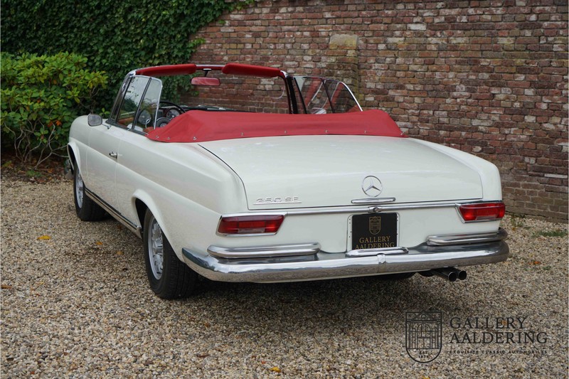 Dieser fantastische Mercedes Benz 250SE aus dem Jahr 1968 befindet jetzt in unserem Showroom. Es handelt sich um die Cabriolet Version von der W111 Reihe, wovon nur 5143 Exemplare hergestellt worden sind. Das Fahrzeug wurde als Cabriolet mit dem beliebten Schaltgetriebe ab Werk neu in Europa geliefert und ist also keine Konversion. Das Fahrzeug hatte eine sehr gute, schadenfreie und robuste Karosserie und hatte damit einer perfekten Grundlage für eine Komplettrestaurierung. Alle Teile der Karosserie waren nämlich noch komplett original und in einem guten Zustand. Die Restaurierung und Revidierung wurde bis ins Detail und fachmännisch durchgeführt, wobei Kosten noch Mühe gescheut wurden. Der 250 SE hat dementsprechend perfekte Passungen und eine wunderschöne Lackierung. Die Karosserie ist sehr glatt und wurde komplett und hochwertig neu lackiert. Das wunderschöne Interieur bekam ein neues Leder und neue Teppiche, alle Chrom- und Holzteile sehen wieder aus wie neu. Das neue rote Verdeck mit Tonneau kombinieren wunderschön mit der weißen Aussenfarbe. Auch die Technik ist natürlich tipptopp in Ordnung und befindet sich wieder in einem Neuzustand. Dieses wunderschöne Cabriolet mit Schaltgetriebe ist wirklich in allen Hinsichten top! Ein Topexemplar, das wartet auf seinen neuen und stolzen Besitzer!