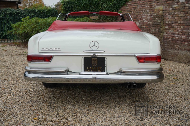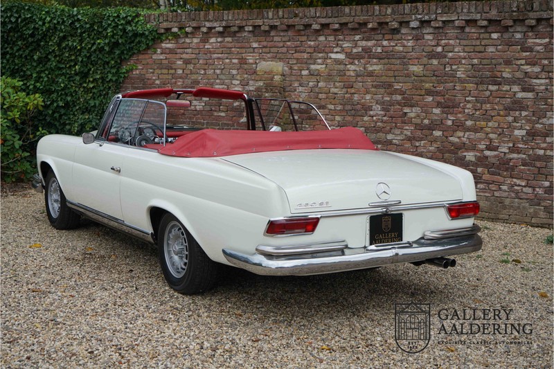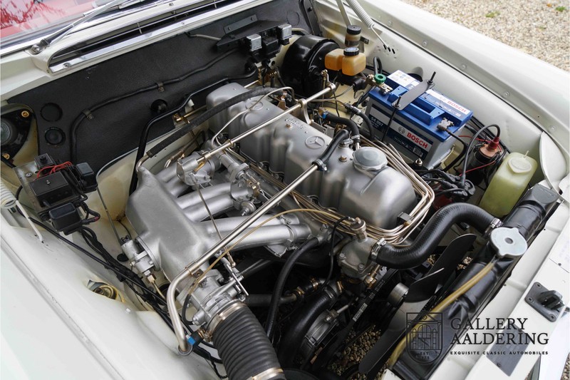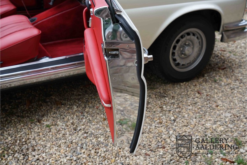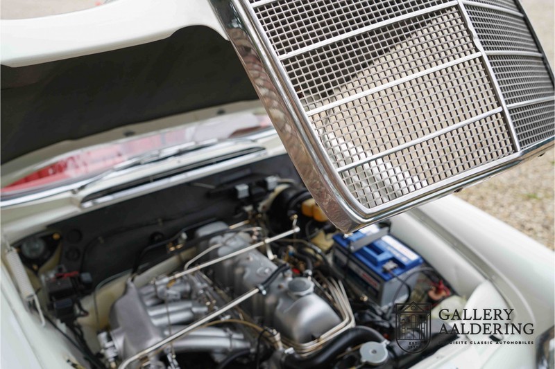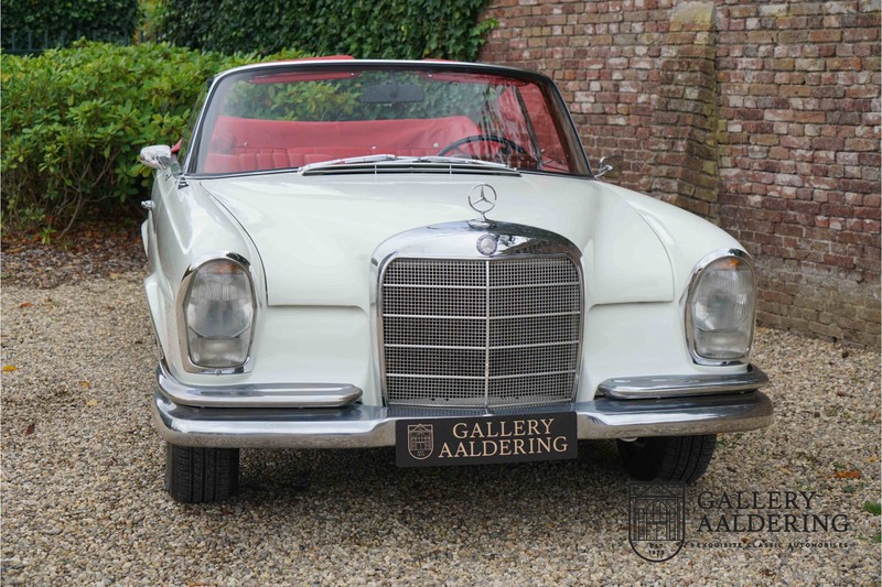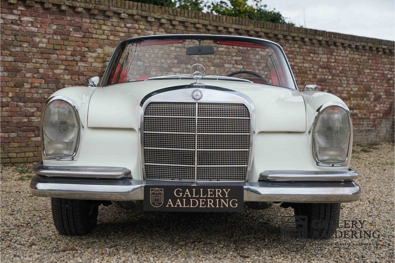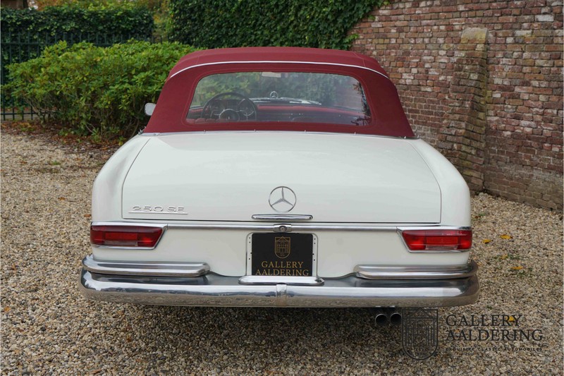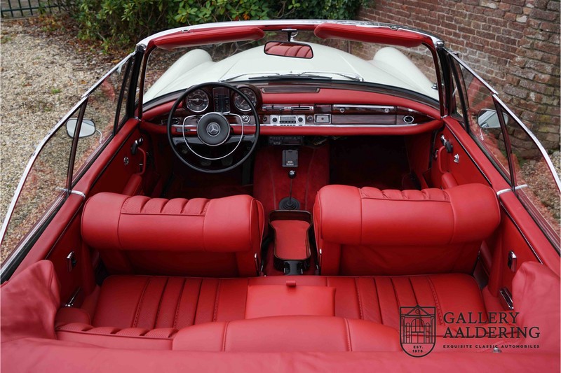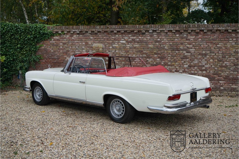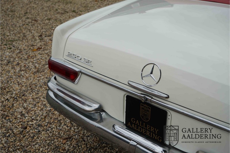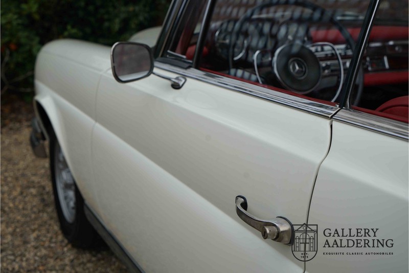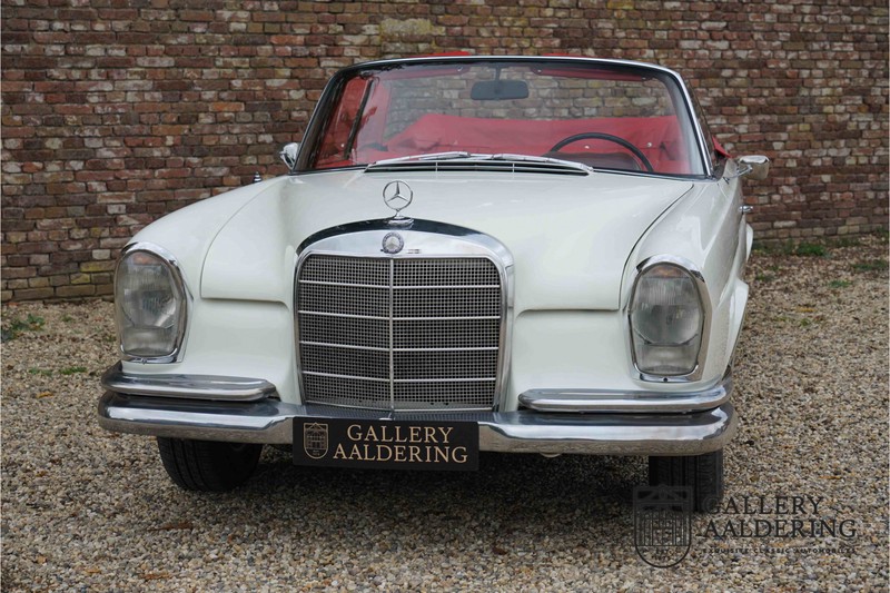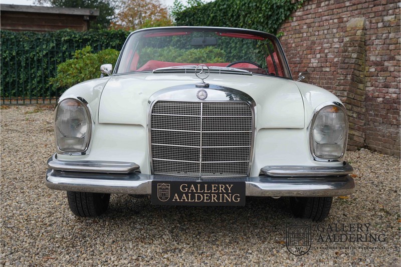 Dieser fantastische Mercedes Benz 250SE aus dem Jahr 1968 befindet jetzt in unserem Showroom. Es handelt sich um die Cabriolet Version von der W111 Reihe, wovon nur 5143 Exemplare hergestellt worden sind. Das Fahrzeug wurde als Cabriolet mit dem beliebten Schaltgetriebe ab Werk neu in Europa geliefert und ist also keine Konversion. Das Fahrzeug hatte eine sehr gute, schadenfreie und robuste Karosserie und hatte damit einer perfekten Grundlage für eine Komplettrestaurierung. Alle Teile der Karosserie waren nämlich noch komplett original und in einem guten Zustand. Die Restaurierung und Revidierung wurde bis ins Detail und fachmännisch durchgeführt, wobei Kosten noch Mühe gescheut wurden. Der 250 SE hat dementsprechend perfekte Passungen und eine wunderschöne Lackierung. Die Karosserie ist sehr glatt und wurde komplett und hochwertig neu lackiert. Das wunderschöne Interieur bekam ein neues Leder und neue Teppiche, alle Chrom- und Holzteile sehen wieder aus wie neu. Das neue rote Verdeck mit Tonneau kombinieren wunderschön mit der weißen Aussenfarbe. Auch die Technik ist natürlich tipptopp in Ordnung und befindet sich wieder in einem Neuzustand. Dieses wunderschöne Cabriolet mit Schaltgetriebe ist wirklich in allen Hinsichten top! Ein Topexemplar, das wartet auf seinen neuen und stolzen Besitzer!