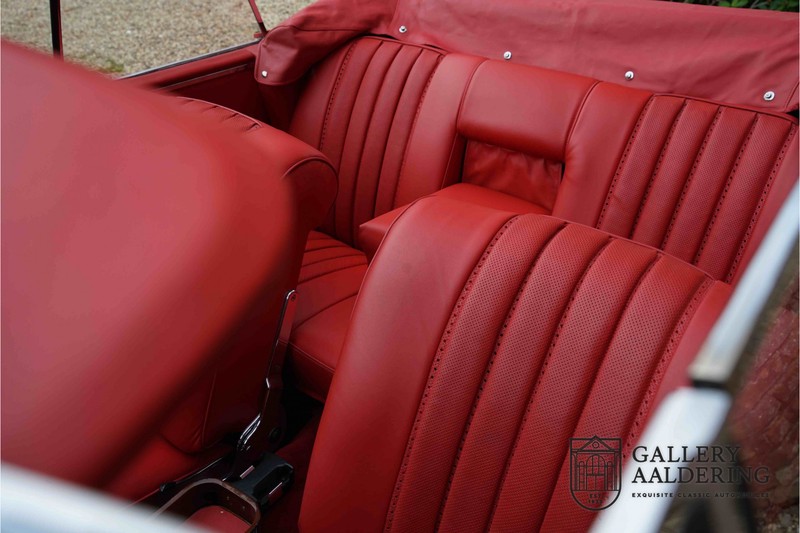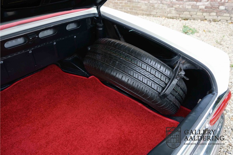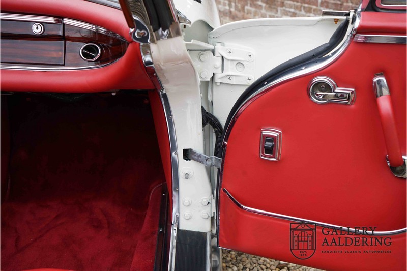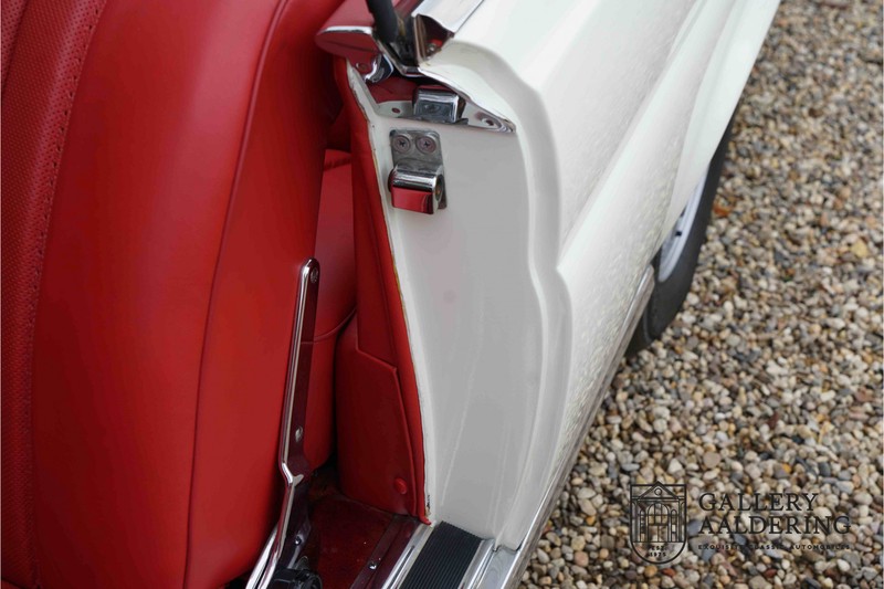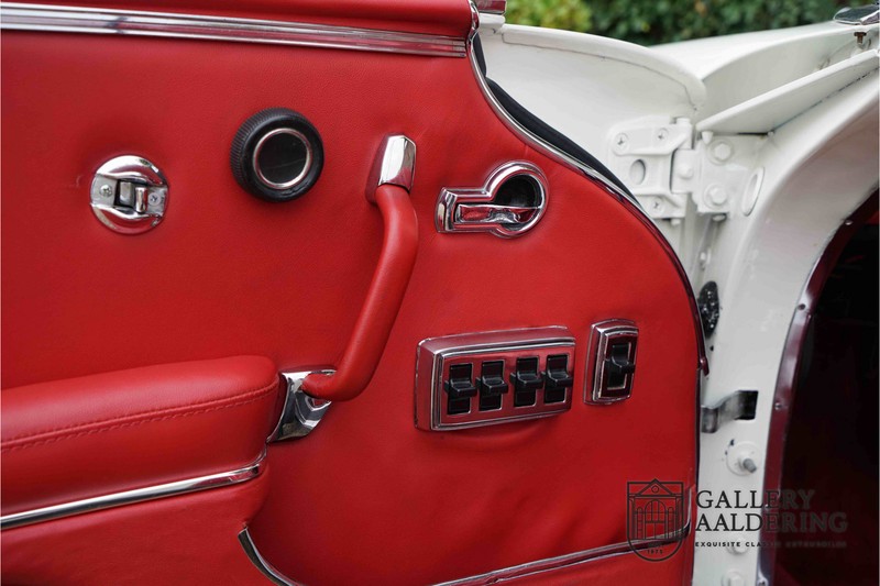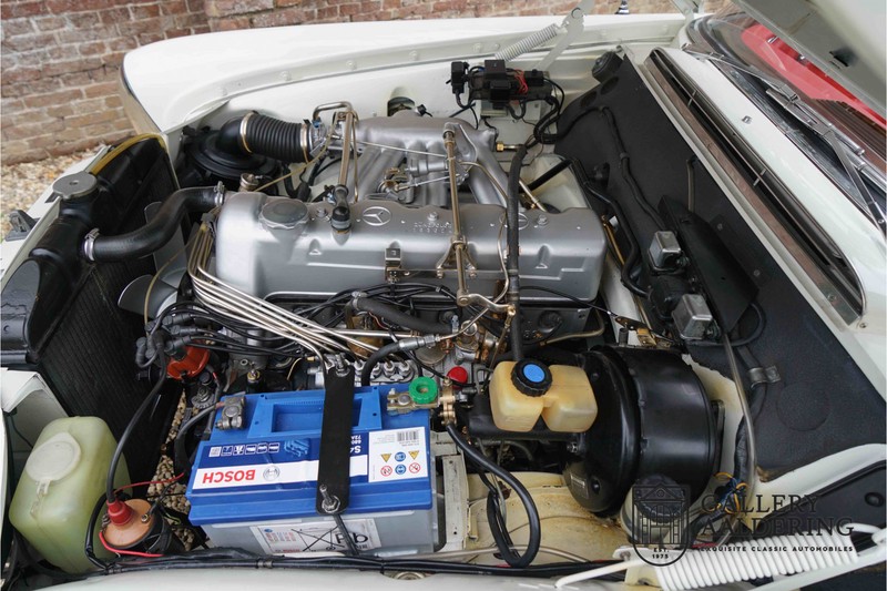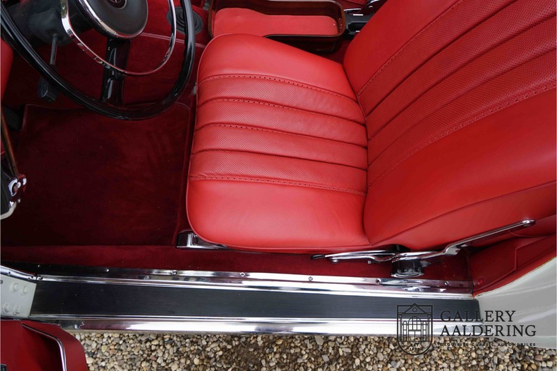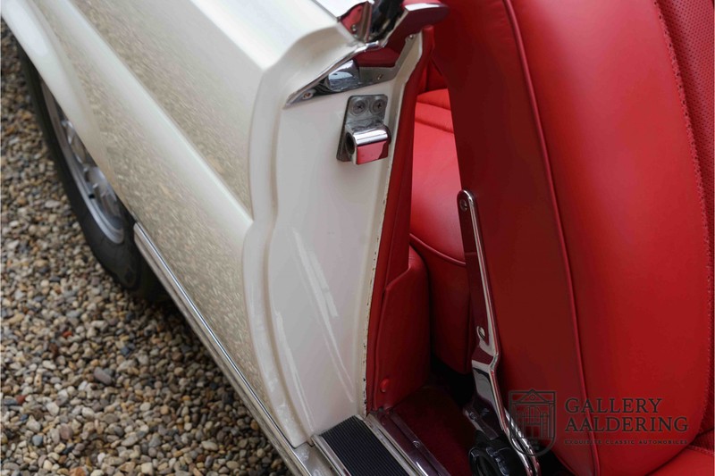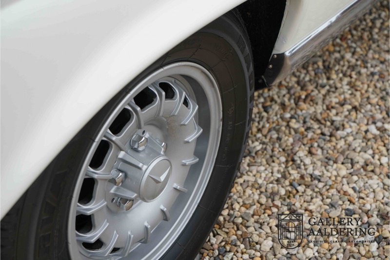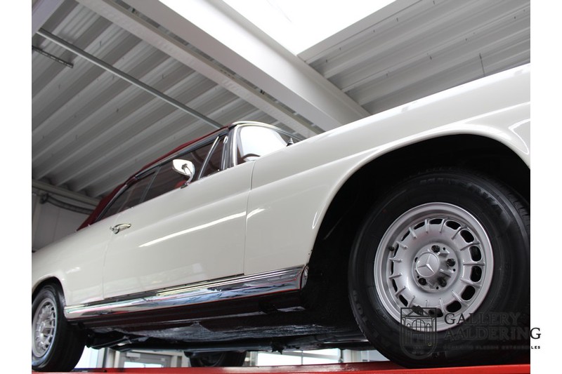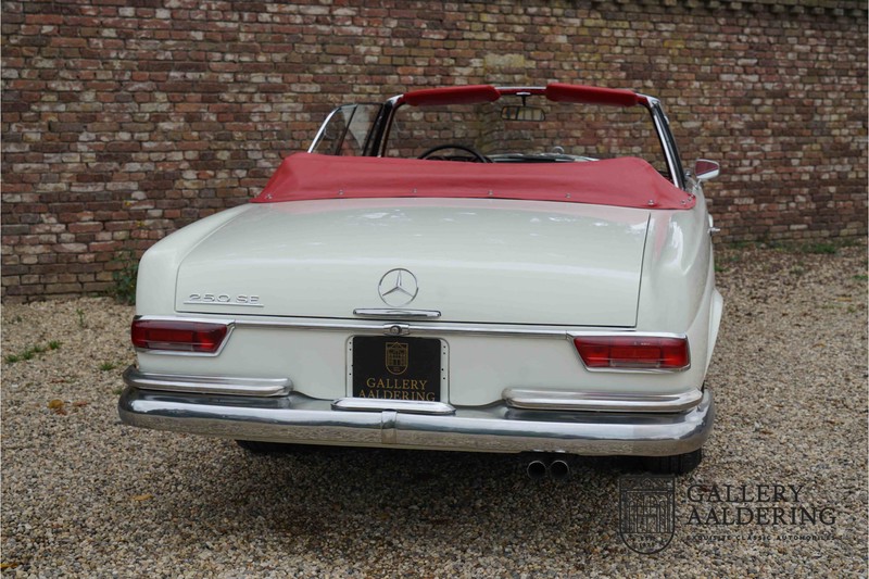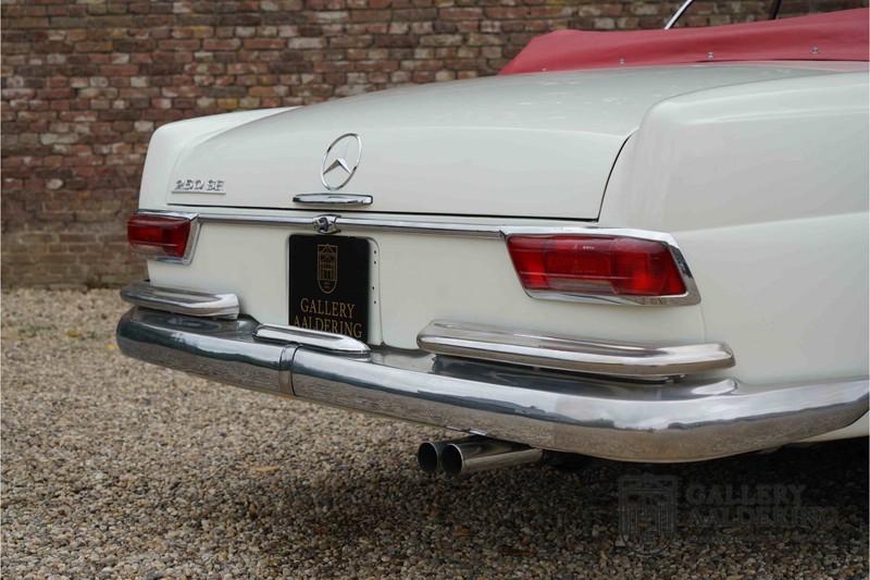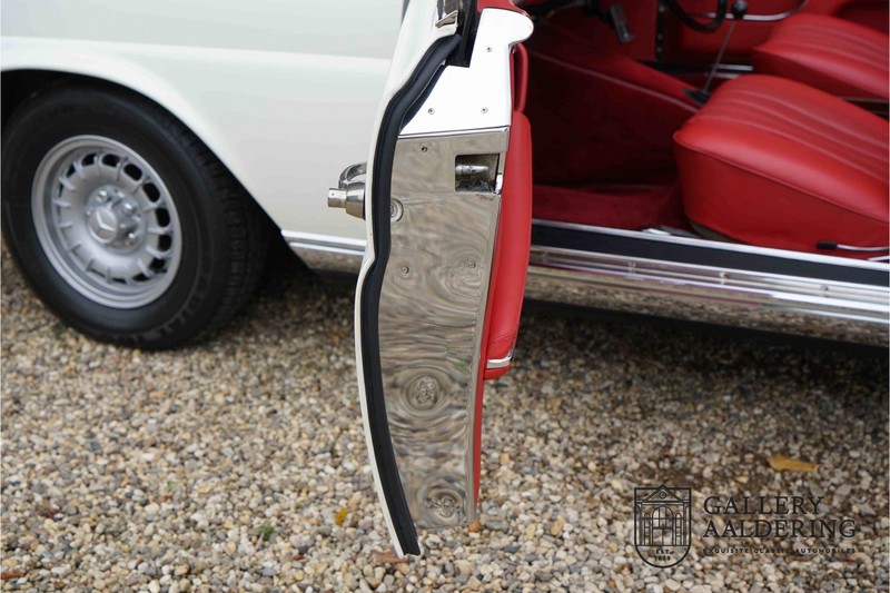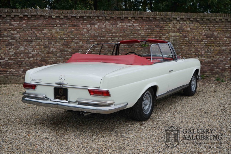 Dieser fantastische Mercedes Benz 250SE aus dem Jahr 1968 befindet jetzt in unserem Showroom. Es handelt sich um die Cabriolet Version von der W111 Reihe, wovon nur 5143 Exemplare hergestellt worden sind. Das Fahrzeug wurde als Cabriolet mit dem beliebten Schaltgetriebe ab Werk neu in Europa geliefert und ist also keine Konversion. Das Fahrzeug hatte eine sehr gute, schadenfreie und robuste Karosserie und hatte damit einer perfekten Grundlage für eine Komplettrestaurierung. Alle Teile der Karosserie waren nämlich noch komplett original und in einem guten Zustand. Die Restaurierung und Revidierung wurde bis ins Detail und fachmännisch durchgeführt, wobei Kosten noch Mühe gescheut wurden. Der 250 SE hat dementsprechend perfekte Passungen und eine wunderschöne Lackierung. Die Karosserie ist sehr glatt und wurde komplett und hochwertig neu lackiert. Das wunderschöne Interieur bekam ein neues Leder und neue Teppiche, alle Chrom- und Holzteile sehen wieder aus wie neu. Das neue rote Verdeck mit Tonneau kombinieren wunderschön mit der weißen Aussenfarbe. Auch die Technik ist natürlich tipptopp in Ordnung und befindet sich wieder in einem Neuzustand. Dieses wunderschöne Cabriolet mit Schaltgetriebe ist wirklich in allen Hinsichten top! Ein Topexemplar, das wartet auf seinen neuen und stolzen Besitzer!