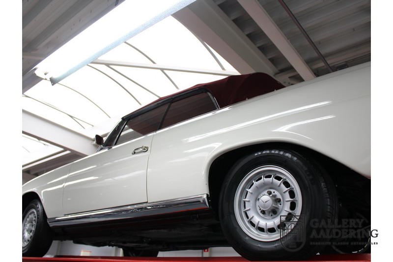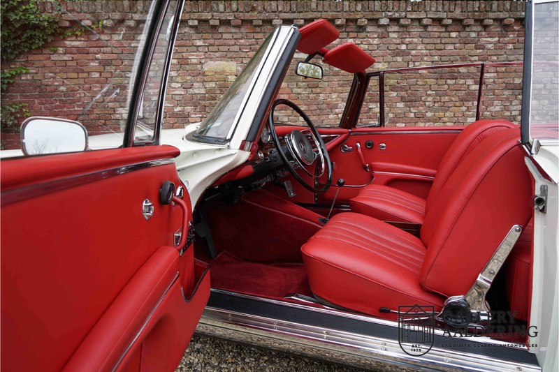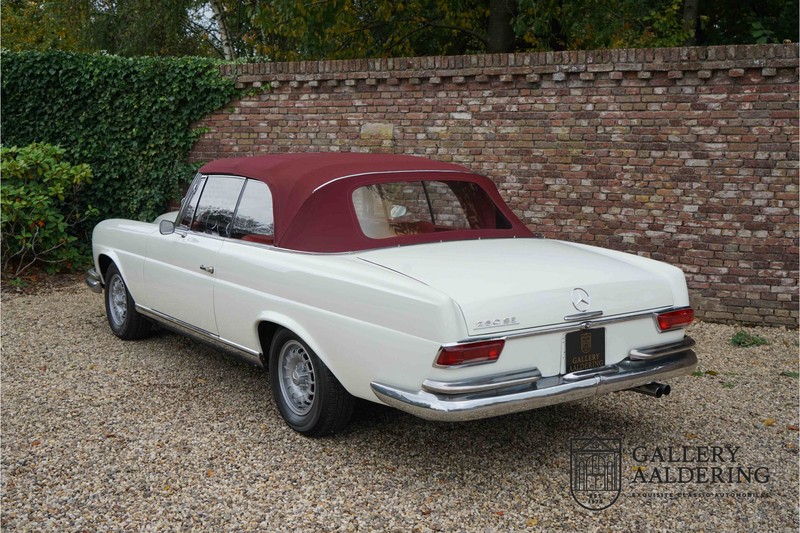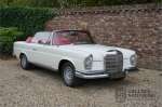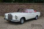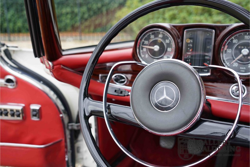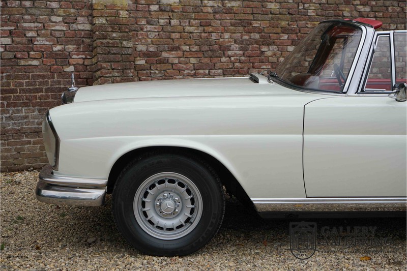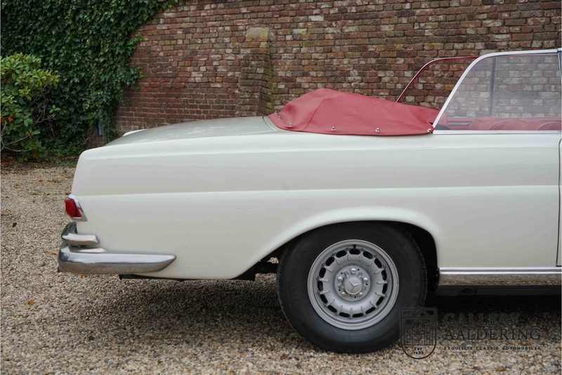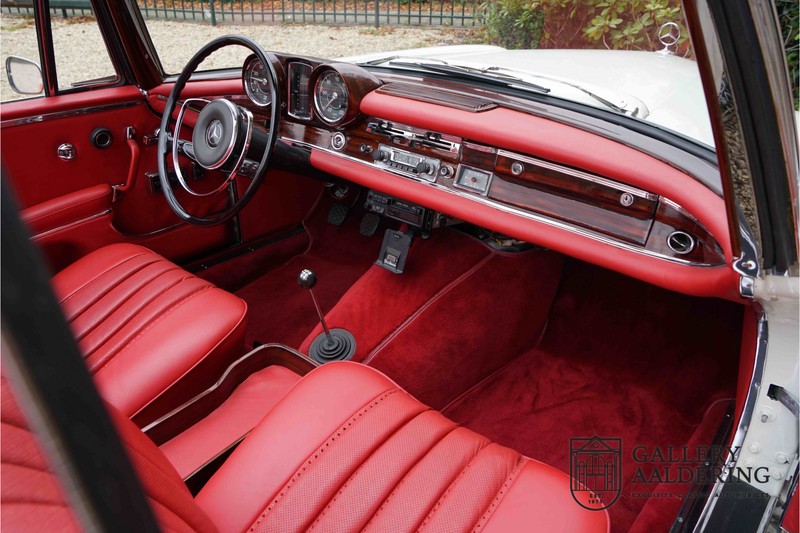 We have a peach of a 1968 Mercedes Benz 250SE Convertible standing in our showroom now. A convertible version of the W111 with a limited production run of 5,143. An original European factory supplied convertible and as such not a coupe conversion. It has the popular manual gearbox. The nice and solid rust-free body formed an excellent base for the very professional and detailed restoration and mechanical overhaul. Neither cost or effort were a barrier during the restoration! The bodywork is superb and was accident-free when restored, all original panels are present with the front, rear arches and partition wall all being factory parts. The latter gave the 250SE its perfectly straight and aligned body panels and very fine paintwork. It also received a top and bottom re-spray giving a very sharp finish to the car. The interior is also in top order. It was refurbished with new original leather, new carpets as well as the brightwork and woodwork looking as good as new. A new hood with red roof lining completes the picture. The colour combination of the exterior paintwork, the interior trim and hood are truly magnificent. Mechanically it also received all due care and attention and is now in pristine condition. The desirable manual convertible is complete. Every detail in its correct place. A top quality example, if ever! Ready for the next proud owner.