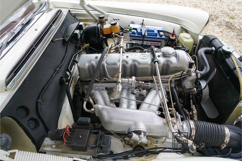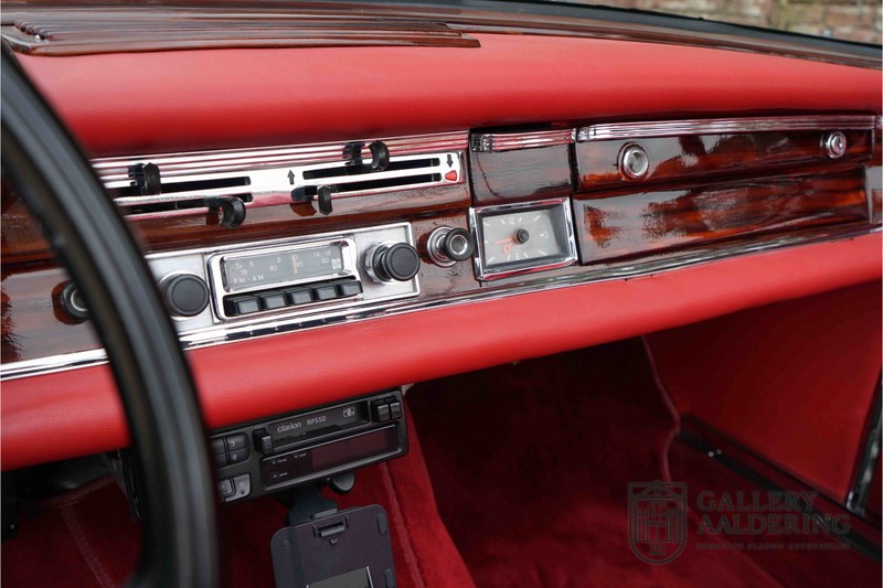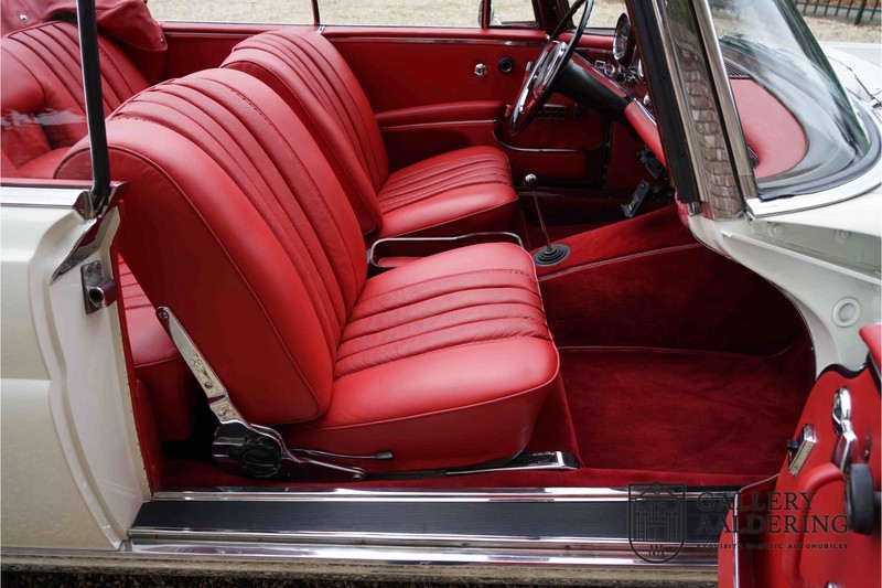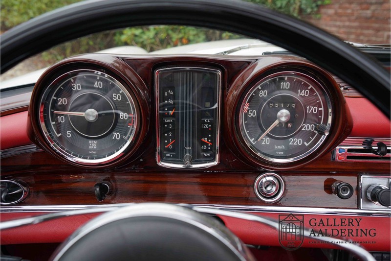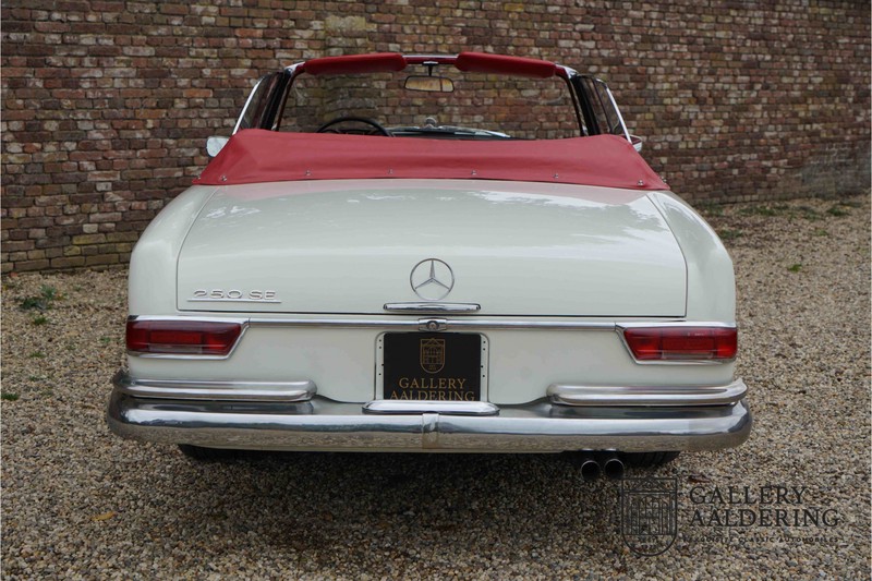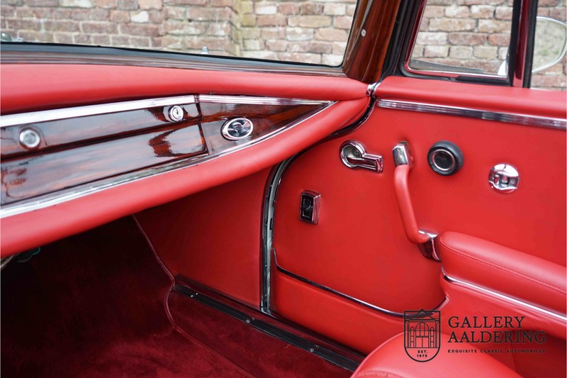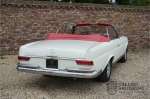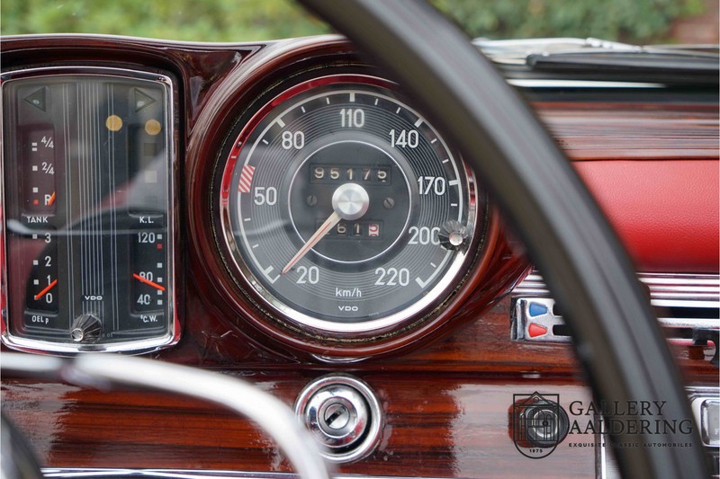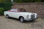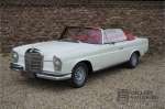 We have a peach of a 1968 Mercedes Benz 250SE Convertible standing in our showroom now. A convertible version of the W111 with a limited production run of 5,143. An original European factory supplied convertible and as such not a coupe conversion. It has the popular manual gearbox. The nice and solid rust-free body formed an excellent base for the very professional and detailed restoration and mechanical overhaul. Neither cost or effort were a barrier during the restoration! The bodywork is superb and was accident-free when restored, all original panels are present with the front, rear arches and partition wall all being factory parts. The latter gave the 250SE its perfectly straight and aligned body panels and very fine paintwork. It also received a top and bottom re-spray giving a very sharp finish to the car. The interior is also in top order. It was refurbished with new original leather, new carpets as well as the brightwork and woodwork looking as good as new. A new hood with red roof lining completes the picture. The colour combination of the exterior paintwork, the interior trim and hood are truly magnificent. Mechanically it also received all due care and attention and is now in pristine condition. The desirable manual convertible is complete. Every detail in its correct place. A top quality example, if ever! Ready for the next proud owner.