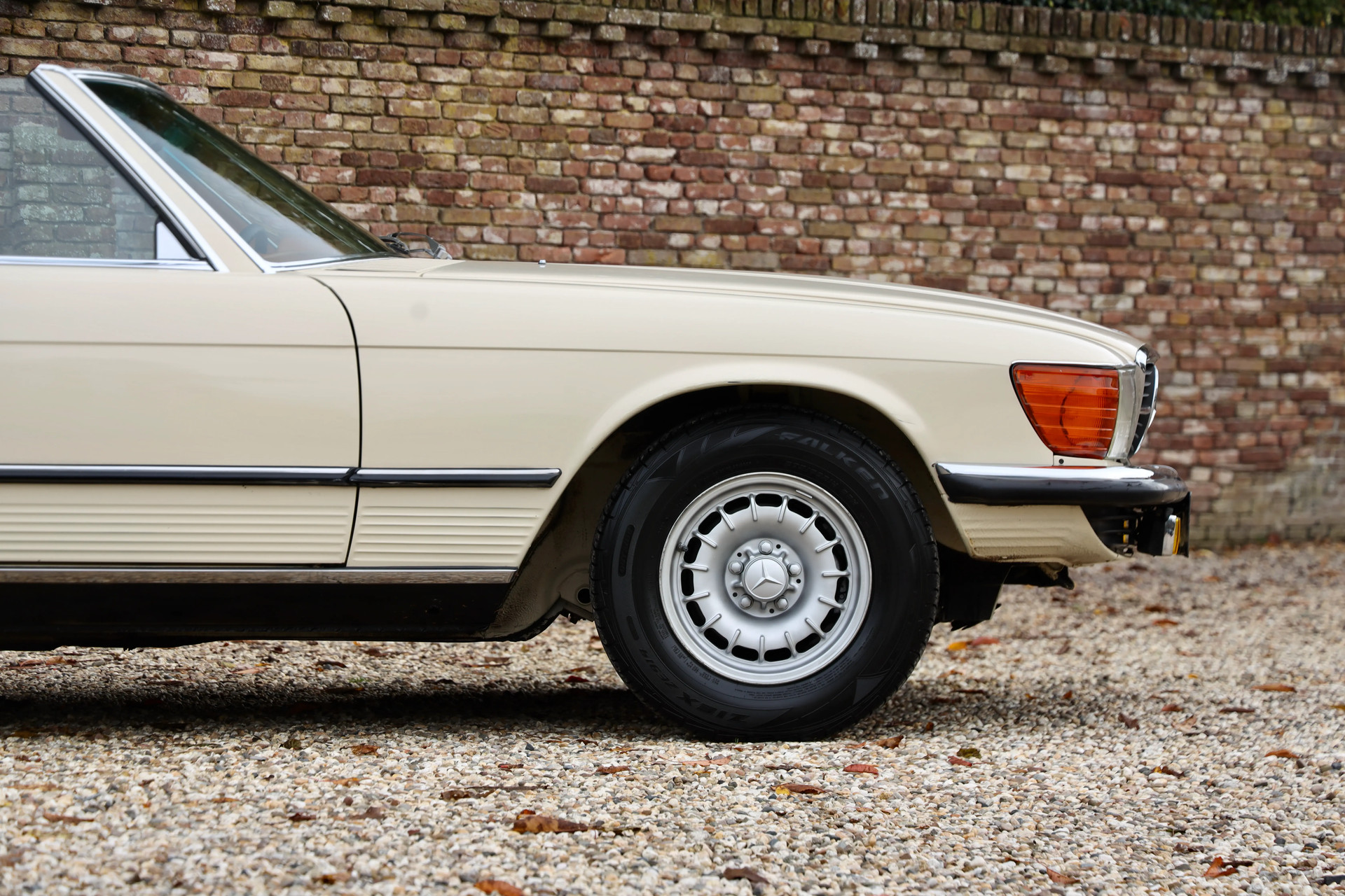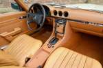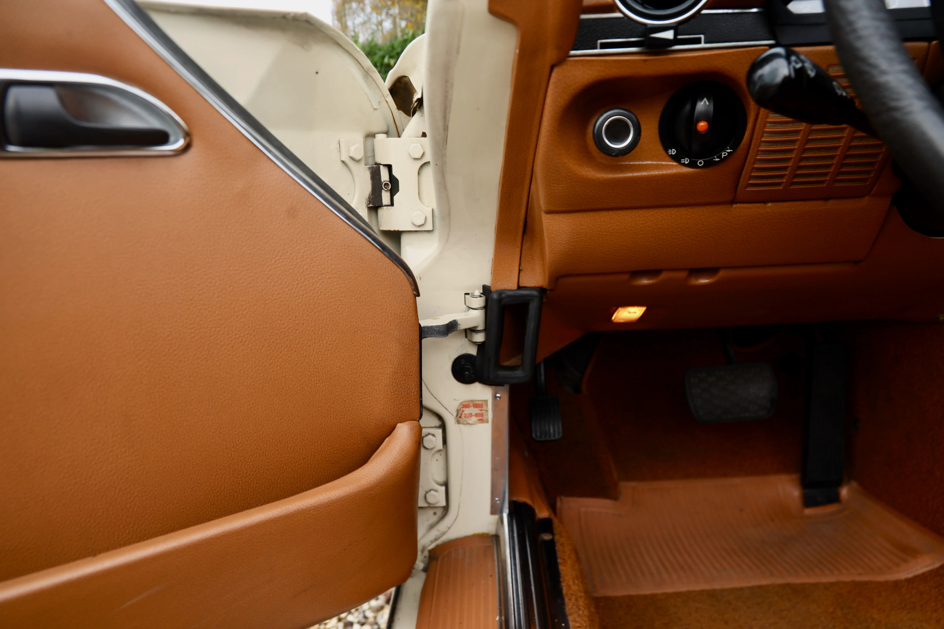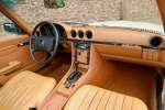 Deze Mercedes is uitgevoerd in Light Ivory, nog altijd in de eerste lak, gecombineerd met een prachtig Saffron (Bamboo) leren interieur. Een kleurstelling die klasse uitstraalt en uitzonderlijk goed bij de stijlvolle jaren zeventig lijnen van de R107 past. Origineel, warm, ingetogen, precies zoals men het graag ziet bij een klassieke SL.