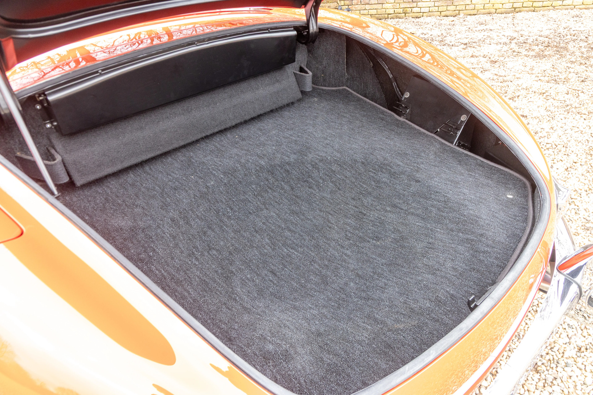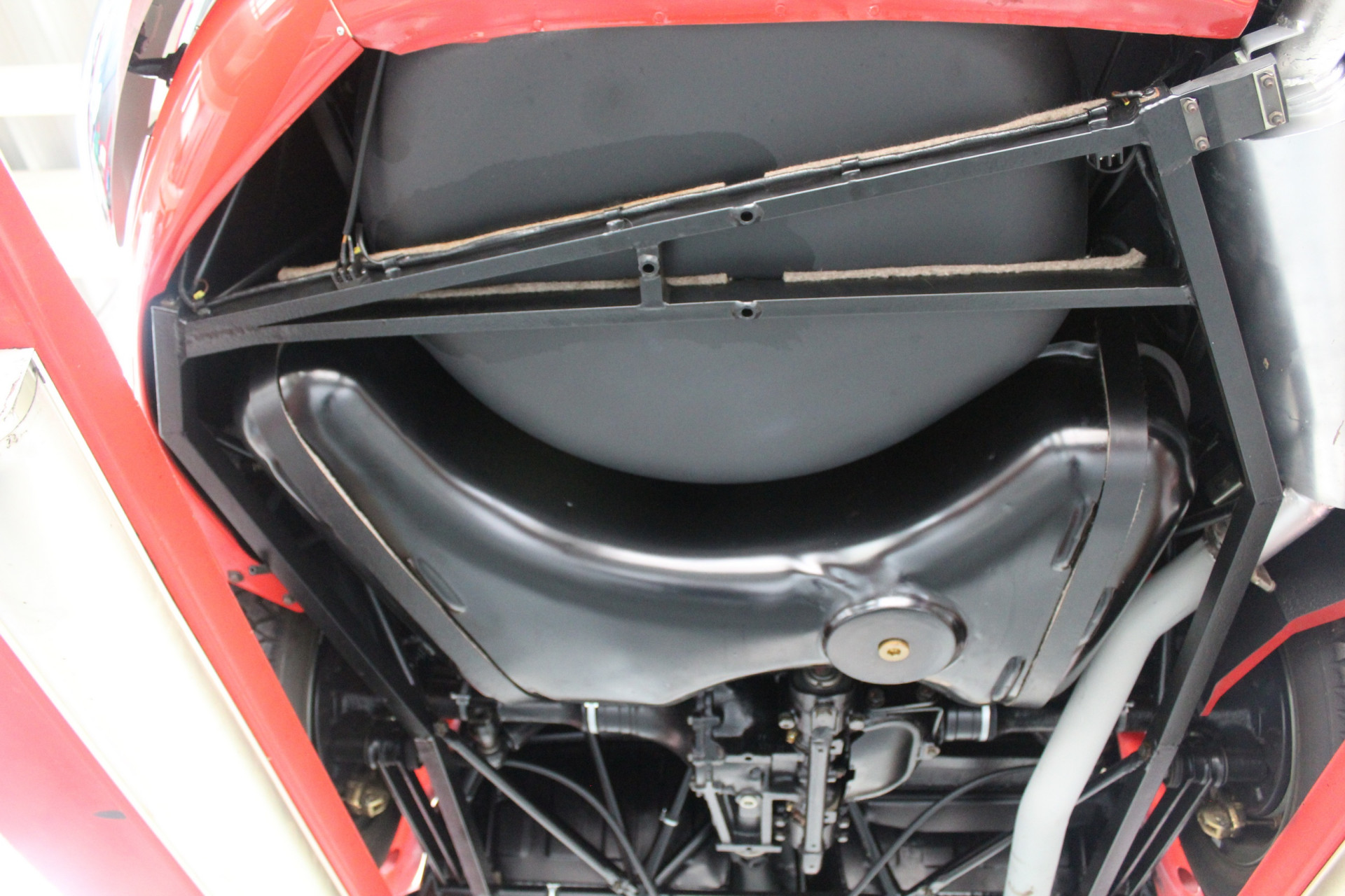 During the restoration the body was stripped to bare metal while the drivetrain and all mechanical components were fully rebuilt. The interior was retrimmed according to factory specifications and the engine compartment finished in its correct configuration. The body was subsequently refinished in its original color combination. The steel wheels were restored exactly as delivered when new, featuring red outer faces with olive green inner sections, a detail characteristic of later production Roadsters.