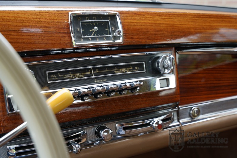 Das Interieur ist noch vollkommen original und das dazu passende Kofferset ist auch noch vorhanden. Das sehr hochwertige braune Leder ist vollkommen original, die Teppiche und Türbekleidungen befinden sich ebenfalls in einem guten Zustand. Alle Instrumente und Bedienelemente funktionieren einwandfrei. Die Holzeinlagen in den Türen und im Armaturenbrett befinden sich in einem sehr guten und originalen Zustand. Die Qualität vom Interieur hat in den vergangenen Jahrzehnten an Ausstrahlung nichts verloren.