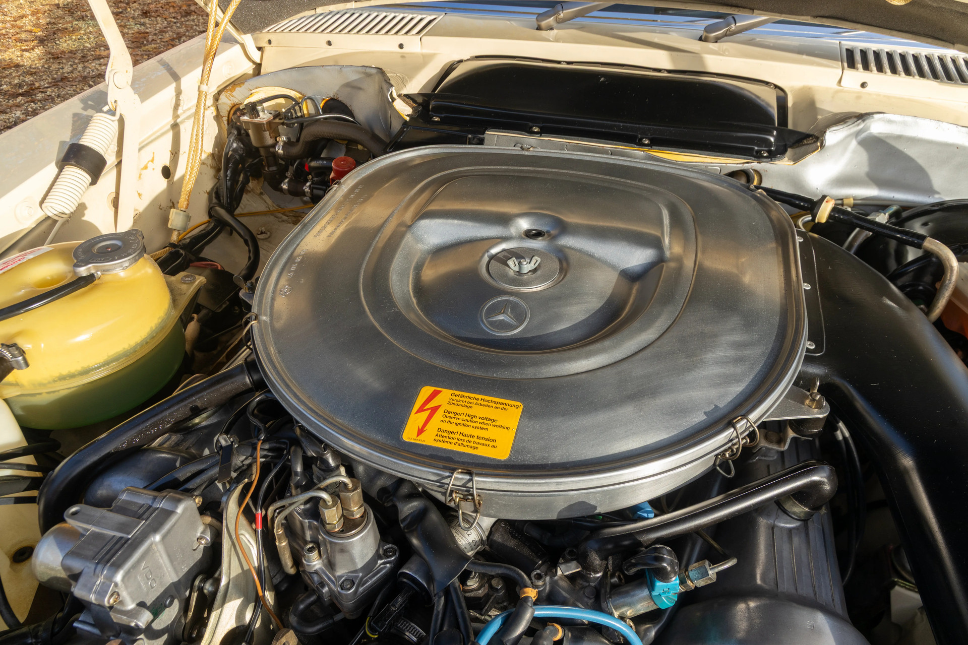 De kleurstelling is een verhaal op zich: uitgevoerd in het subtiele maar karakteristieke Light Ivory, gecombineerd met een Palomino MB-Tex interieur dat nauwelijks sporen van gebruik vertoont. Het is precies die combinatie die de 380 SL van begin jaren ’80 zo authentiek maakt. Stijlvol, ingetogen en tijdloos. Stap in, en ervaar direct dat typische Mercedes gevoel: de solide klik van de portier, de ingetogen luxe, de geur van materialen die meer dan vier decennia later nog steeds hun kwaliteit behouden hebben.