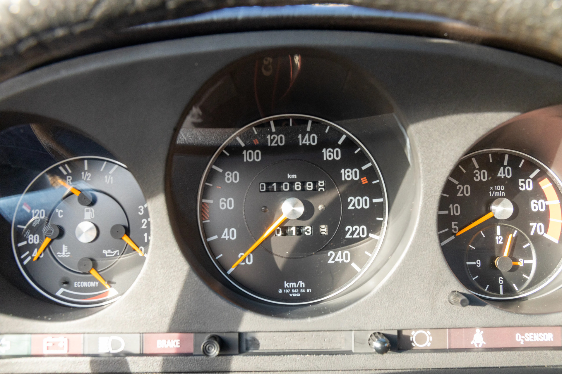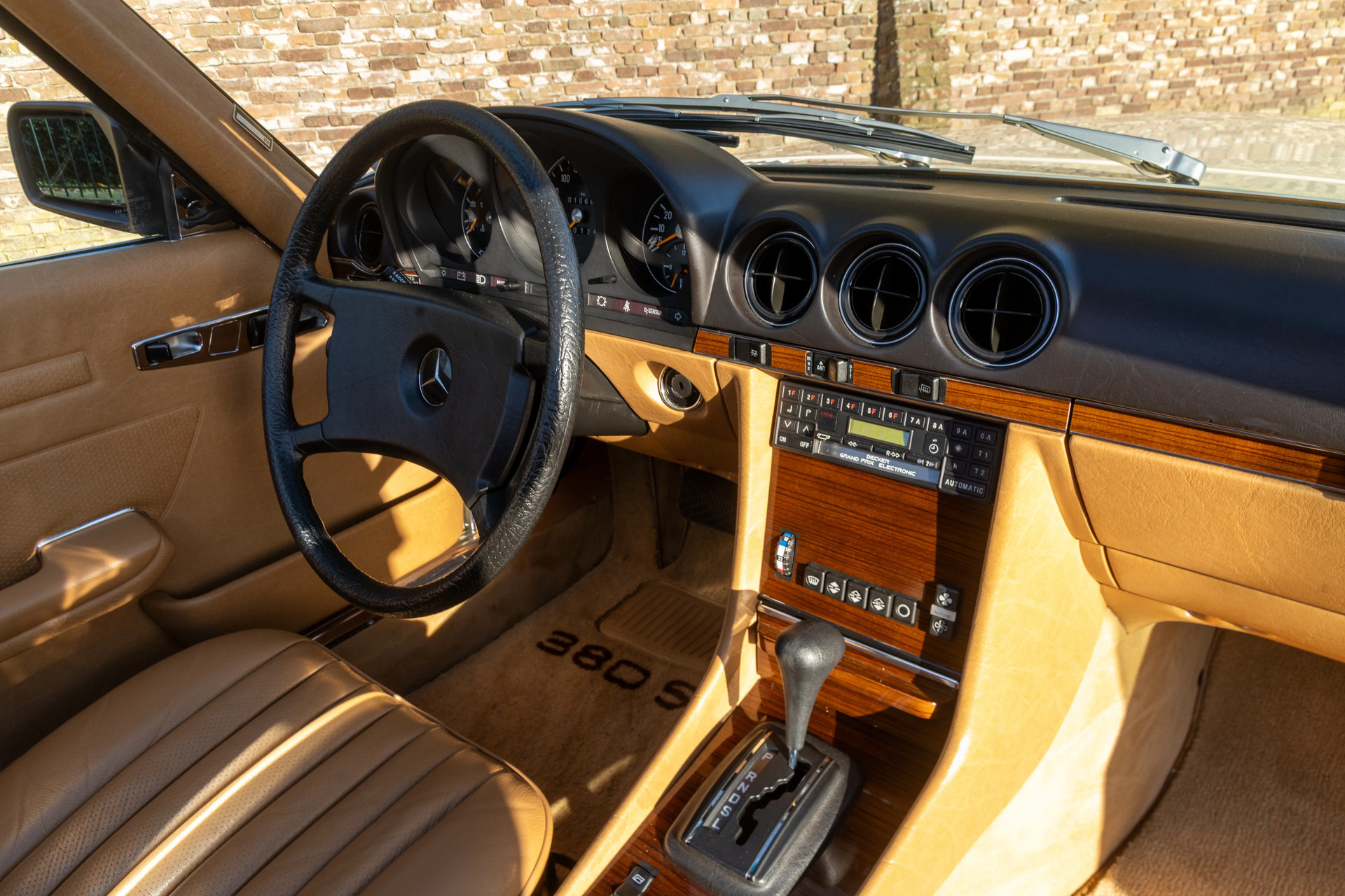 The color combination is a story in itself: finished in subtle yet distinctive Light Ivory, paired with a Palomino MB-Tex interior that shows virtually no signs of wear. It’s exactly the kind of specification that defines the early-1980s 380 SL—refined, understated, and absolutely timeless. Step inside and you immediately feel that unmistakable Mercedes aura: the solid click of the door, the restrained luxury, the materials that—over four decades later—still retain their original quality.
