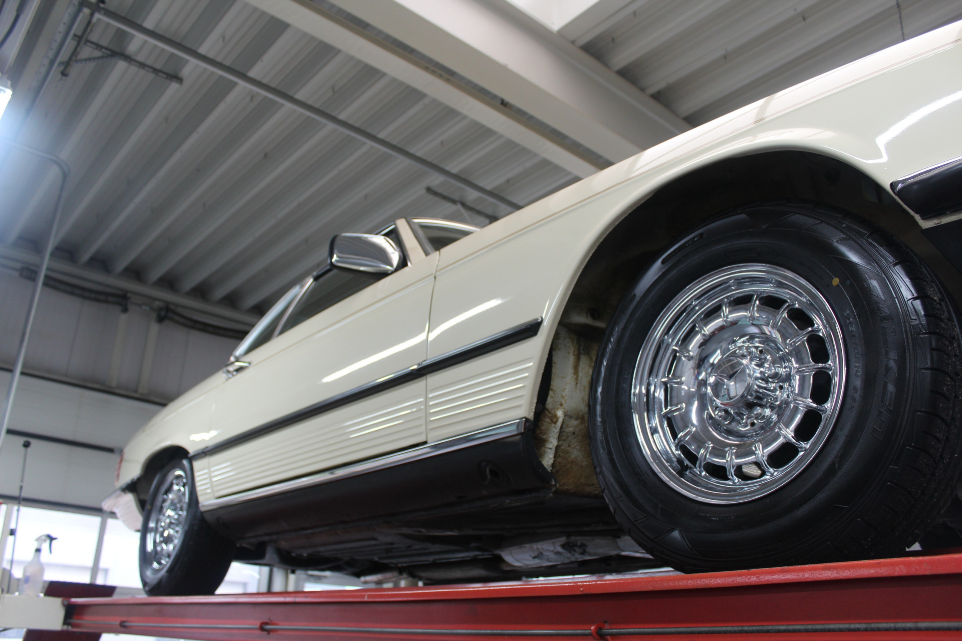 Dieser Mercedes wurde zudem kürzlich von einem spezialisierten deutschen SL-Experten auf europäische Spezifikation umgerüstet. Das bedeutet: die korrekten europäischen Scheinwerfer, die eleganten, schmalen Stoßfänger und ein insgesamt stimmigeres Erscheinungsbild, das dem ursprünglichen Design deutlich näherkommt. Ein großer Mehrwert – besonders für Kenner, die wissen, wie drastisch sich europäische und amerikanische Ausführungen optisch unterscheiden.