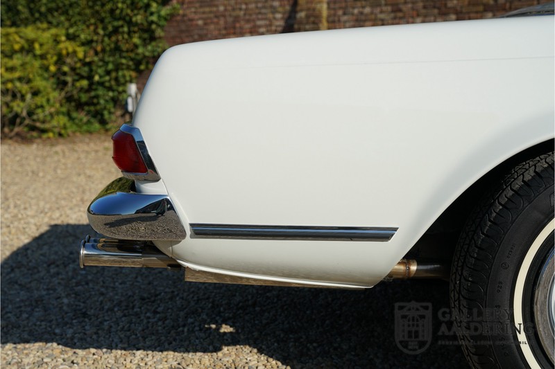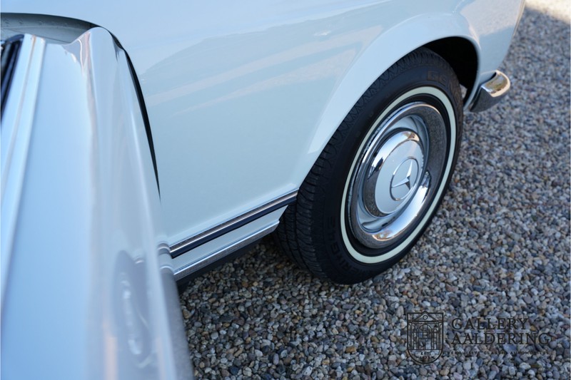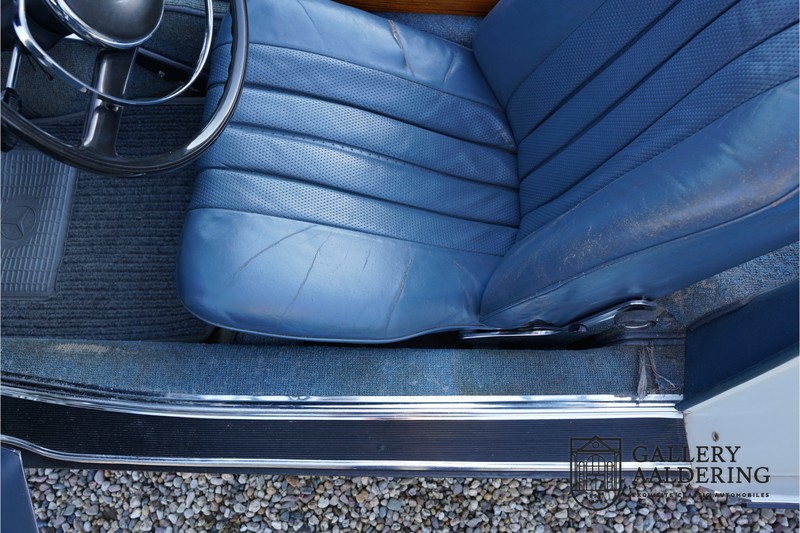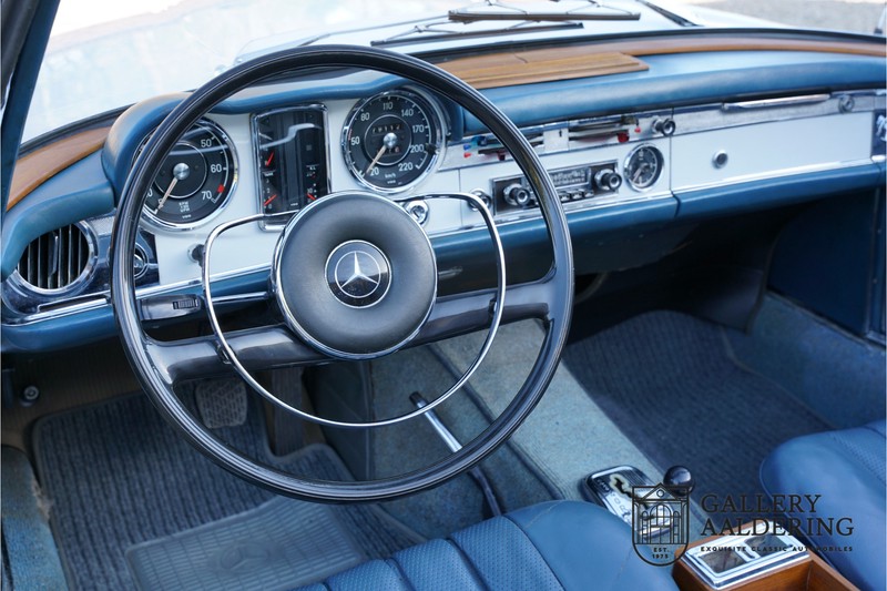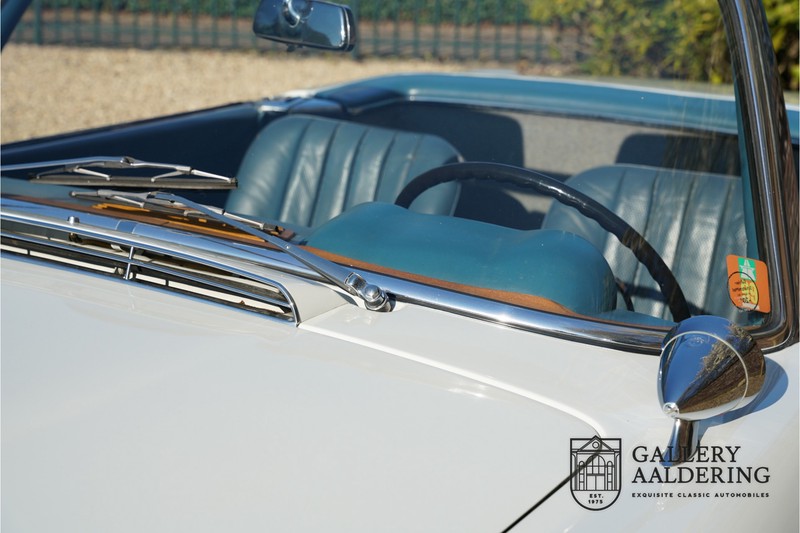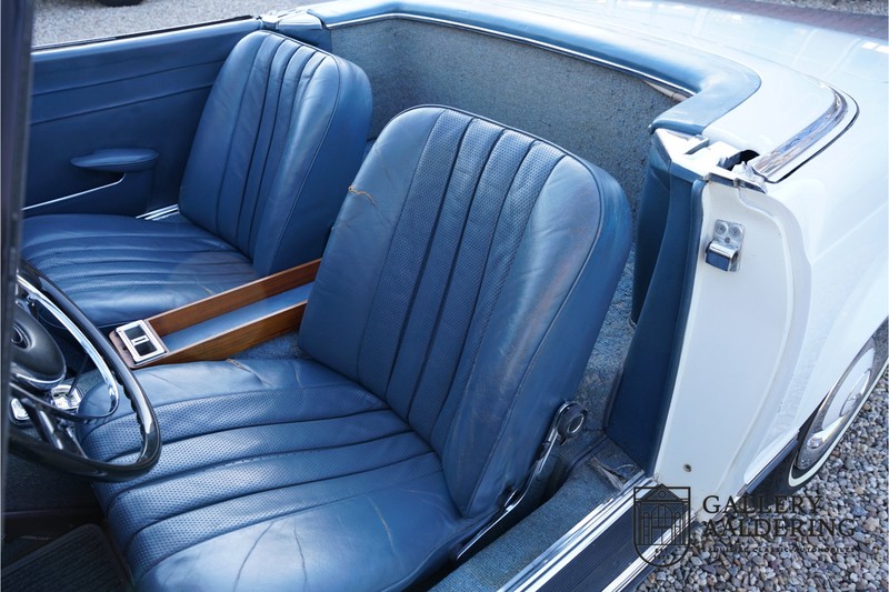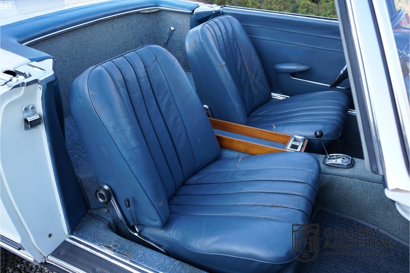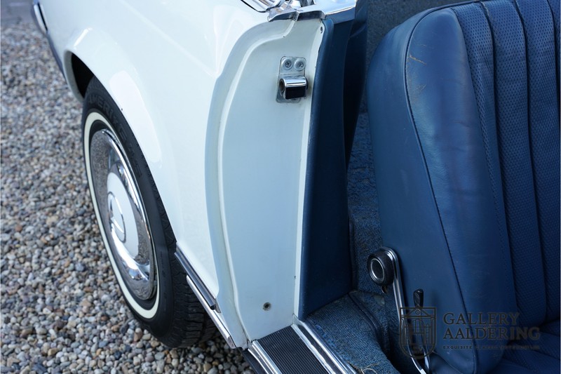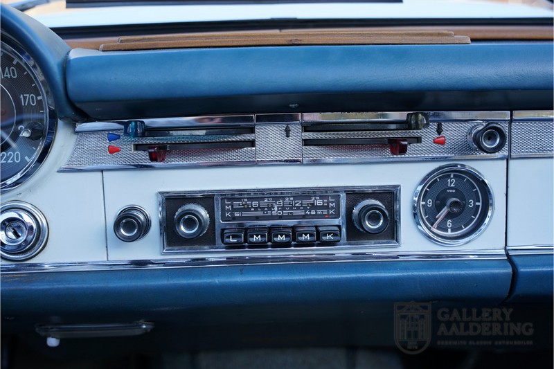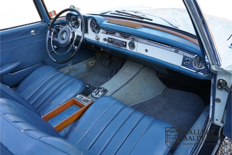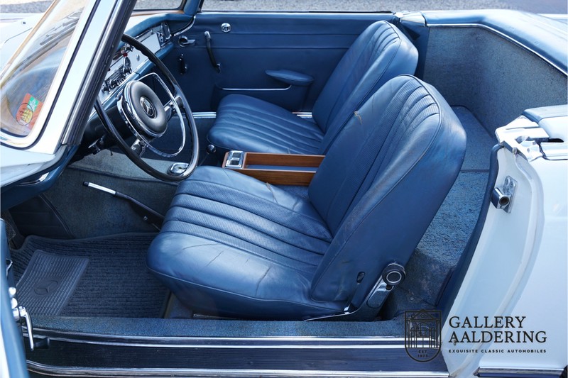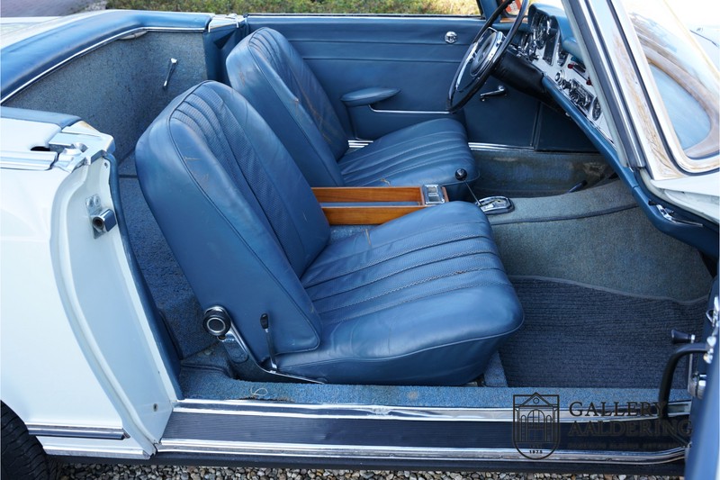 This one is in great shape. The car has been subjected to a full restoration in the past and has been well maintained ever since. This is the version that world-famous Mercedes-Benz engineer Rudolph Uhlenhaut was most proud of. The iconic M127 straight-six engine is attached to an automatic transmission, a first for an SL. The 230SL develops 150 PS with the engine being a direct derivative from the legendary M180 engine. This 230SL comes in a lovely colour combination of a white exterior and Medium blue interior. The bodywork is in good condition. The panelwork is nice and thin with correct alignment. The respray also included the hardtop. The paintwork is still very neat with minimal signs of use. The seat leather has a few small tears but still sits really well. We have already
