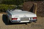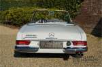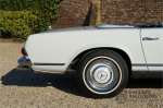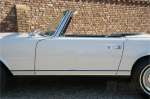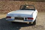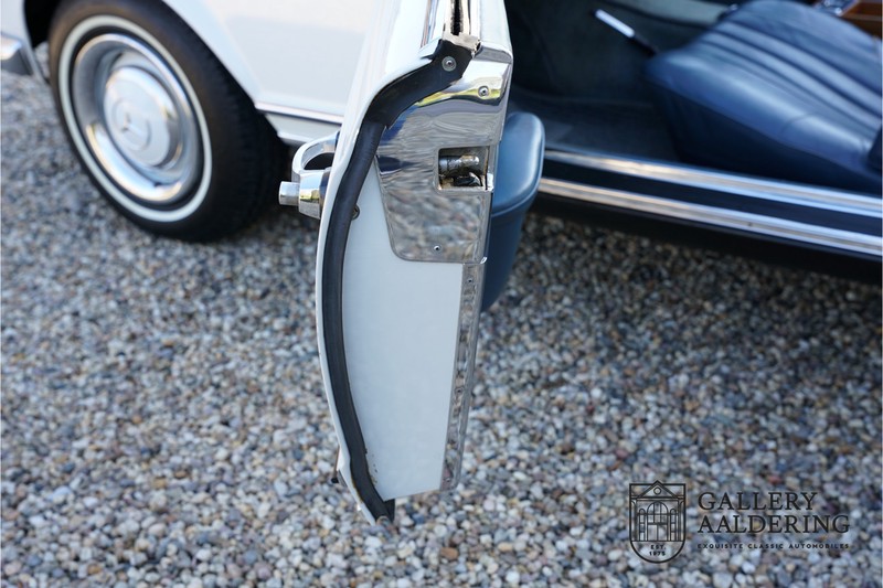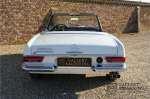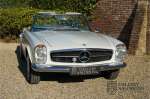 Deze mooie W113 Mercedes-Benz 230SL Pagode werd in 1965 voor het eerst toegelaten tot het verkeer. In 2000 kwam de auto naar Nederland en heeft sindsdien slechts twee eigenaren gehad. De W113 Pagode is een iconische klassieker. Vooral in de Verenigde Staten was het model een daverend verkoopsucces. Europees geleverde Pagodes zijn dan ook relatief schaars. Dit exemplaar verkeer in fraaie conditie. De auto is in het verleden al eens volledig gerestaureerd en sindsdien goed bijgehouden. Dit is de uitvoering waar de wereldberoemde Mercedes-Benz Engineer Rudolph Uhlenhaut het meest trots op was. De iconische M127 zes-in-lijn motor gekoppeld aan een automatische transmissie, voor het eerst in een SL. De 230SL heeft 150pk en de motor is een rechtstreeks afgeleide van de legendarische M180 motor. Deze 230SL is uitgevoerd in de fraaie kleurcombinatie van een wit exterieur gecombineerd met een Medium blue interieur. De carrosserie verkeert in goede conditie. Het plaatwerk is mooi dun en de passingen zijn correct. De witte lak is tijdens de restauratie compleet opnieuw gespoten waarbij ook de hardtop niet is vergeten. De lak heeft wat sporen van gebruik maar is erg netjes. Het leder op de stoelen heeft wat lichte scheuren maar de stoelen zitten nog steeds erg goed. Het leder is door ons rigoureus onder handen genomen en inmiddels weer heerlijk soepel, op deze manier kunt u er nog jaren plezier van hebben. Het dashboard en de tapijten zijn verder zeer netjes.
