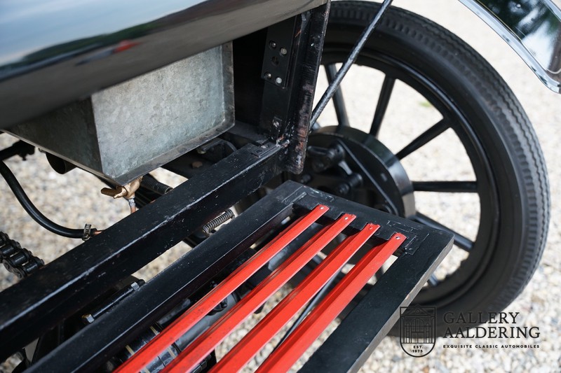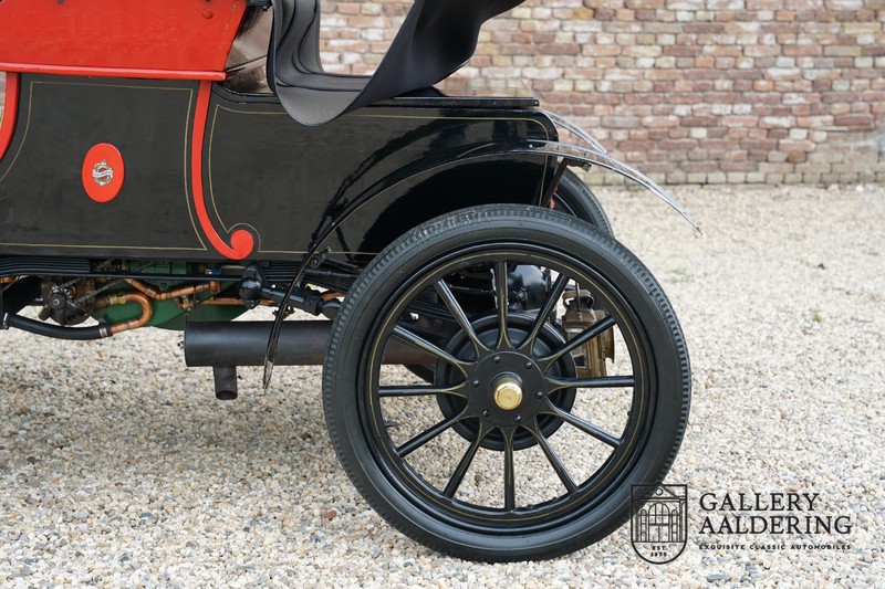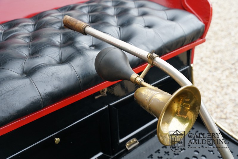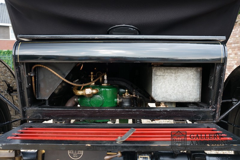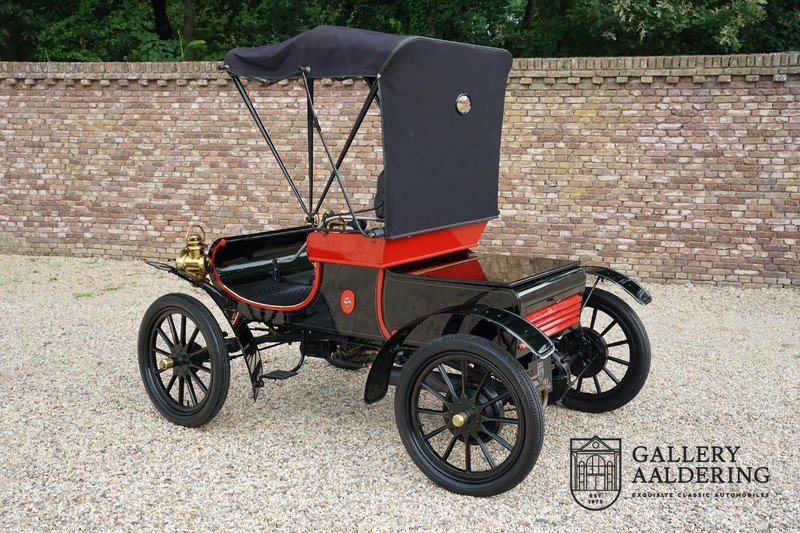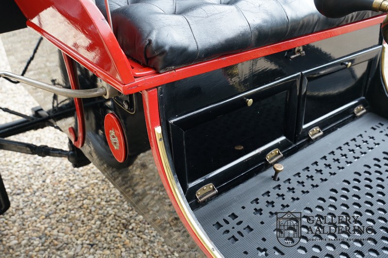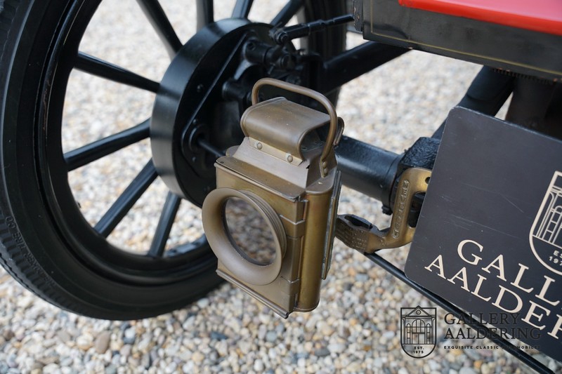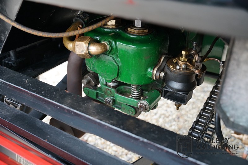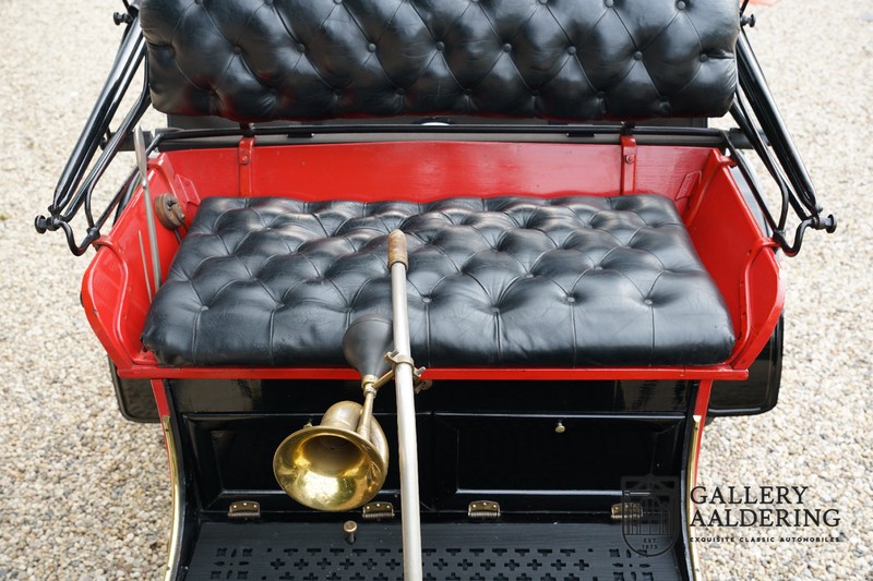 Fahrzeuge welche nicht geeignet waren für Langstrecken. Es gab Platz für zwei Personen und das Lenken geschah über eine Lenkstange, welche direkt verbunden war mit den Vorderrädern. Der Motor wurde komplett revidiert und hat viele wunderschöne Kupferteile, ein wunderschönes Stück handwerklicher Technik. So etwas sieht man heutzutage nicht mehr. Der 1-Zylinder Motor ist über eine Kette verbunden mit den Hinterrädern. Hupen macht man mit der typischen Hupe an der Lenkstange. Die Karosserie befindet sich in einem wunderschönen Zustand und wurde in der Farbe lackiert als das damalige Prototype von dem Oldsmobile 6C.