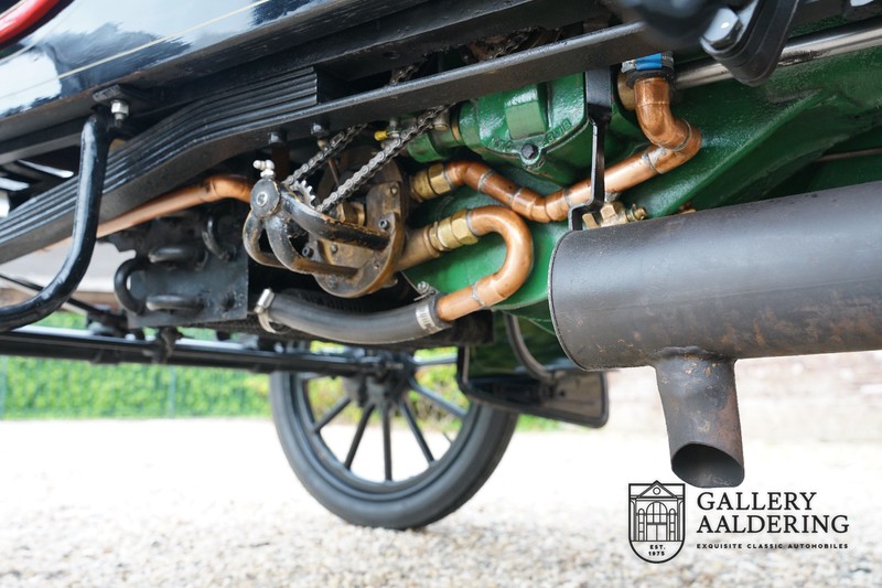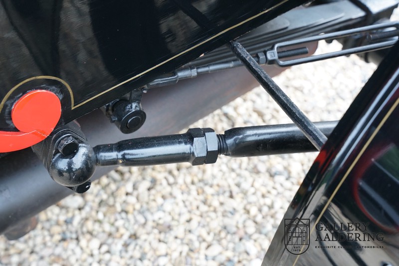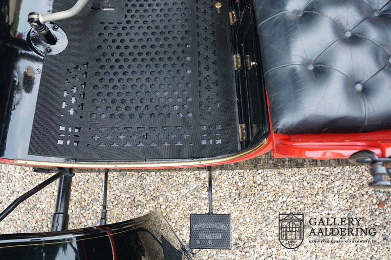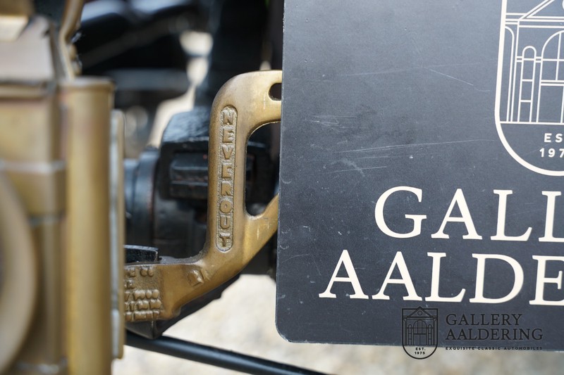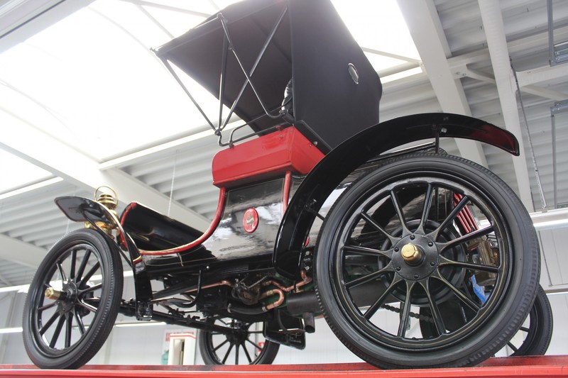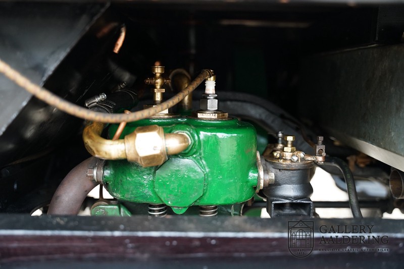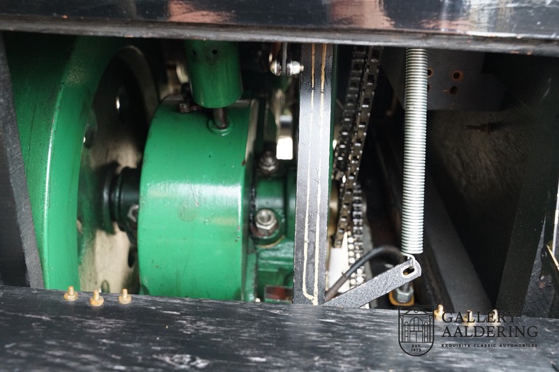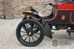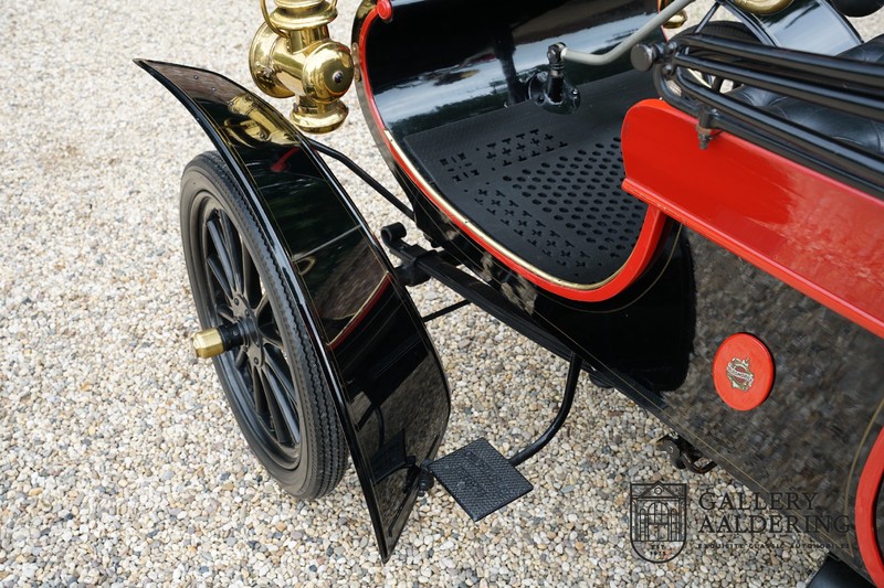 Fahrzeuge welche nicht geeignet waren für Langstrecken. Es gab Platz für zwei Personen und das Lenken geschah über eine Lenkstange, welche direkt verbunden war mit den Vorderrädern. Der Motor wurde komplett revidiert und hat viele wunderschöne Kupferteile, ein wunderschönes Stück handwerklicher Technik. So etwas sieht man heutzutage nicht mehr. Der 1-Zylinder Motor ist über eine Kette verbunden mit den Hinterrädern. Hupen macht man mit der typischen Hupe an der Lenkstange. Die Karosserie befindet sich in einem wunderschönen Zustand und wurde in der Farbe lackiert als das damalige Prototype von dem Oldsmobile 6C.