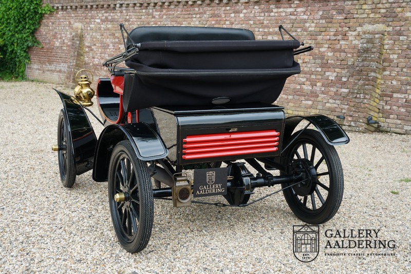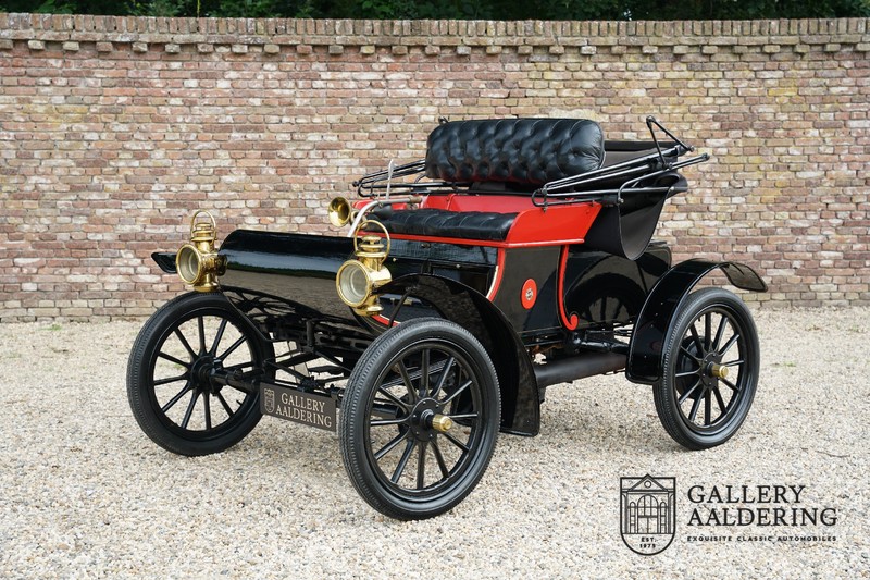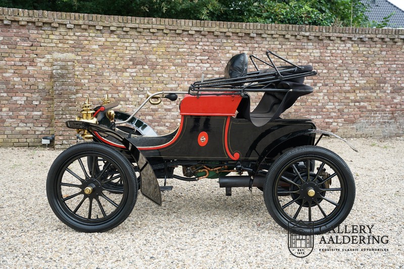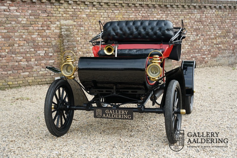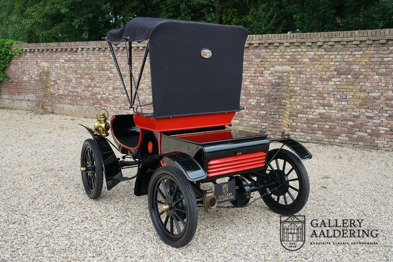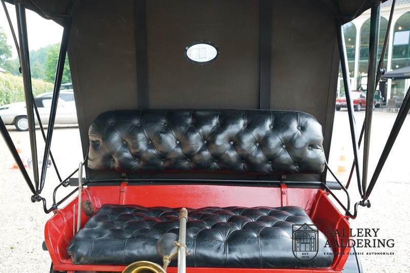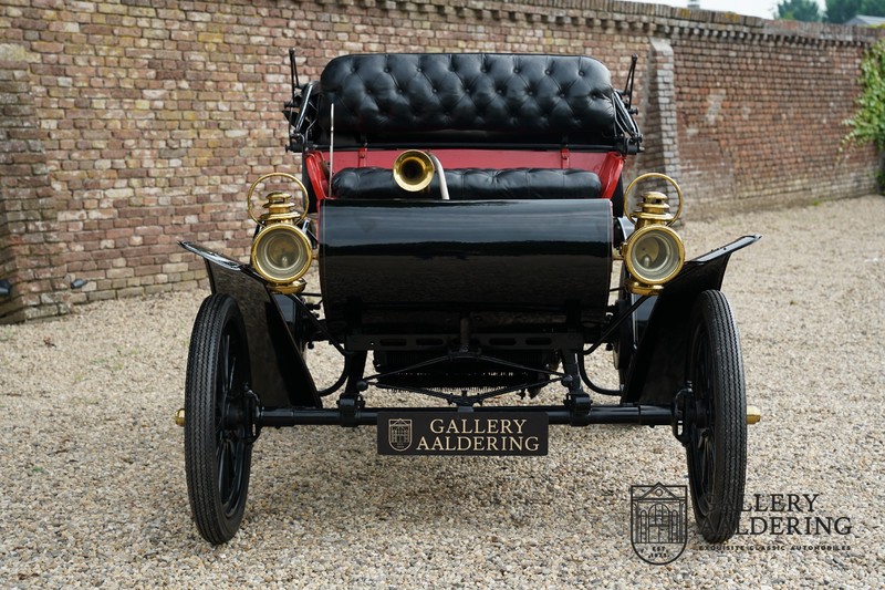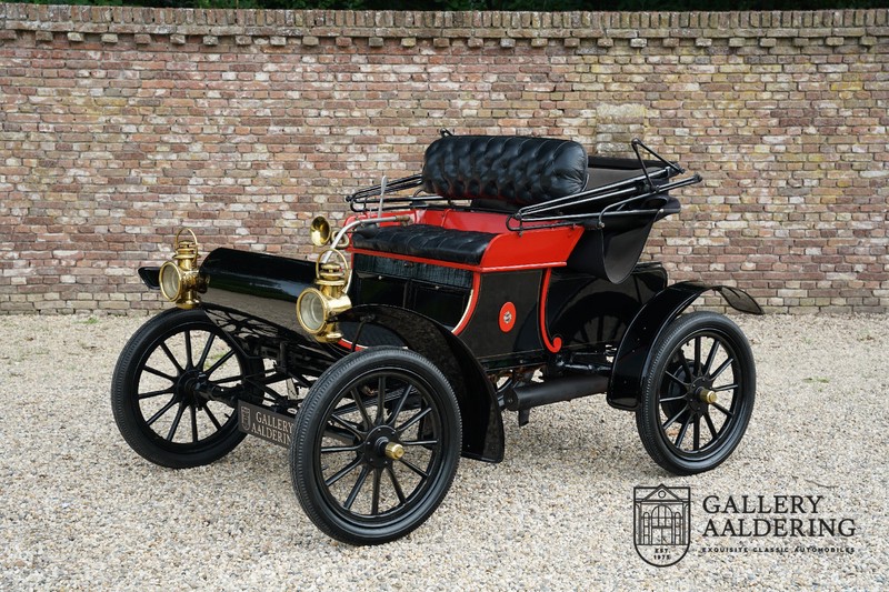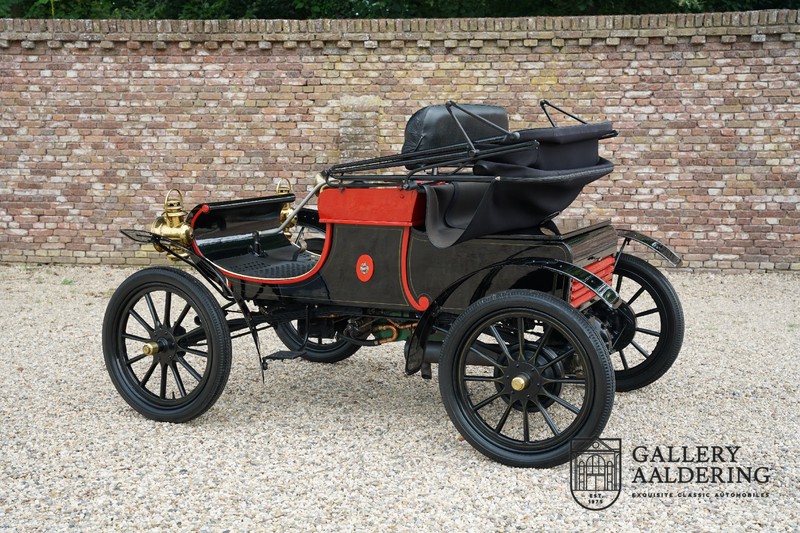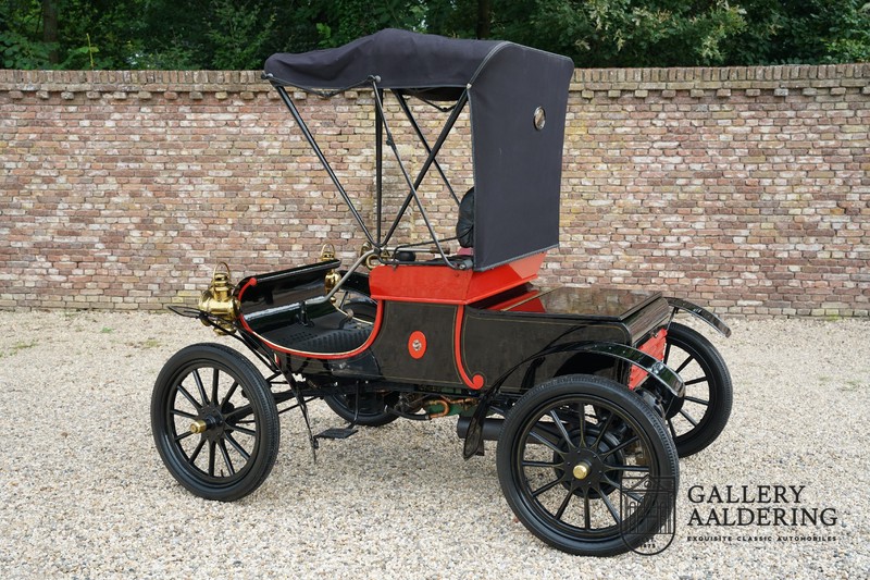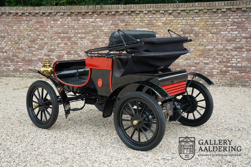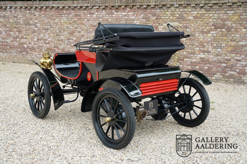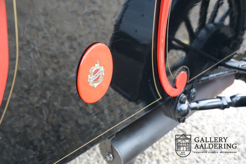Dit exemplaar verkeert in prachtige gerestaureerde staat. De Oldsmobile 6C wordt ook wel “Curved Dashboard genoemd. Eigenlijk leken alle vroege auto’s op een koets waar geen paard voor kon, de Oldsmobile 6C is op deze regel zeker geen uitzondering en is dan ook met niets te vergelijken met wat we tegenwoordig op straat zien. Dit soort auto’s werden “Runabout’s” genoemd, niet echt geschikt voor het afleggen van grote afstanden maar vooral voor gebruik in de stad. De auto biedt plek aan twee personen en sturen gebeurt middels een stang die rechtstreeks is verbonden met de voorwielen. De motor is volledig gereviseerd en is rijkelijk voorzien van koperen onderdelen. Het is een prachtig stukje ambachtelijke techniek zoals we dat vandaag de dag simpelweg niet meer zien. De ééncilindermotor levert zijn vermogen via een ketting naar de achterwielen en is voorzien van een transmissie met twee versnellingen. Toeteren doet u middels een karakteristieke toeter aan de stuurstang. De carrosserie verkeert in prachtige staat en is tijdens de restauratie in dezelfde kleurstelling gespoten als het prototype van de Oldsmobile 6C.