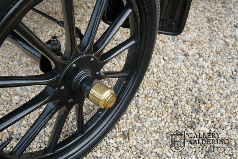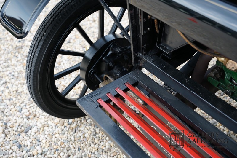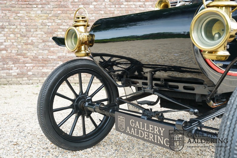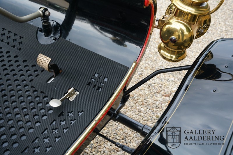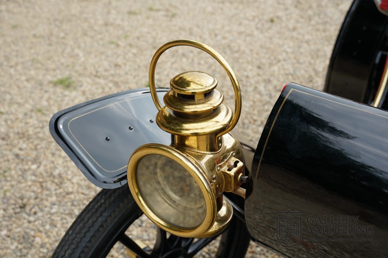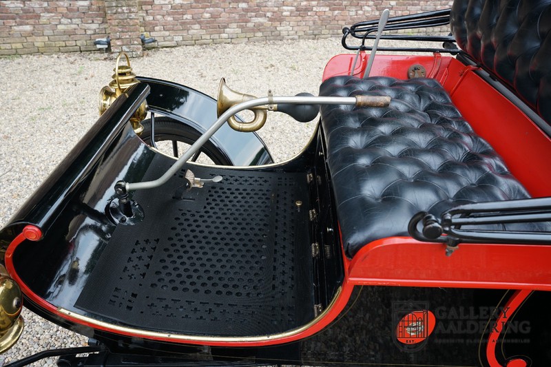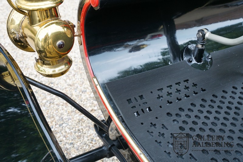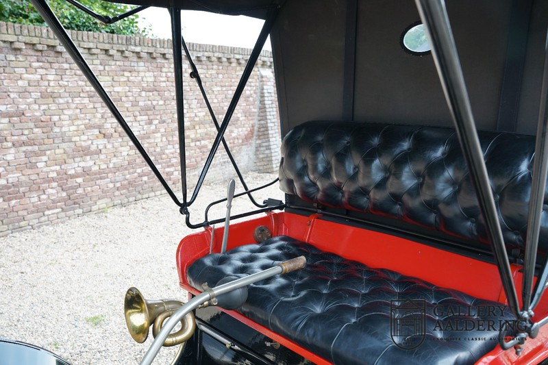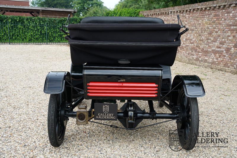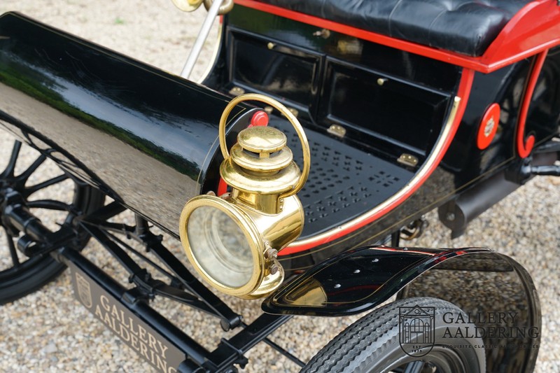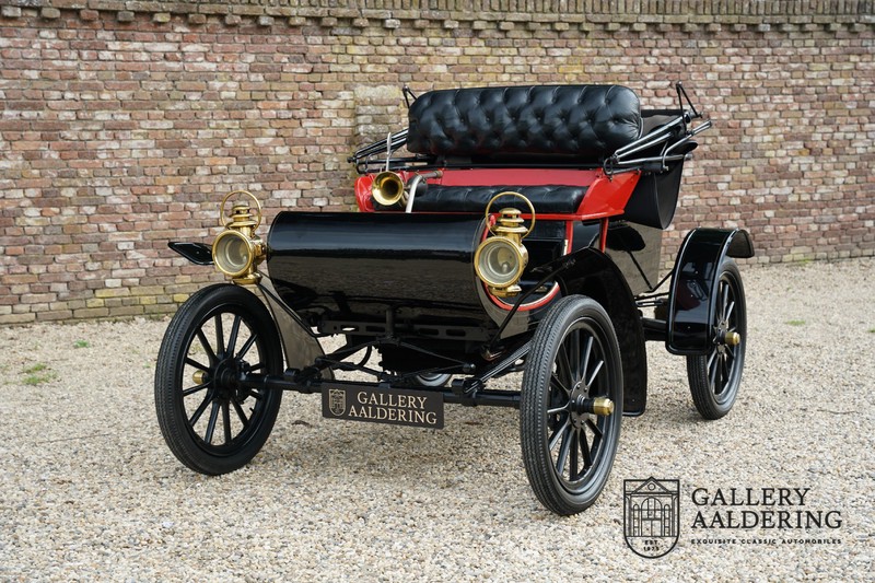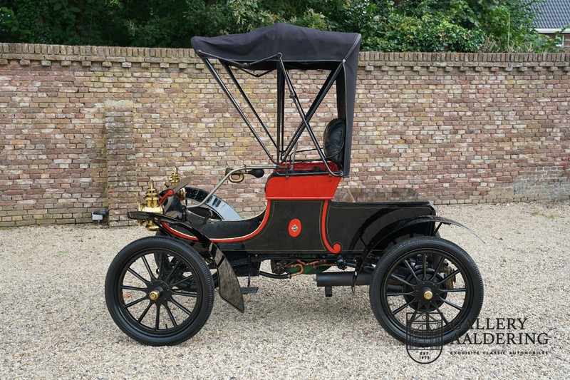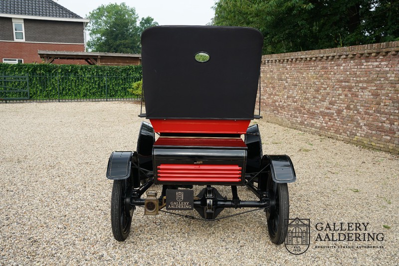 Dit exemplaar verkeert in prachtige gerestaureerde staat. De Oldsmobile 6C wordt ook wel “Curved Dashboard genoemd. Eigenlijk leken alle vroege auto’s op een koets waar geen paard voor kon, de Oldsmobile 6C is op deze regel zeker geen uitzondering en is dan ook met niets te vergelijken met wat we tegenwoordig op straat zien. Dit soort auto’s werden “Runabout’s” genoemd, niet echt geschikt voor het afleggen van grote afstanden maar vooral voor gebruik in de stad. De auto biedt plek aan twee personen en sturen gebeurt middels een stang die rechtstreeks is verbonden met de voorwielen. De motor is volledig gereviseerd en is rijkelijk voorzien van koperen onderdelen. Het is een prachtig stukje ambachtelijke techniek zoals we dat vandaag de dag simpelweg niet meer zien. De ééncilindermotor levert zijn vermogen via een ketting naar de achterwielen en is voorzien van een transmissie met twee versnellingen. Toeteren doet u middels een karakteristieke toeter aan de stuurstang. De carrosserie verkeert in prachtige staat en is tijdens de restauratie in dezelfde kleurstelling gespoten als het prototype van de Oldsmobile 6C.