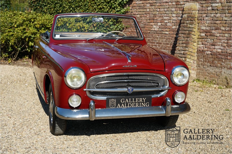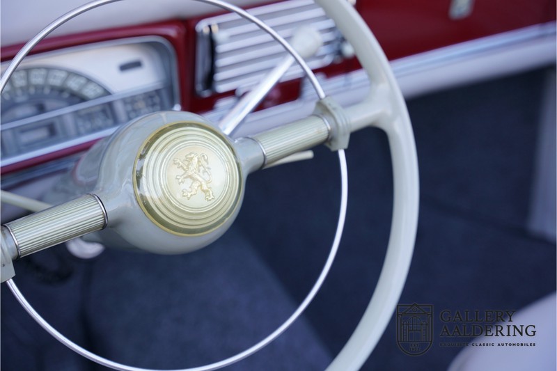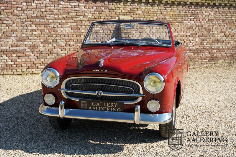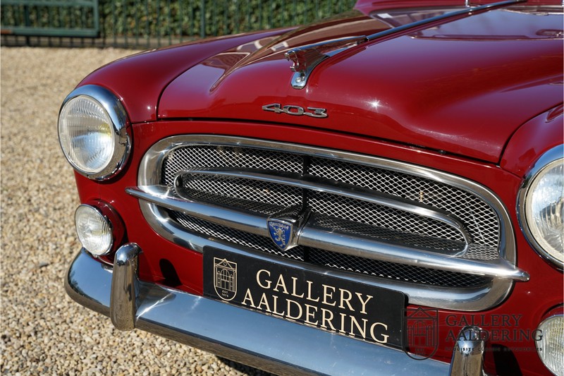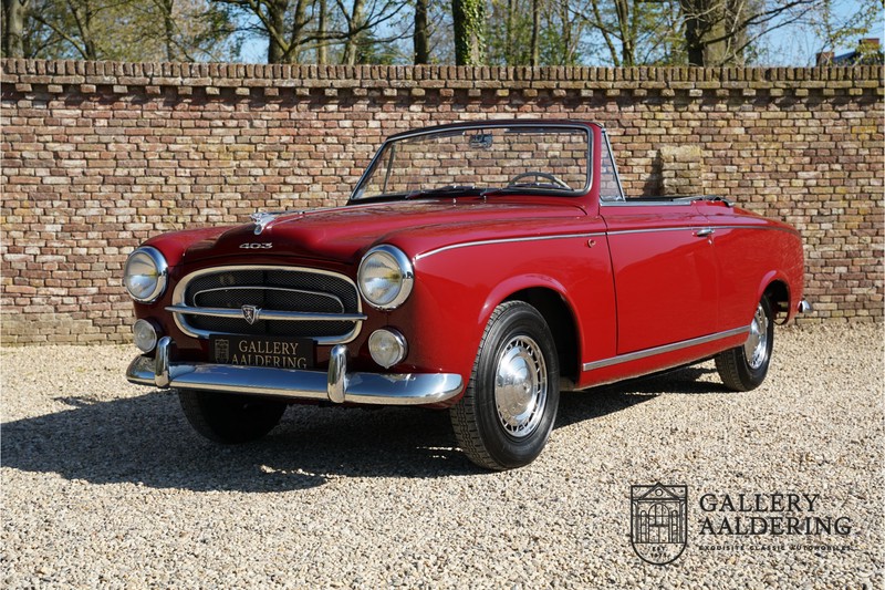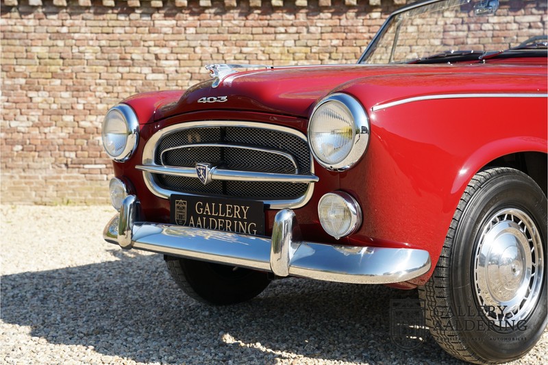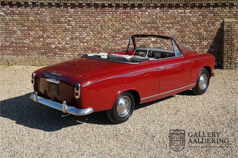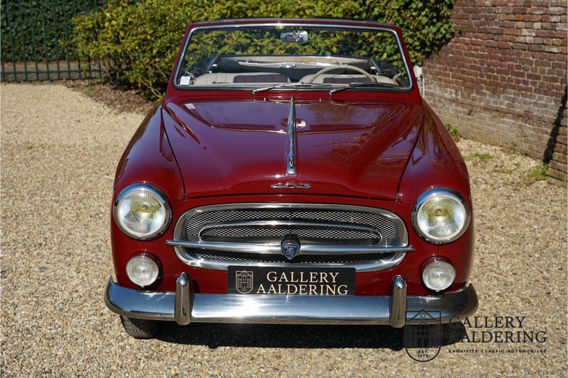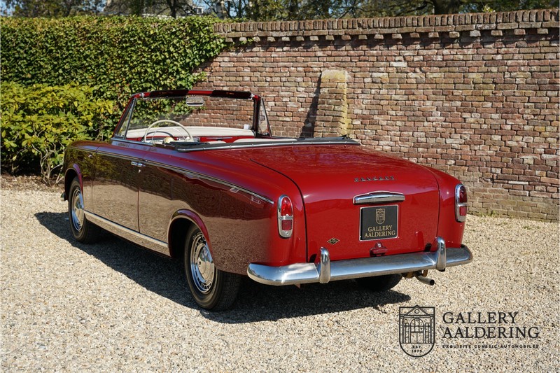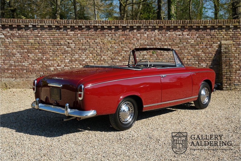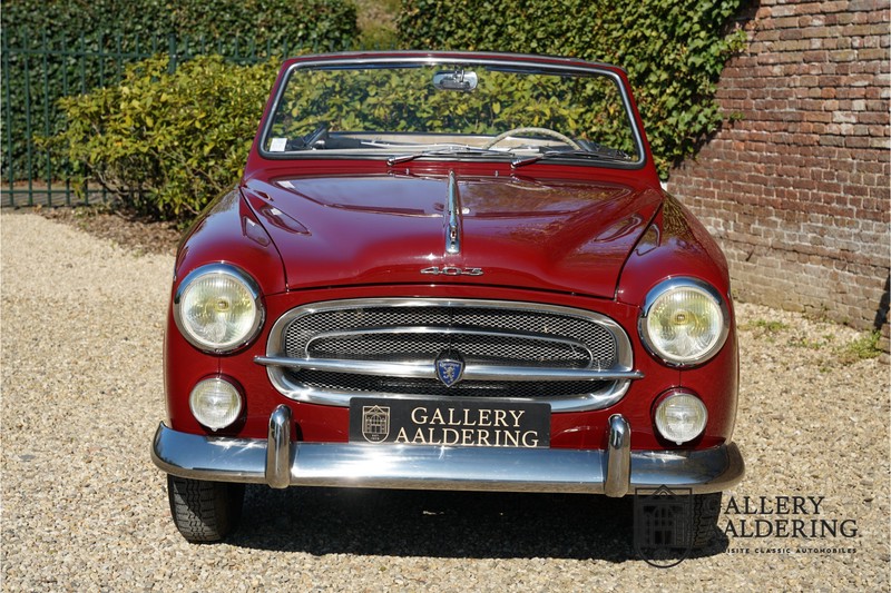 Als je kijkt naar de totale verkoopaantallen van de Peugeot 403 dan is het aandeel van de 403 cabriolet zeer minimaal. Tussen 1955 en 1965 verkocht Peugeot 1,2 miljoen 403’s. Slechts 2.043 daarvan waren een 403 Cabriolet. De 403 werd in tegenstelling tot de meeste Peugeots uit die tijd in Italië bij Pininfarina gebouwd. Pininfarina tekende voor het ontwerp en mocht de auto tevens bouwen. De 403 Cabriolet was bovendien de start van een zeer langdurige relatie tussen het Italiaanse designhuis en de Franse autobouwer die tot en met de beeldschone 406 coupé zou duren. De relatief lage verkoopaantallen waren eigenlijk een rechtstreeks gevolg van de forse meerprijs ten opzichte van een gewone 403. Voor de prijs van een 403 cabriolet kon je bijna twee gewone 403’s kopen. In de jaren ’70 kreeg de bekendheid van de 403 Cabriolet nog een impuls dankzij de hit-serie Colombo. De populariteit van het model was in de jaren daarna echter tanende en dientengevolge zijn er maar weinig exemplaren van de 403 Cabriolet bewaard gebleven. Volgens de kenners zouden het er in het ongunstigste geval minder dan 200 kunnen zijn! Dit exemplaar uit 1964 is volledig gerestaureerd en verkeert in goede conditie. De auto heeft altijd in warme oorden rondgereden en daarom hoefde er nog nooit aan het chassis te worden gelast. De foto’s van de onderzijde bevestigen dit.