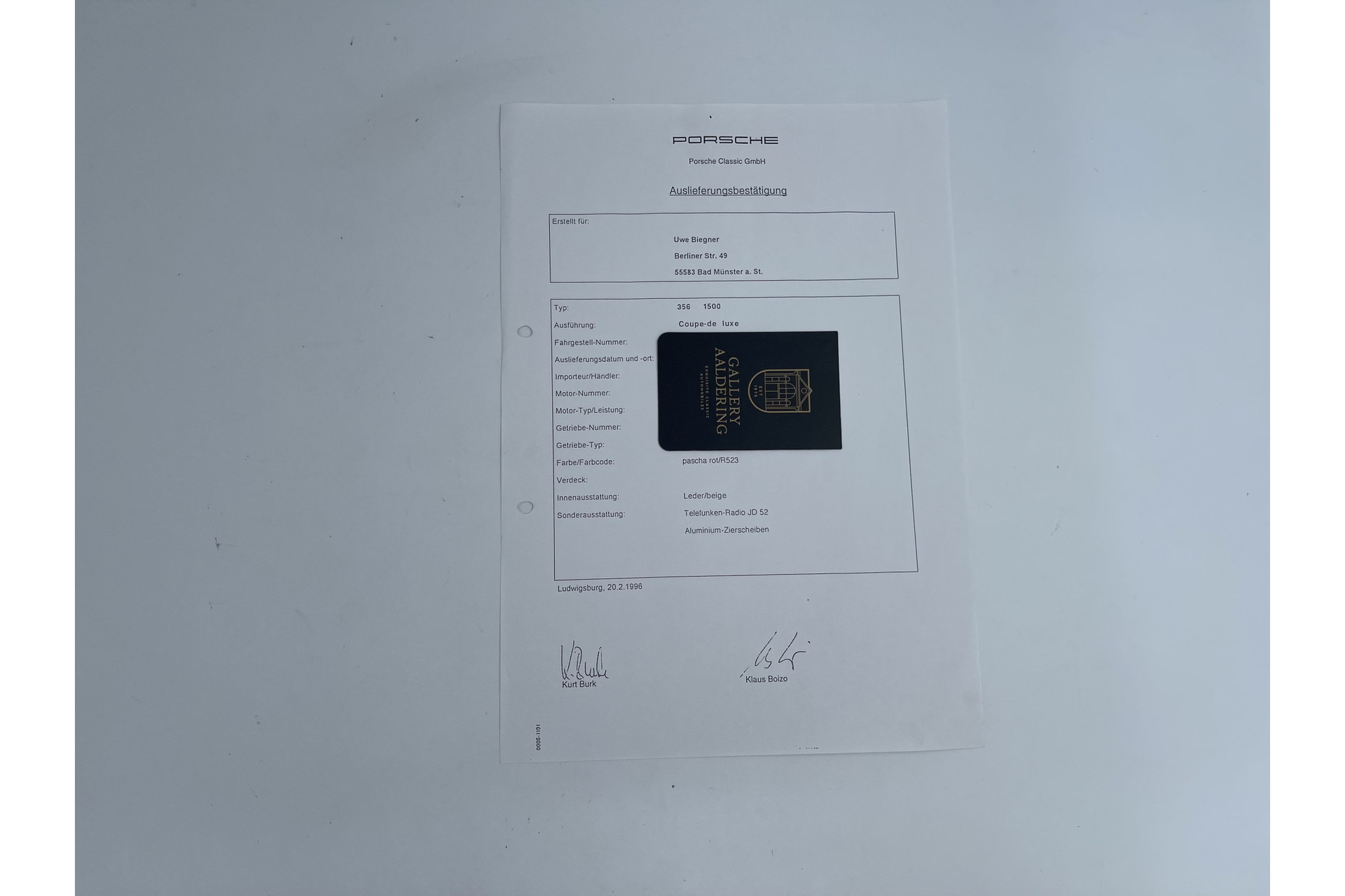 Dieses Exemplar ist außergewöhnlich gut dokumentiert – lückenlos von 1956 bis heute. Mit zahlreichen Fotos, Rechnungen und sogar den originalen Porsche-Broschüren jener Zeit. Eine solche Dokumentation ist äußerst selten. Werfen Sie gern einen Blick auf unsere Website für einen ersten Eindruck.