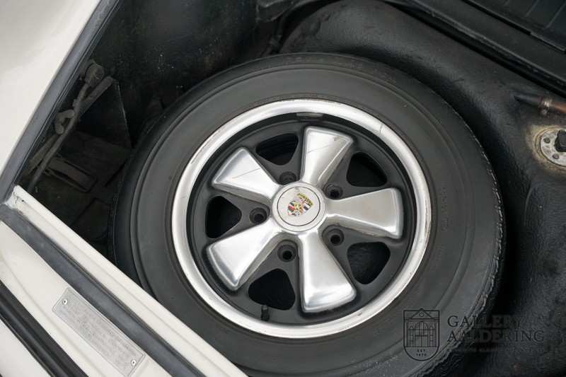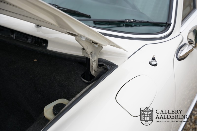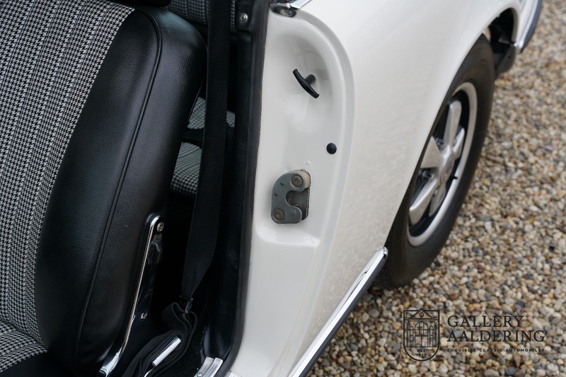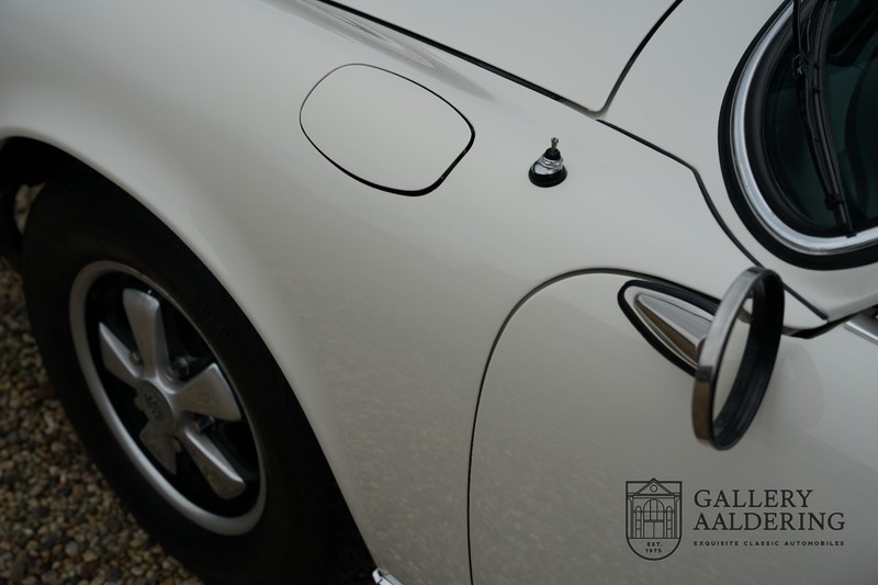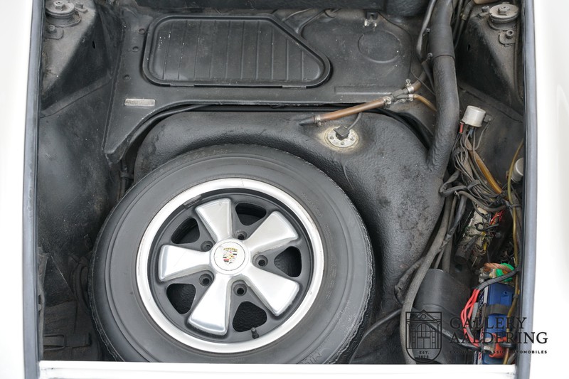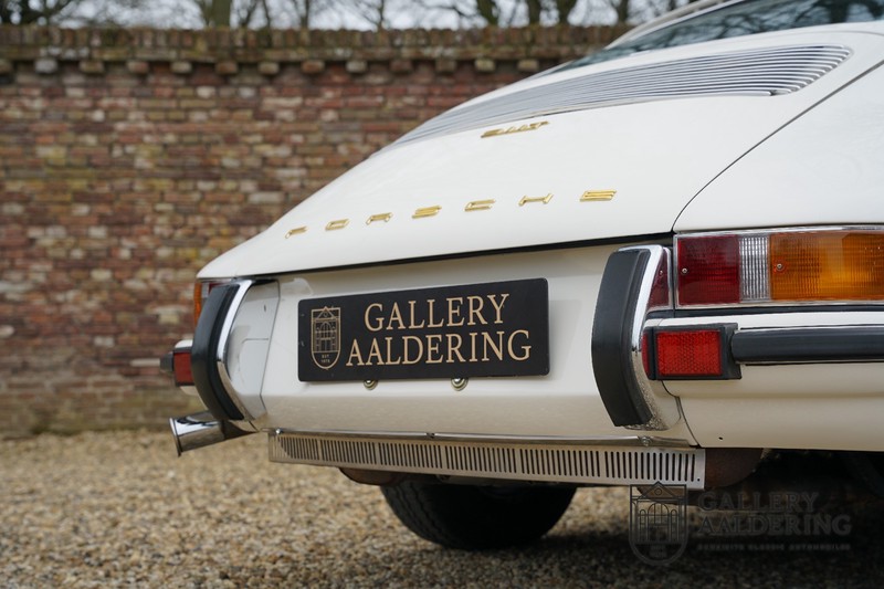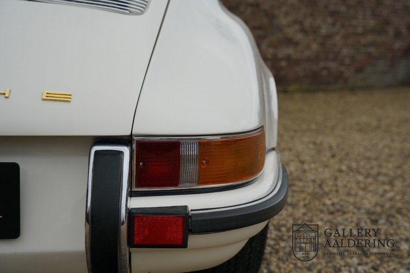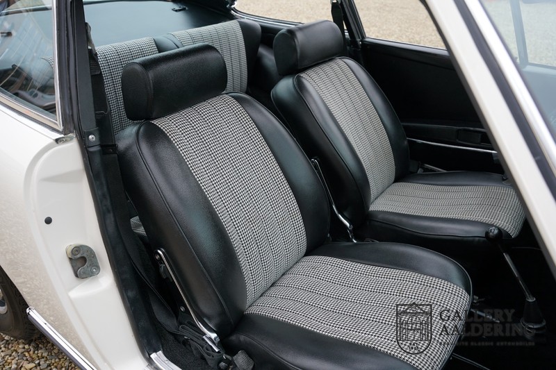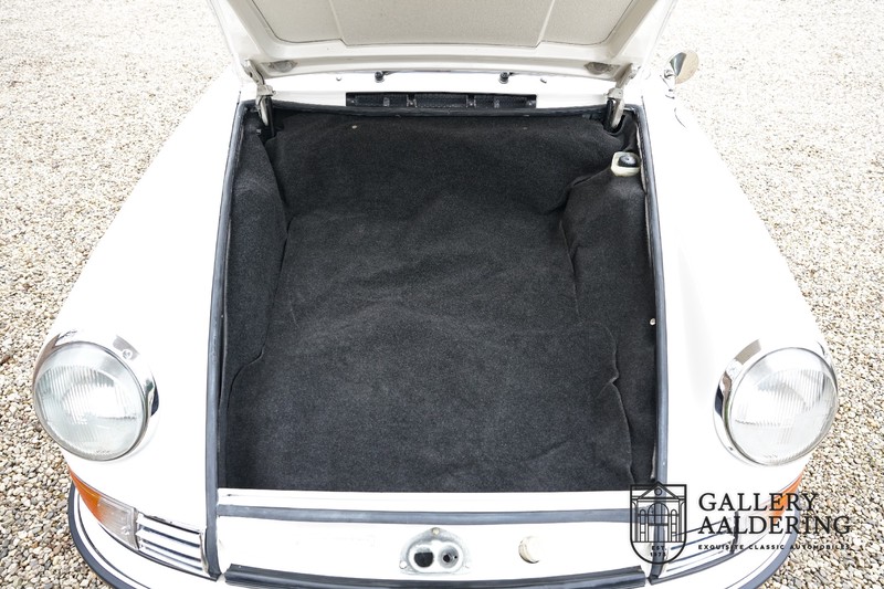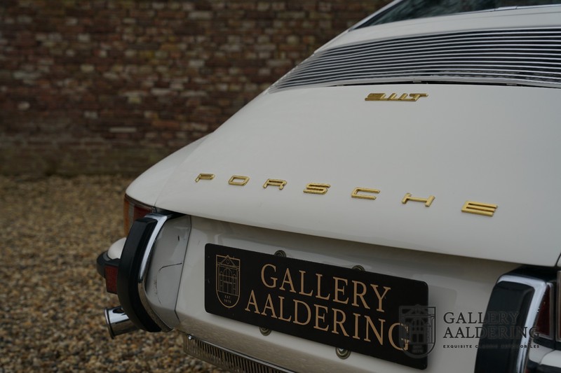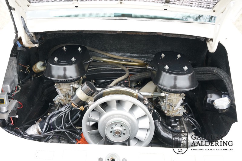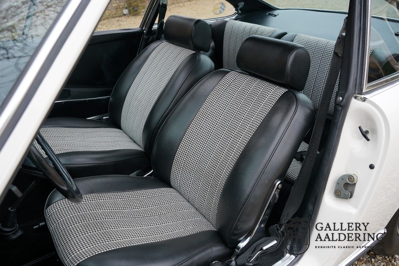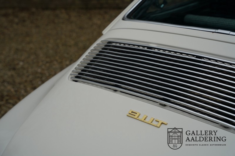 Dieser wunderschöne Porsche 911 2.2 T stammt aus dem Jahr 1970 und wurde vor einigen Jahren restauriert und revidiert. Die Karosserie hat schöne Passungen und ist sehr glatt, auch die Lackierung ist sehr schön! Der makellose Unterboden ist absolut rostfrei. Die Technik ist tipptopp in Ordnung und der Porsche fährt und funktioniert dementsprechend ausgezeichnet. Die Karosseriefarbe Weiß wird kombiniert mit einem schwarzen pepita Interieur, eine schicke Kombination. Das Fahrzeug hat ab Werk verschiedene seltene Optionen, wie z.B. ein elektrisch bedienbares Schiebedach, eine Stabilisierungsvorrichtung und das Komfort Paket. Das Auto ist von Porsche zertifiziert worden, der 2.2 T Motor ist original und hat also “Matching Numbers“. Ein sehr schöner Porsche 911 mit einer attraktiver Farbkombination und einem Schiebedach.