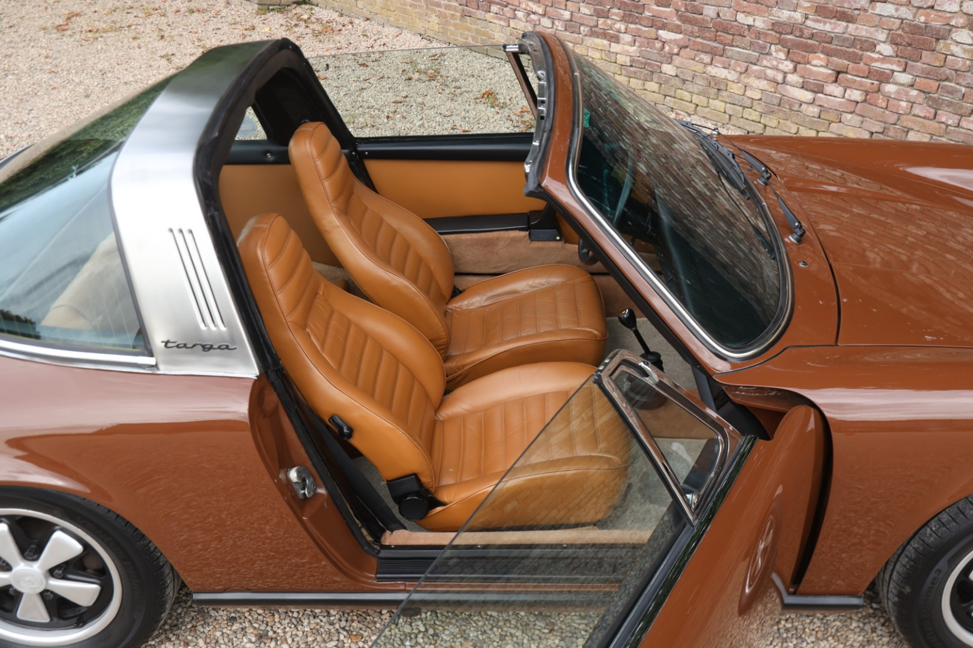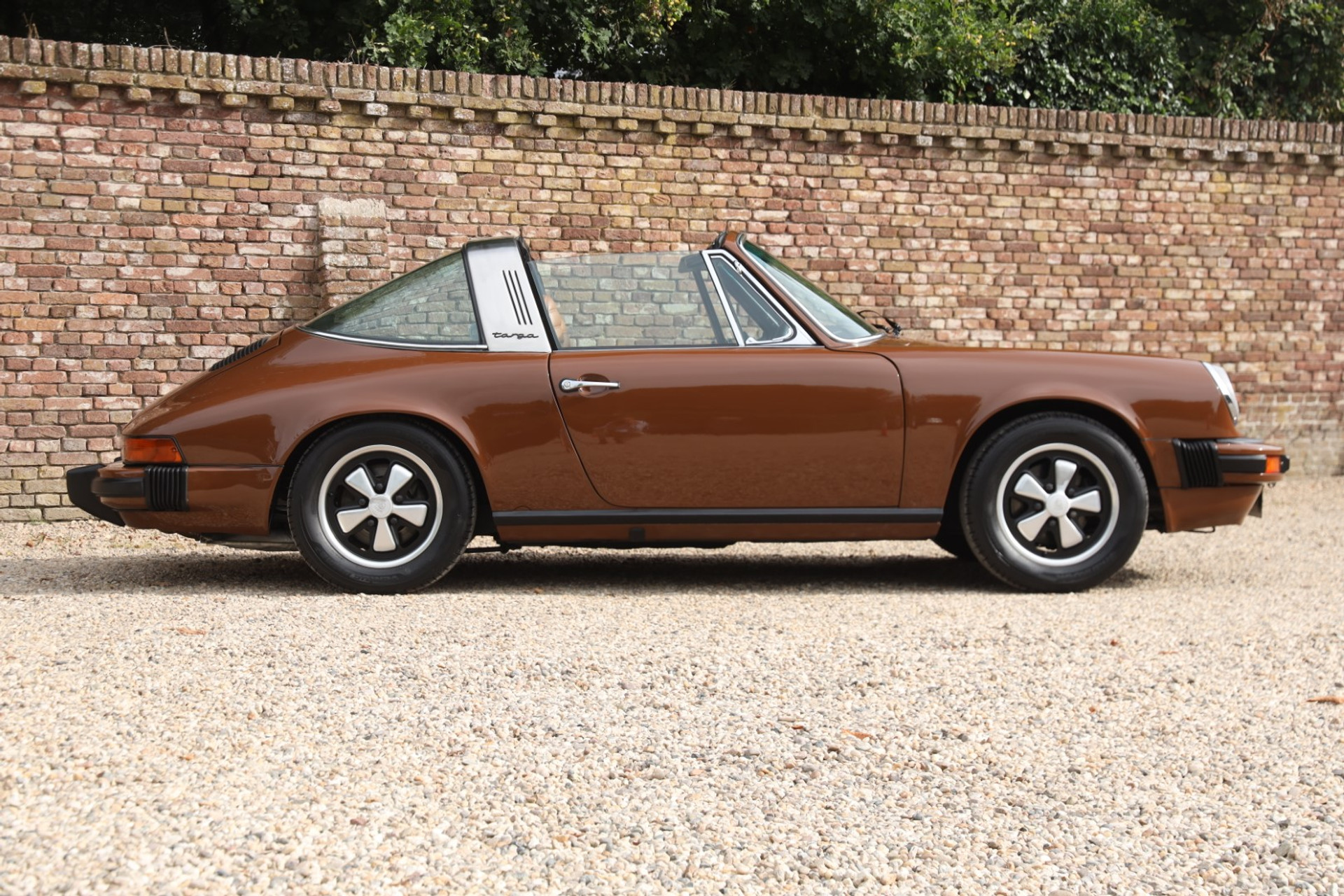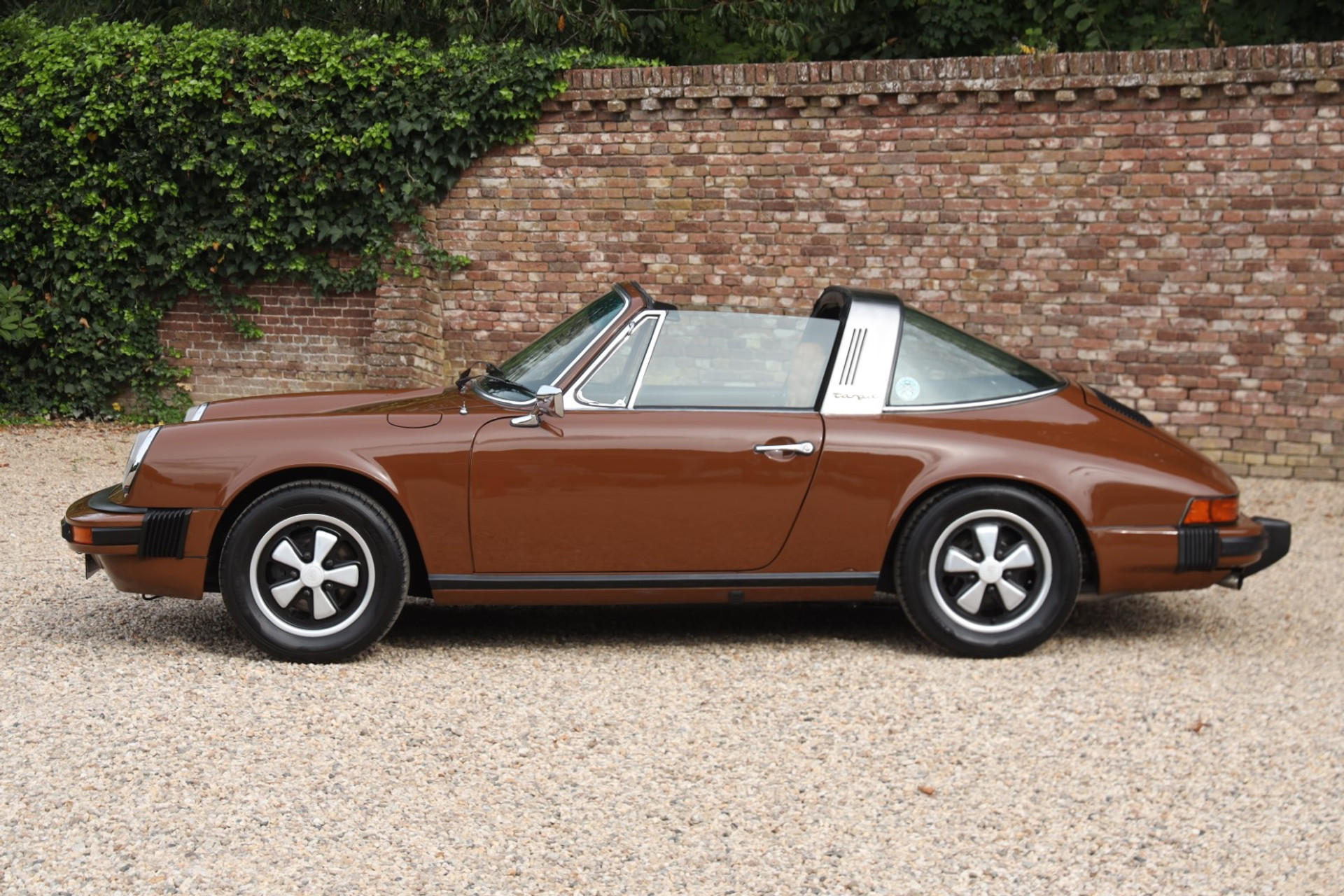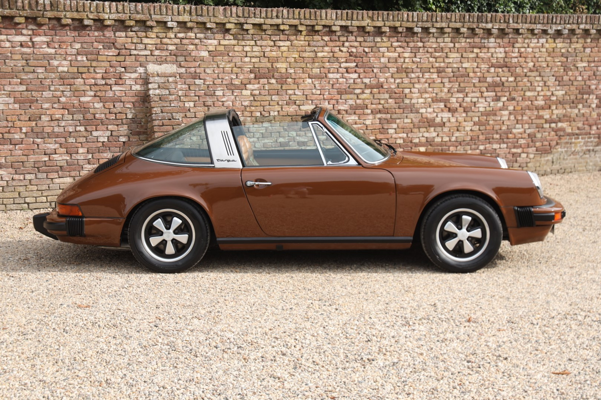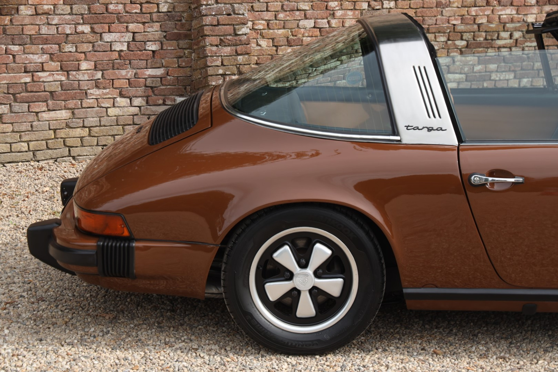 Neem even afstand en kijk ernaar: de carrosserie is prachtig recht, de lak is keurig en correct aangebracht en hij staat trots op die iconische Fuchs-velgen. De houding is precies zoals het hoort, puur klassiek 911. Hij oogt precies zoals een Targa uit het midden van de jaren zeventig eruit moet zien: doelgericht, elegant en tijdloos.