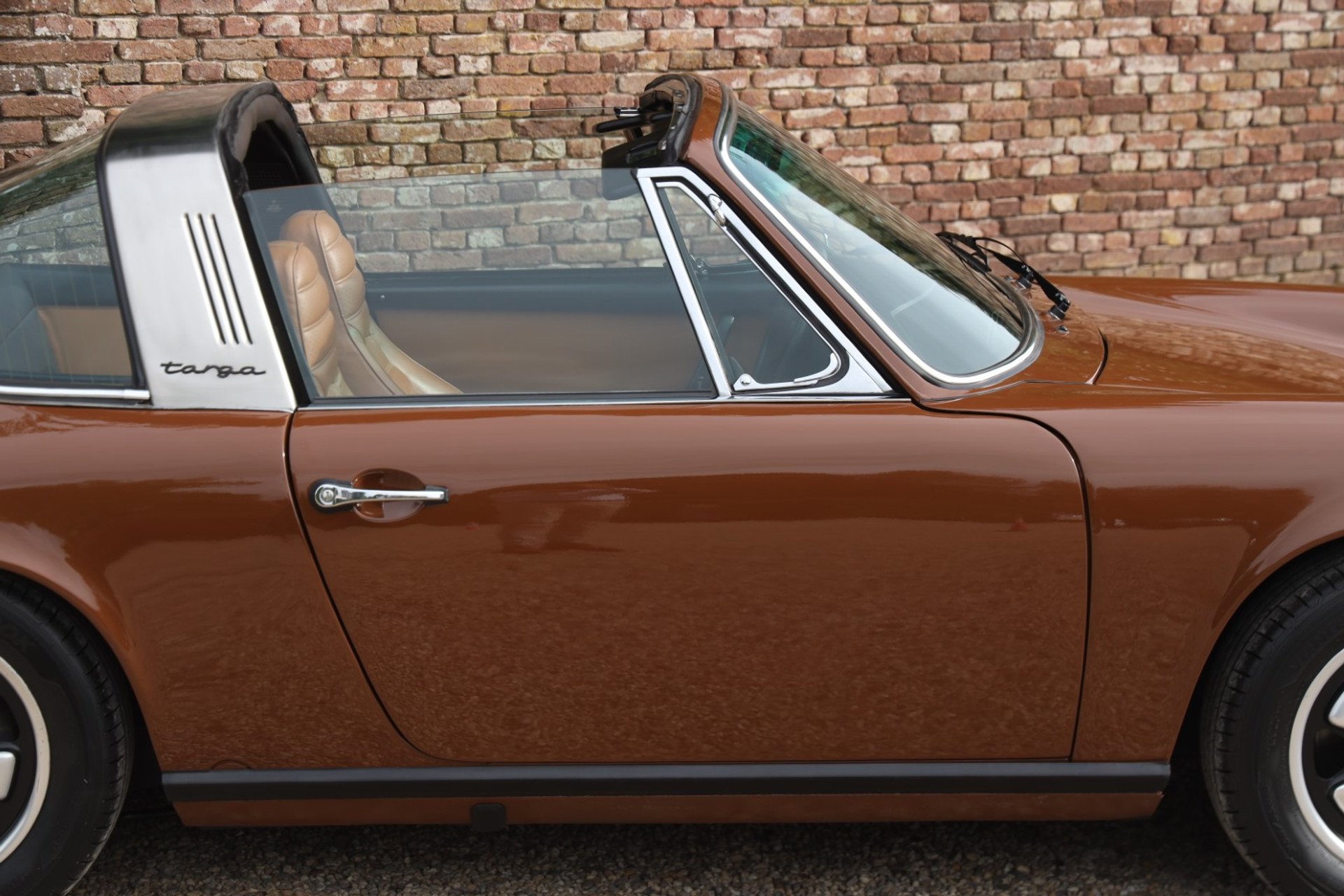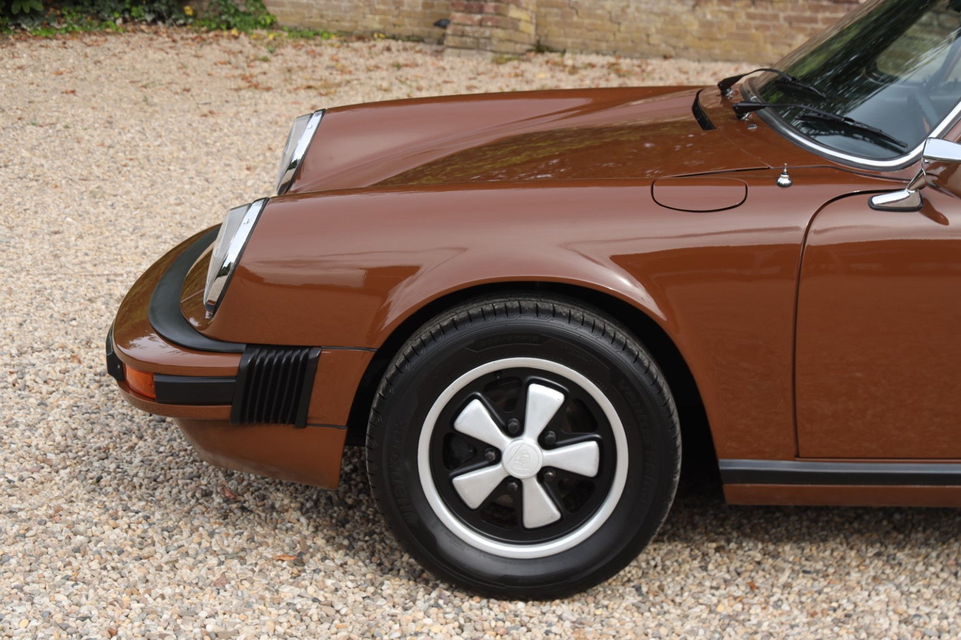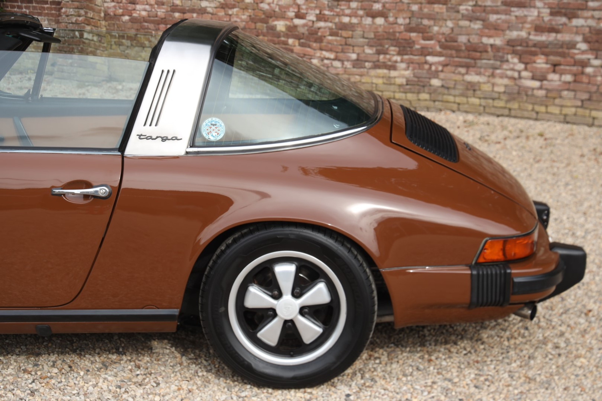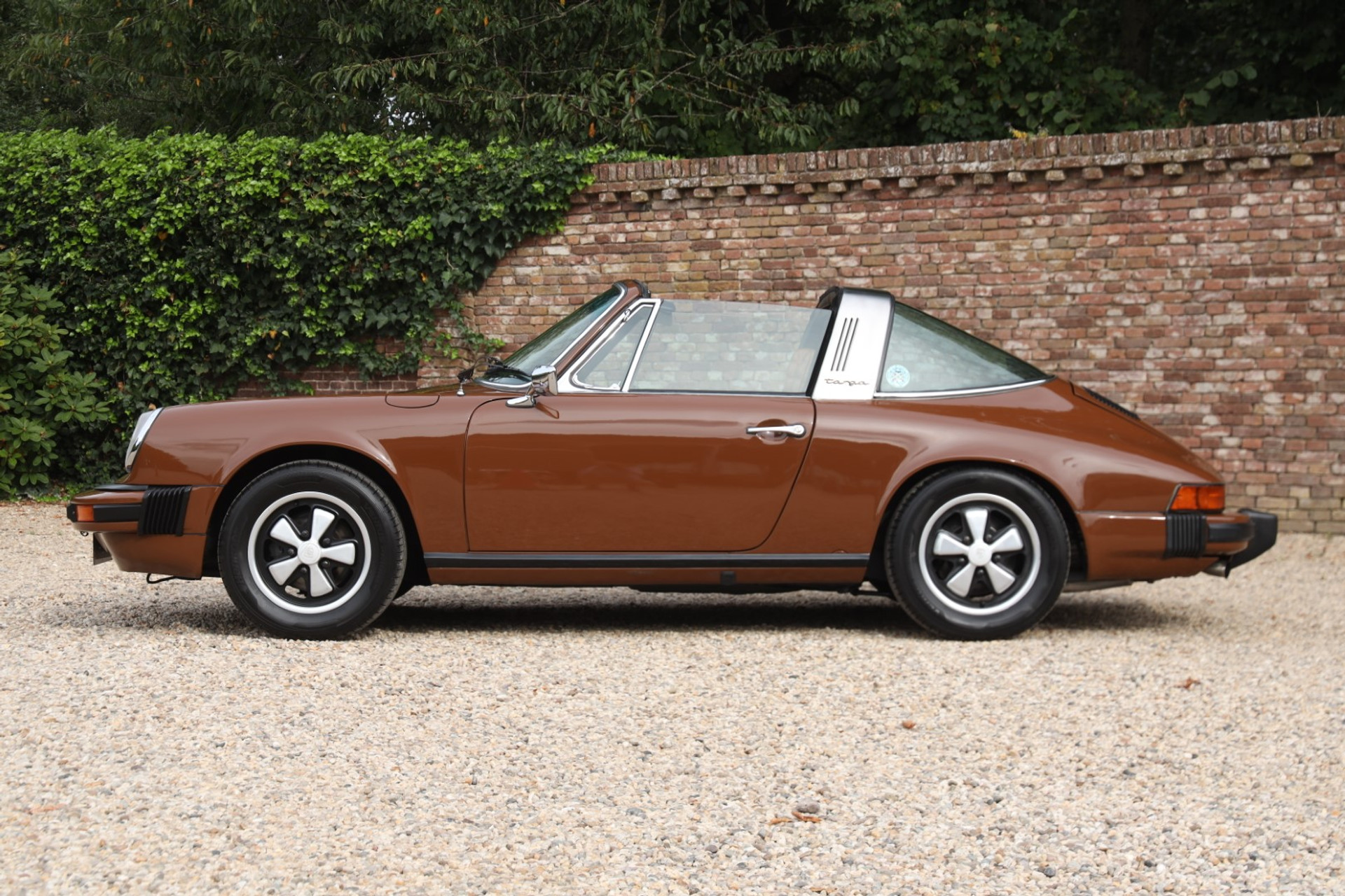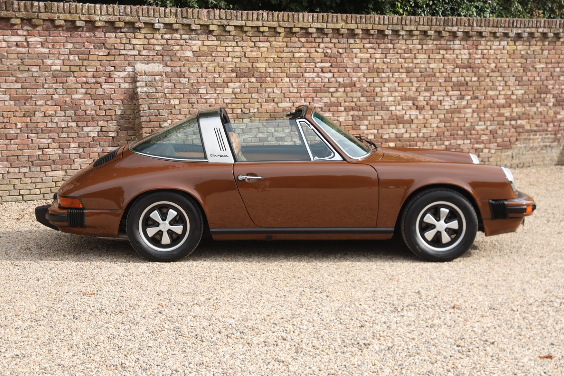 Neem even afstand en kijk ernaar: de carrosserie is prachtig recht, de lak is keurig en correct aangebracht en hij staat trots op die iconische Fuchs-velgen. De houding is precies zoals het hoort, puur klassiek 911. Hij oogt precies zoals een Targa uit het midden van de jaren zeventig eruit moet zien: doelgericht, elegant en tijdloos.