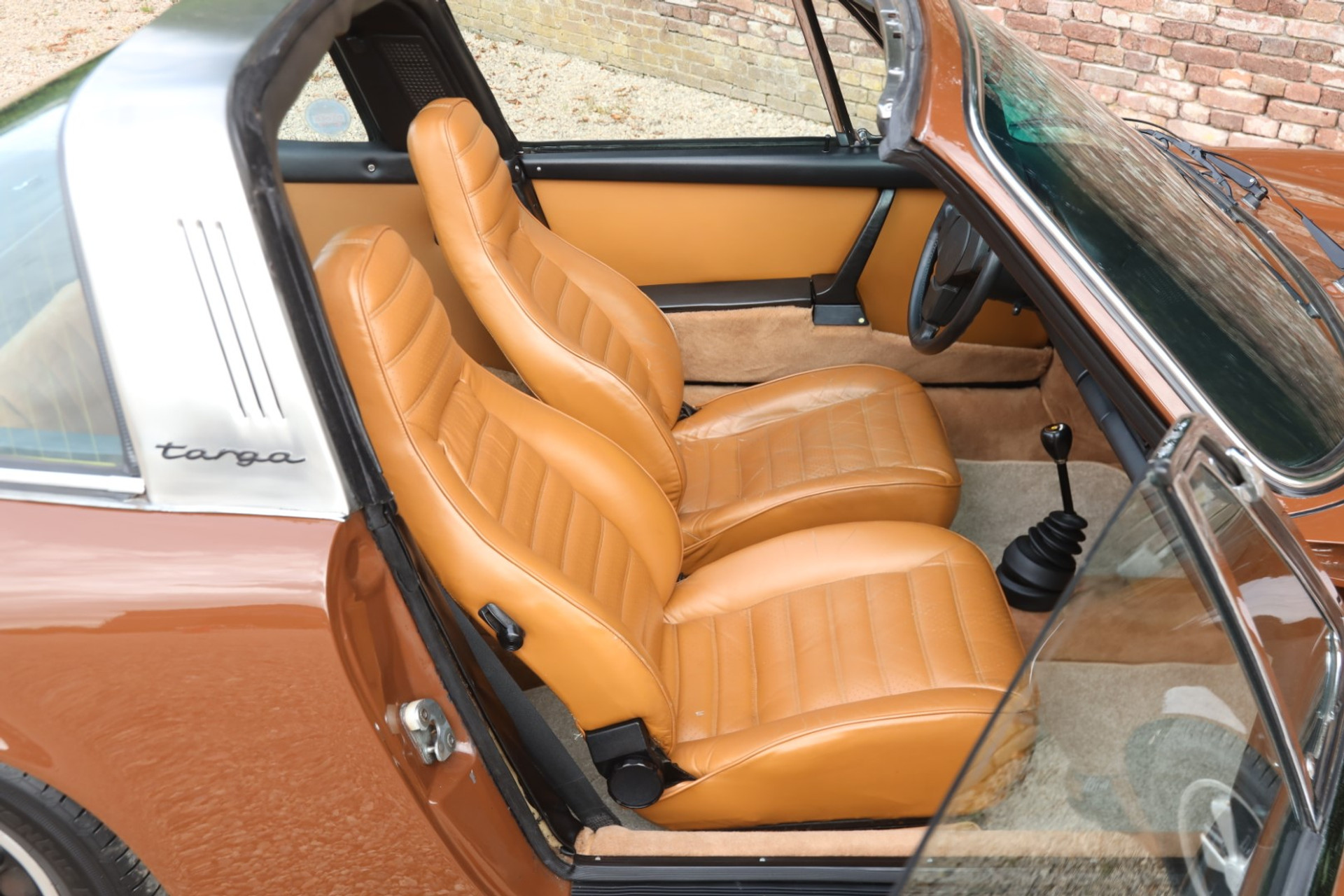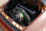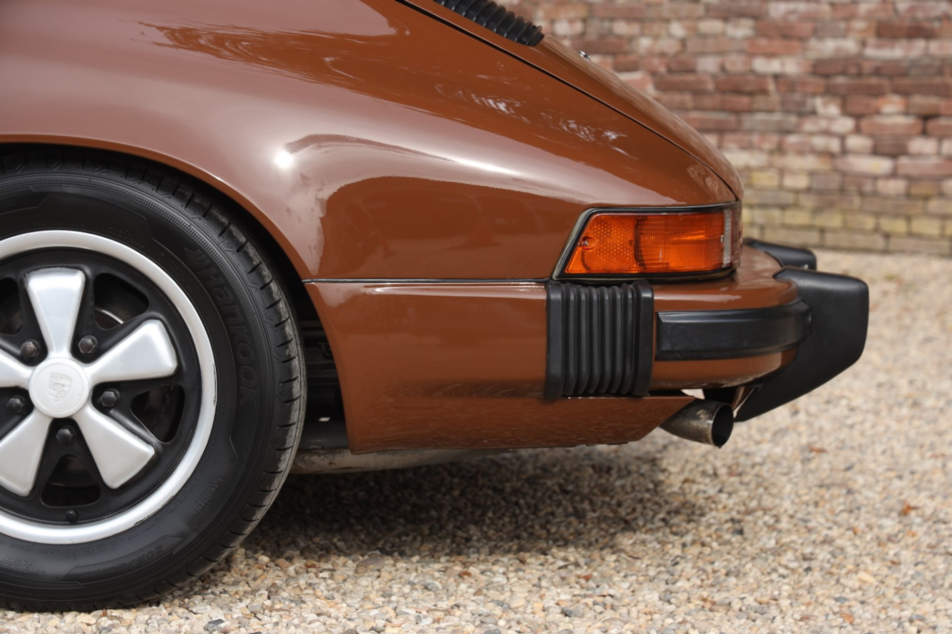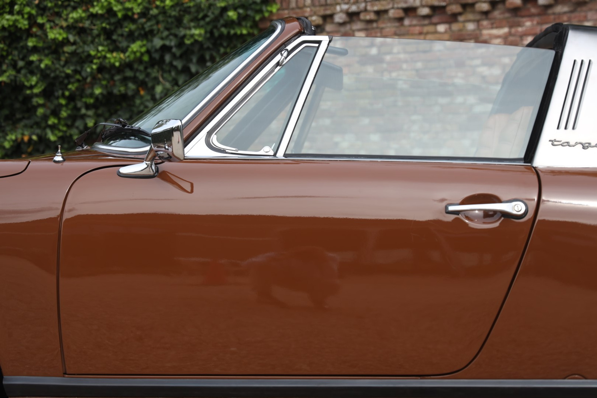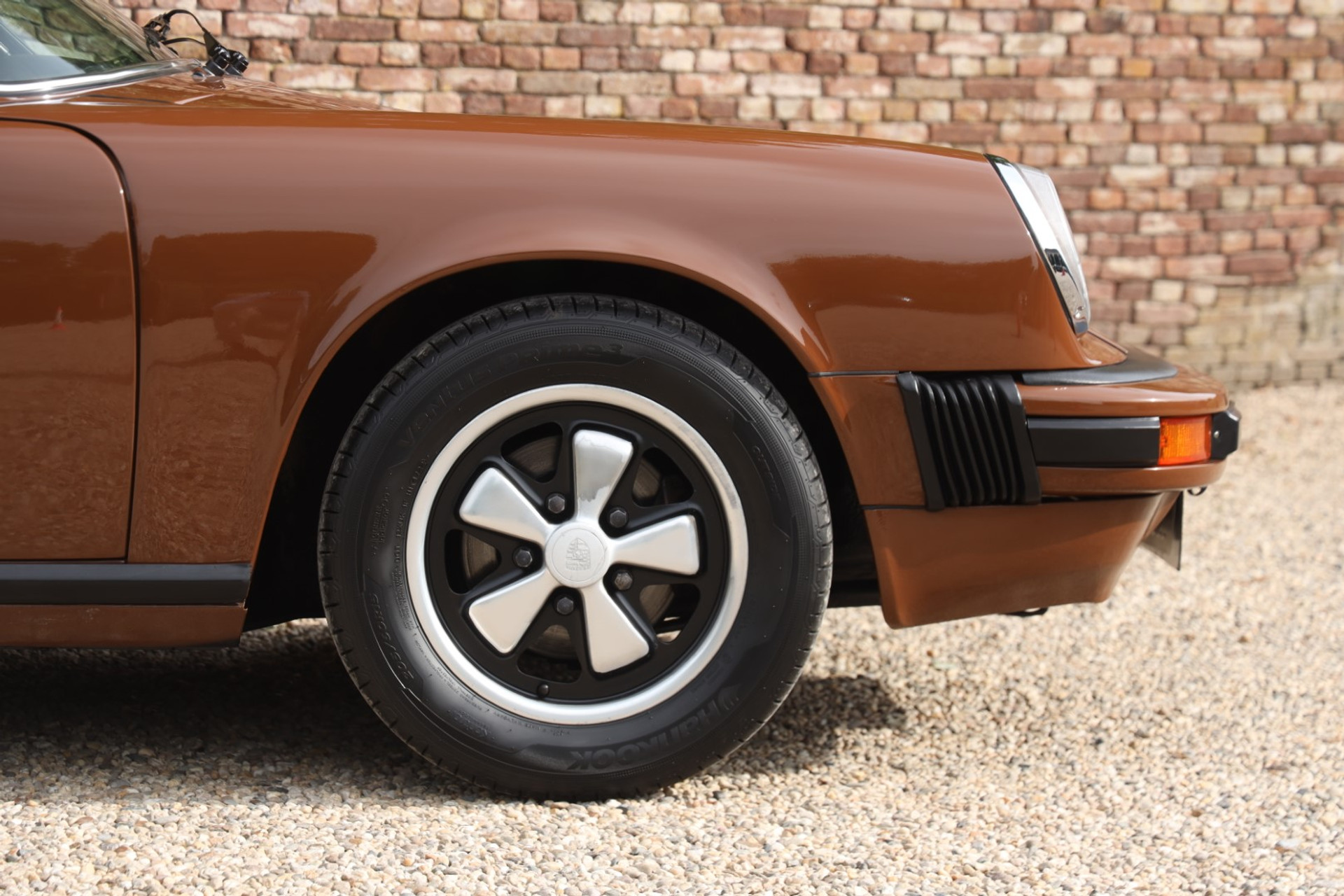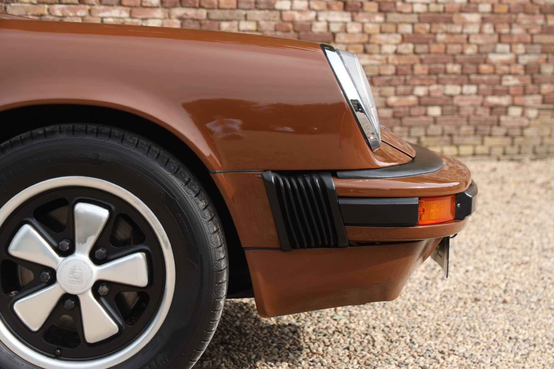 Neem even afstand en kijk ernaar: de carrosserie is prachtig recht, de lak is keurig en correct aangebracht en hij staat trots op die iconische Fuchs-velgen. De houding is precies zoals het hoort, puur klassiek 911. Hij oogt precies zoals een Targa uit het midden van de jaren zeventig eruit moet zien: doelgericht, elegant en tijdloos.