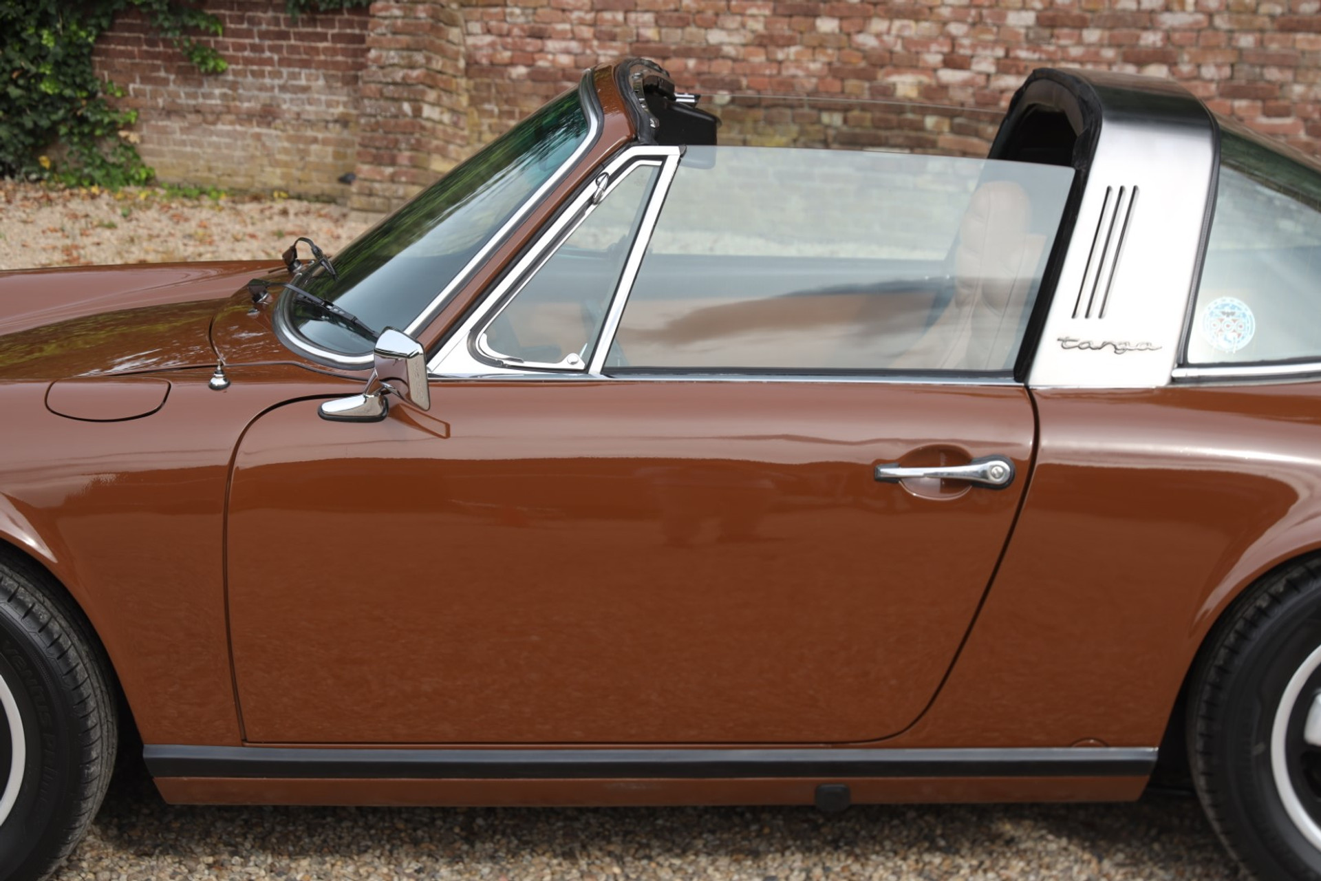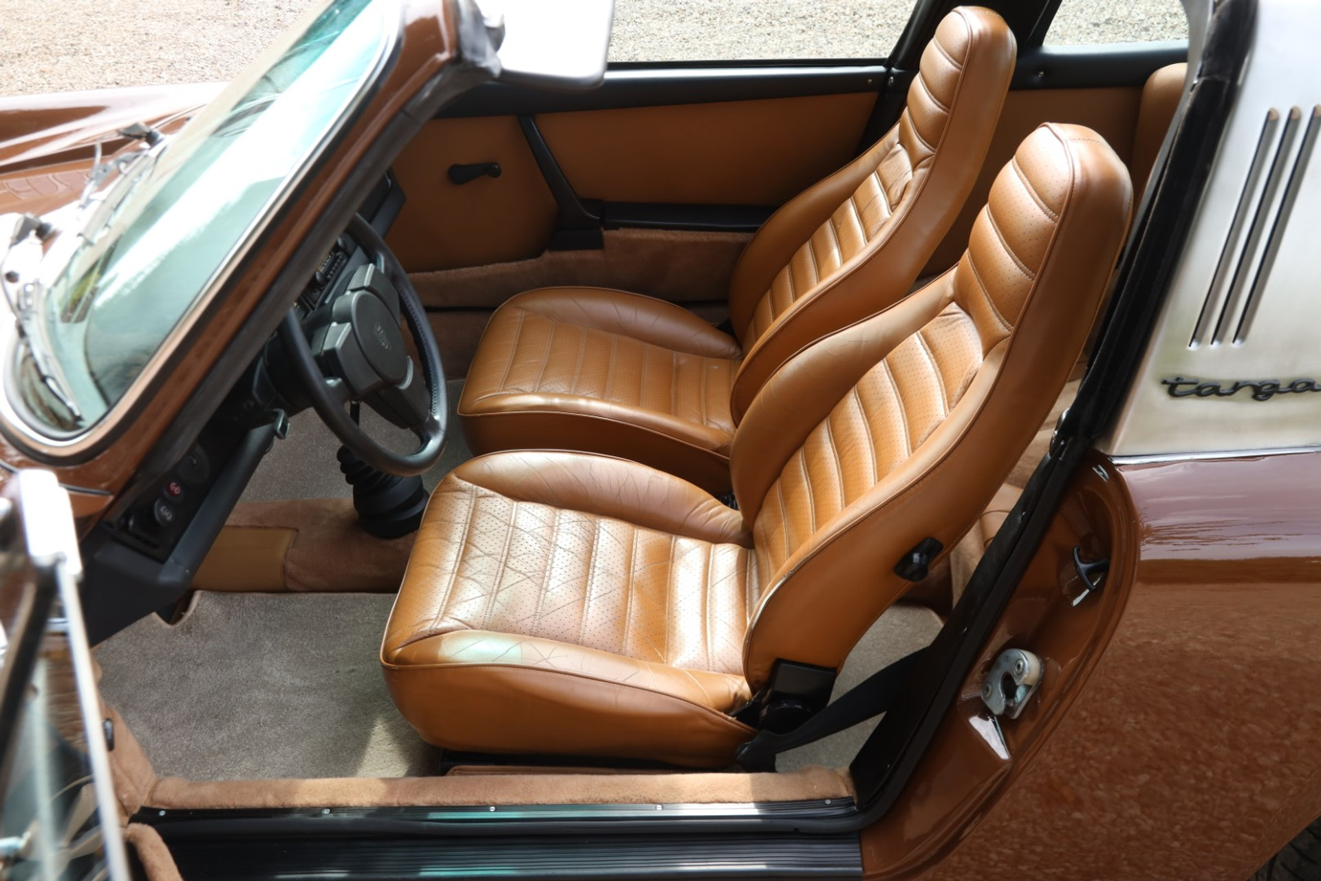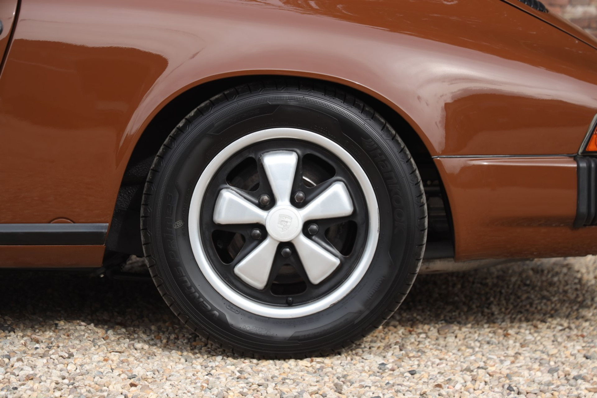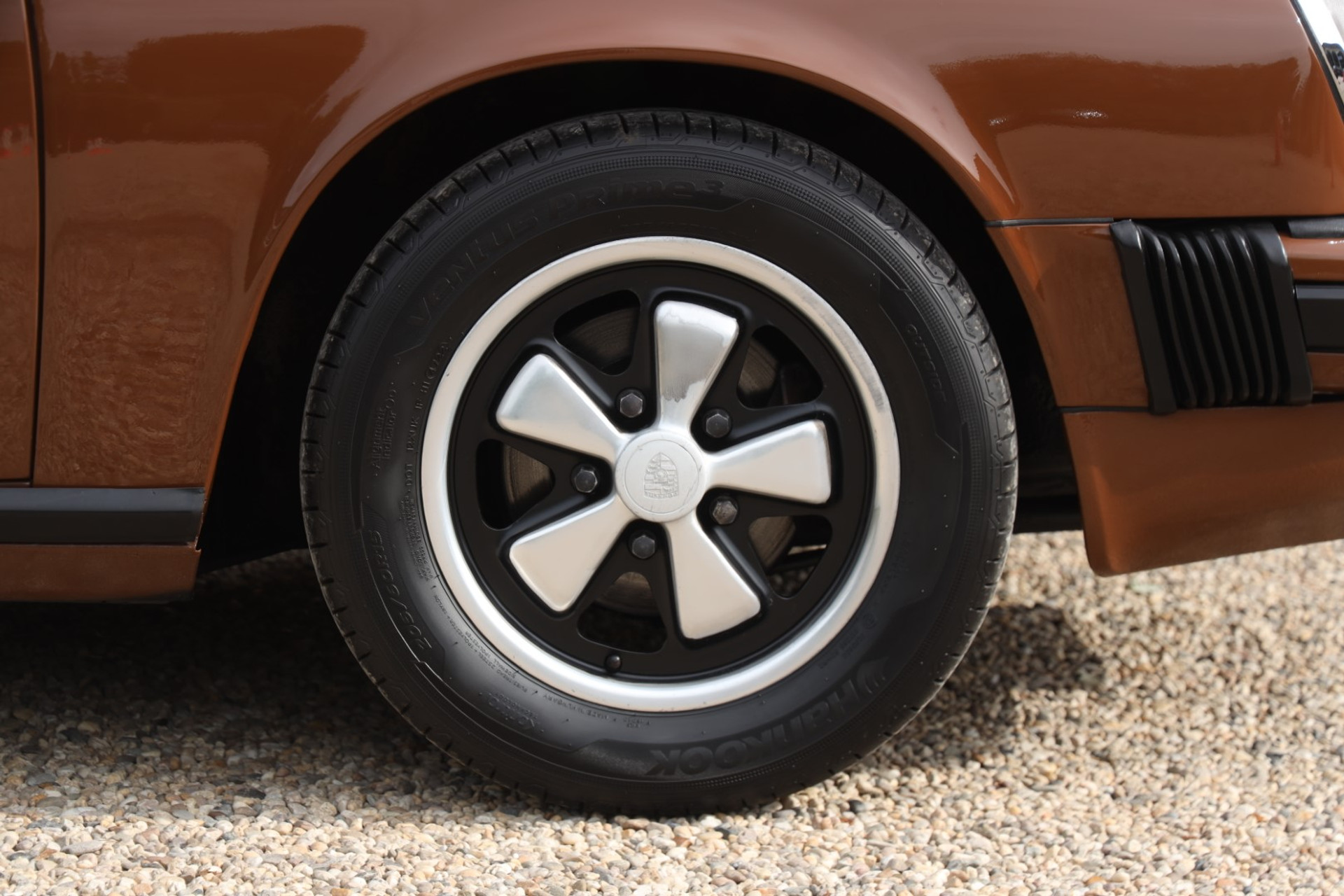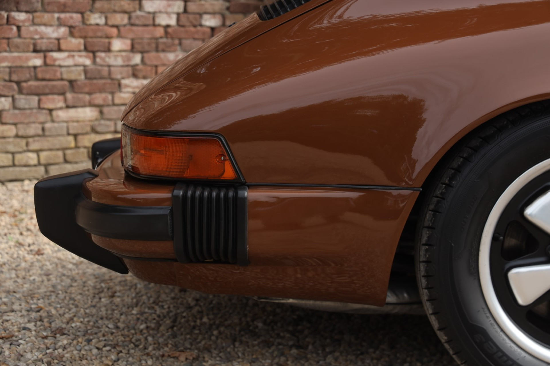 Neem even afstand en kijk ernaar: de carrosserie is prachtig recht, de lak is keurig en correct aangebracht en hij staat trots op die iconische Fuchs-velgen. De houding is precies zoals het hoort, puur klassiek 911. Hij oogt precies zoals een Targa uit het midden van de jaren zeventig eruit moet zien: doelgericht, elegant en tijdloos.