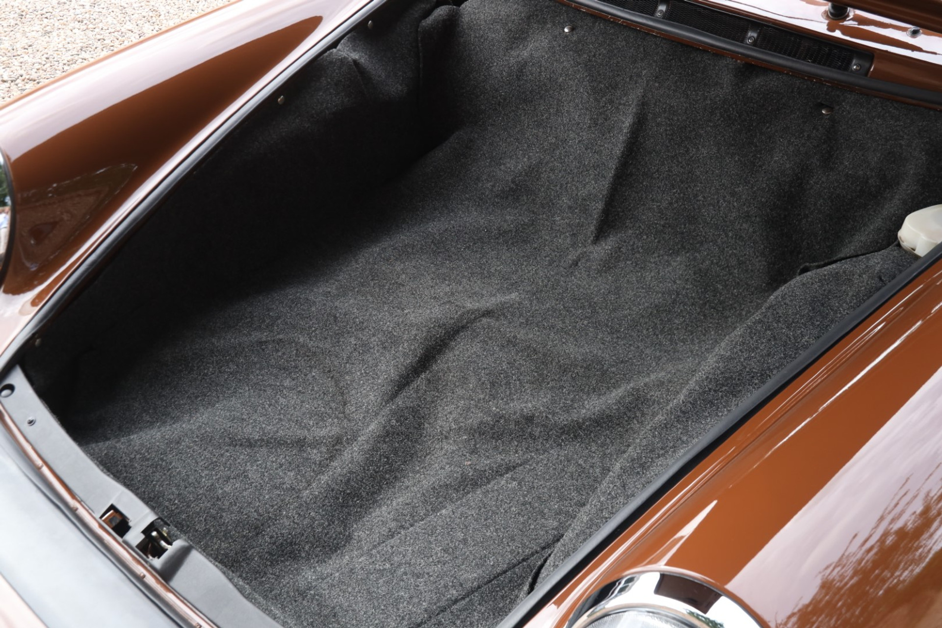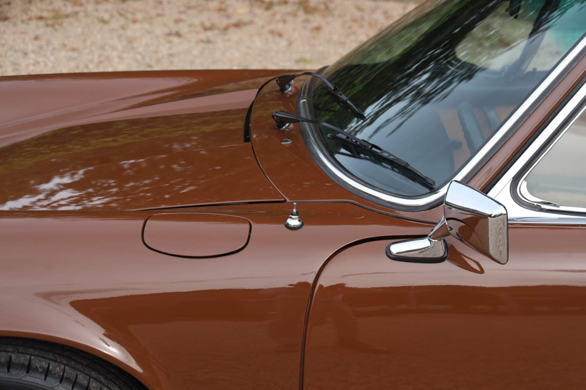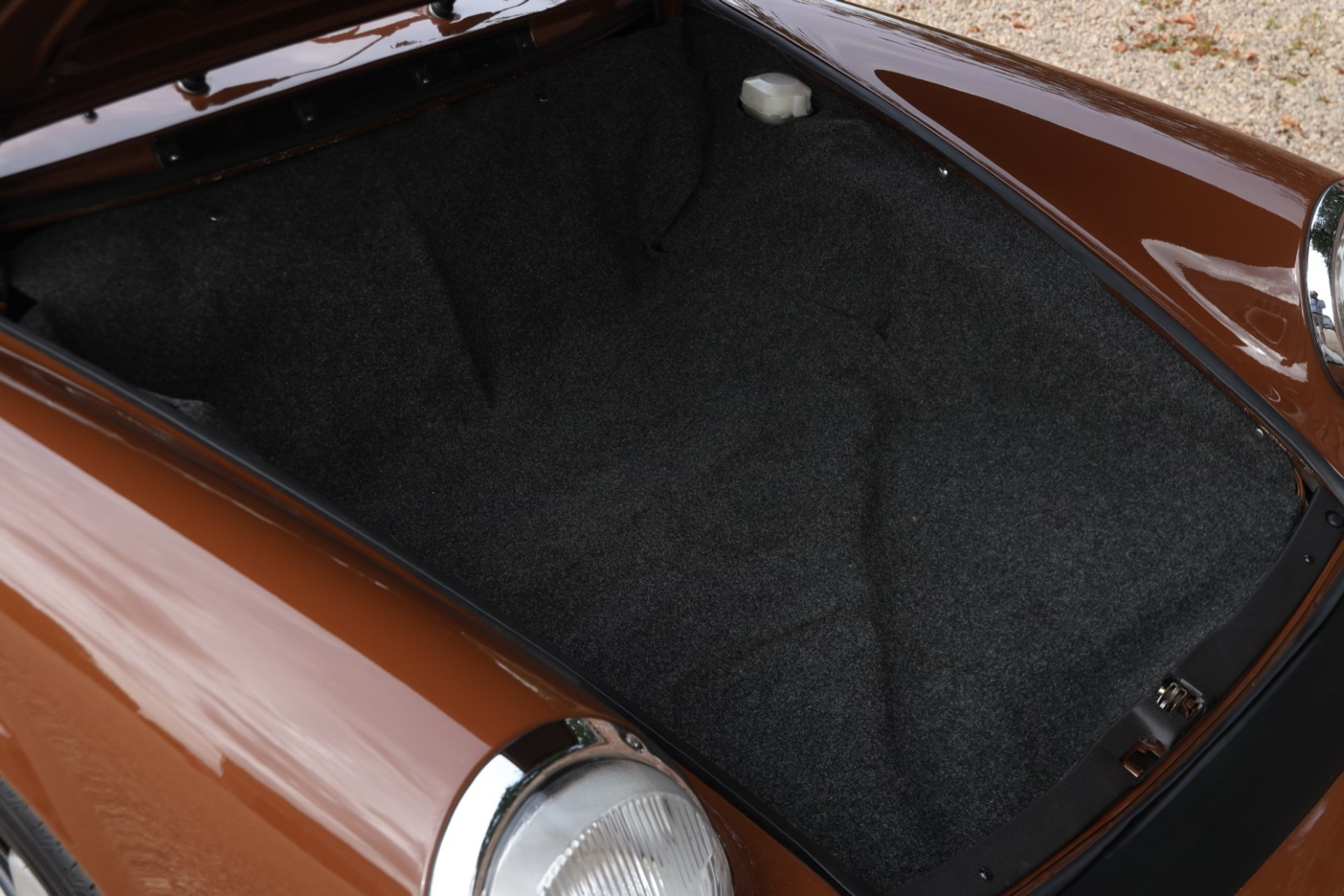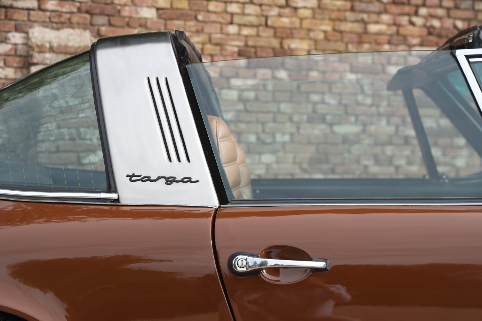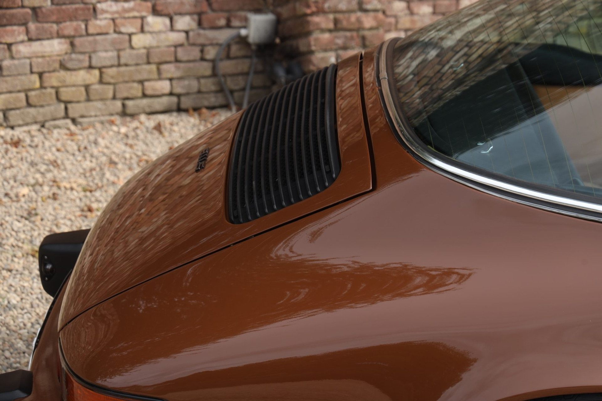Neem even afstand en kijk ernaar: de carrosserie is prachtig recht, de lak is keurig en correct aangebracht en hij staat trots op die iconische Fuchs-velgen. De houding is precies zoals het hoort, puur klassiek 911. Hij oogt precies zoals een Targa uit het midden van de jaren zeventig eruit moet zien: doelgericht, elegant en tijdloos.