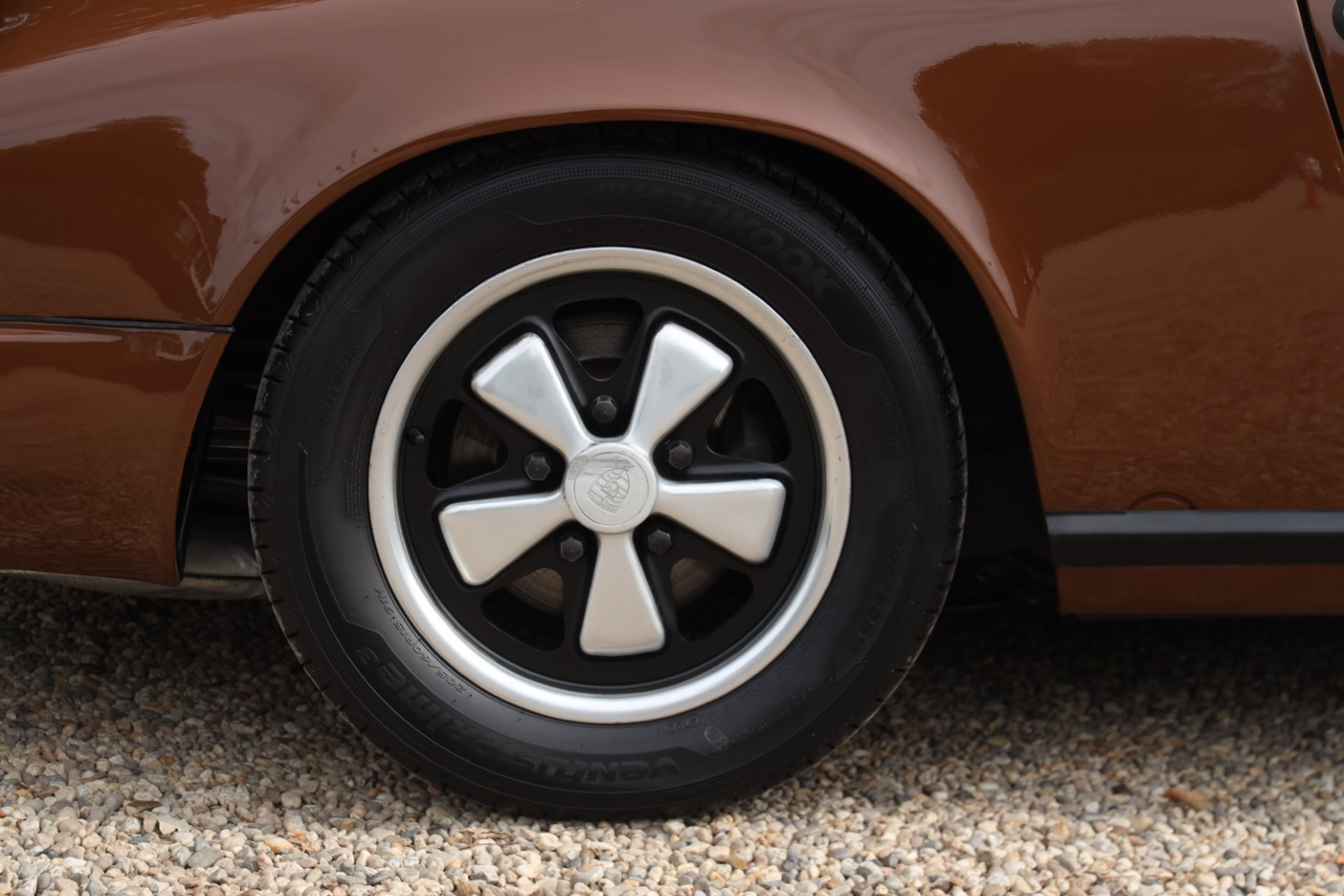 Treten Sie einen Schritt zurück und betrachten Sie ihn: Die Karosserie ist wunderbar gerade, der Lack sauber und korrekt ausgeführt, und er steht stolz auf jenen ikonischen Fuchs-Felgen. Die Haltung ist exakt so, wie sie sein soll – klassischer 911 in Reinform. Genau so muss ein Targa aus der Mitte der siebziger Jahre aussehen: zielgerichtet, elegant und zeitlos.