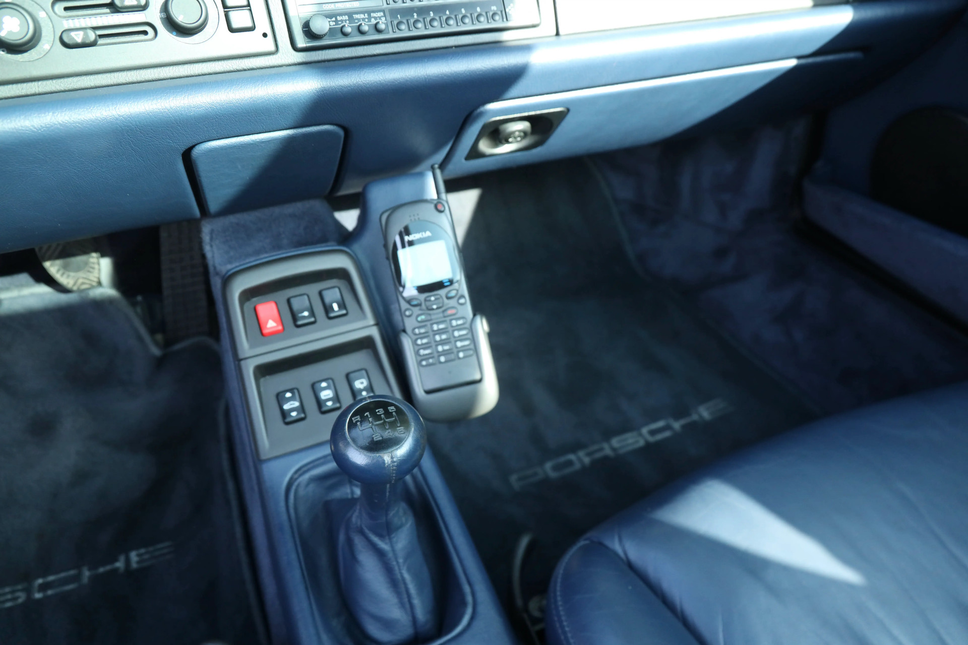 Im Innenraum erwartet Sie eine wunderschöne Lederausstattung in Midnight Blue, ausgeführt im edlen Raff-Leder. Mit Extras wie Klimaanlage, Tempomat, dem Blaupunkt Symphony Radio und dem mittlerweile ikonischen Nokia-Telefon bietet dieser 993 einige bemerkenswerte Details.