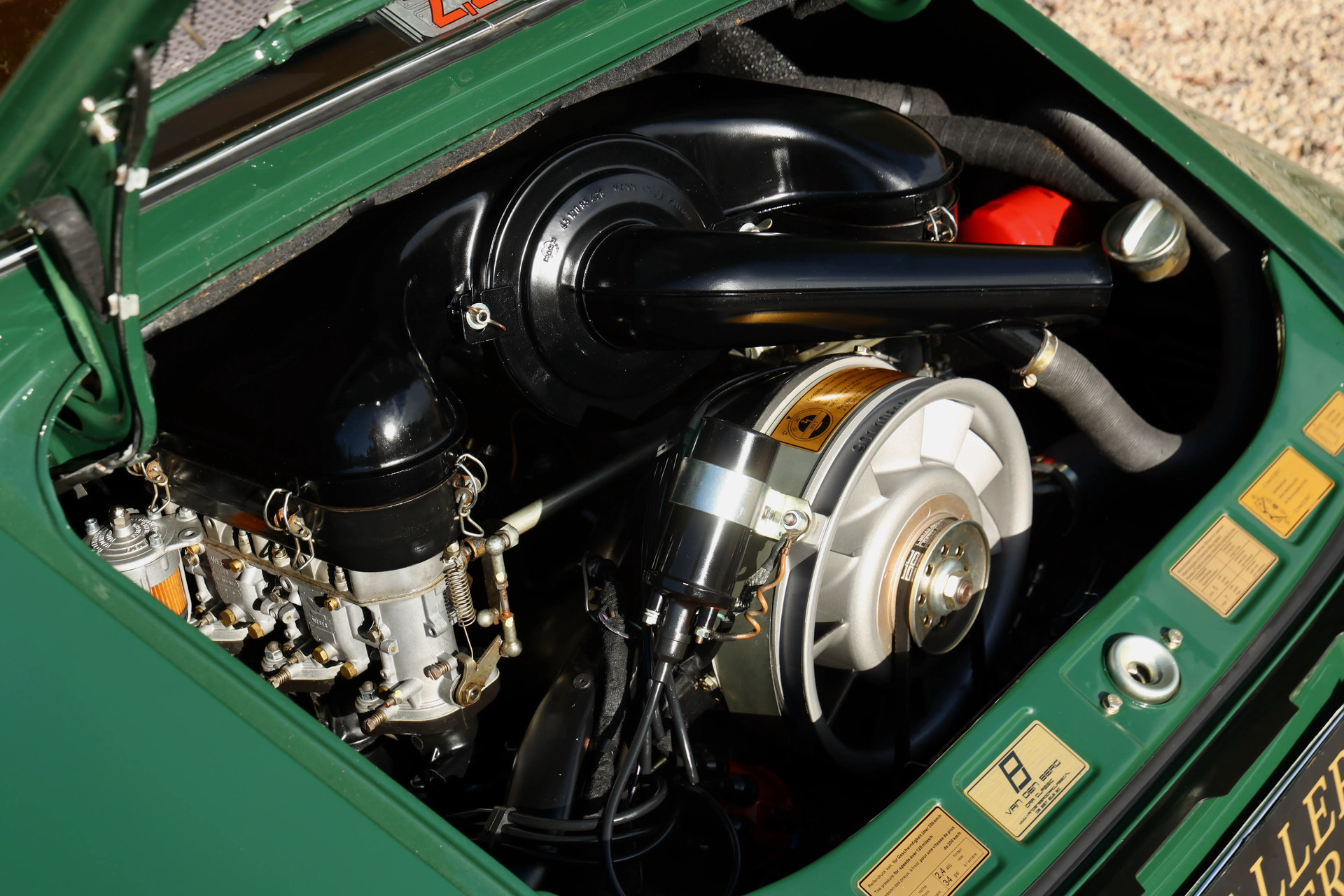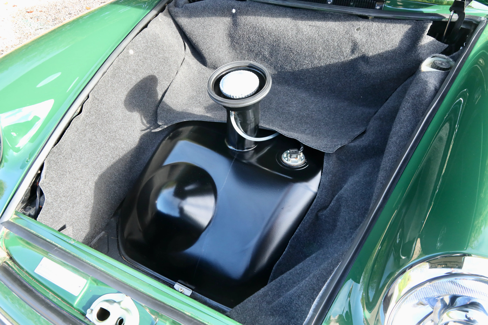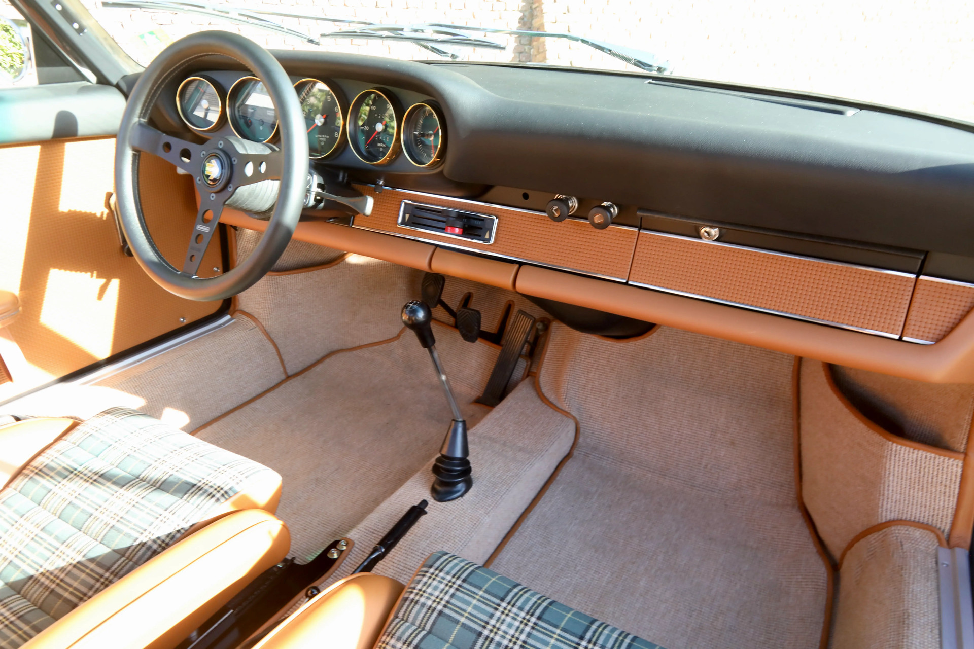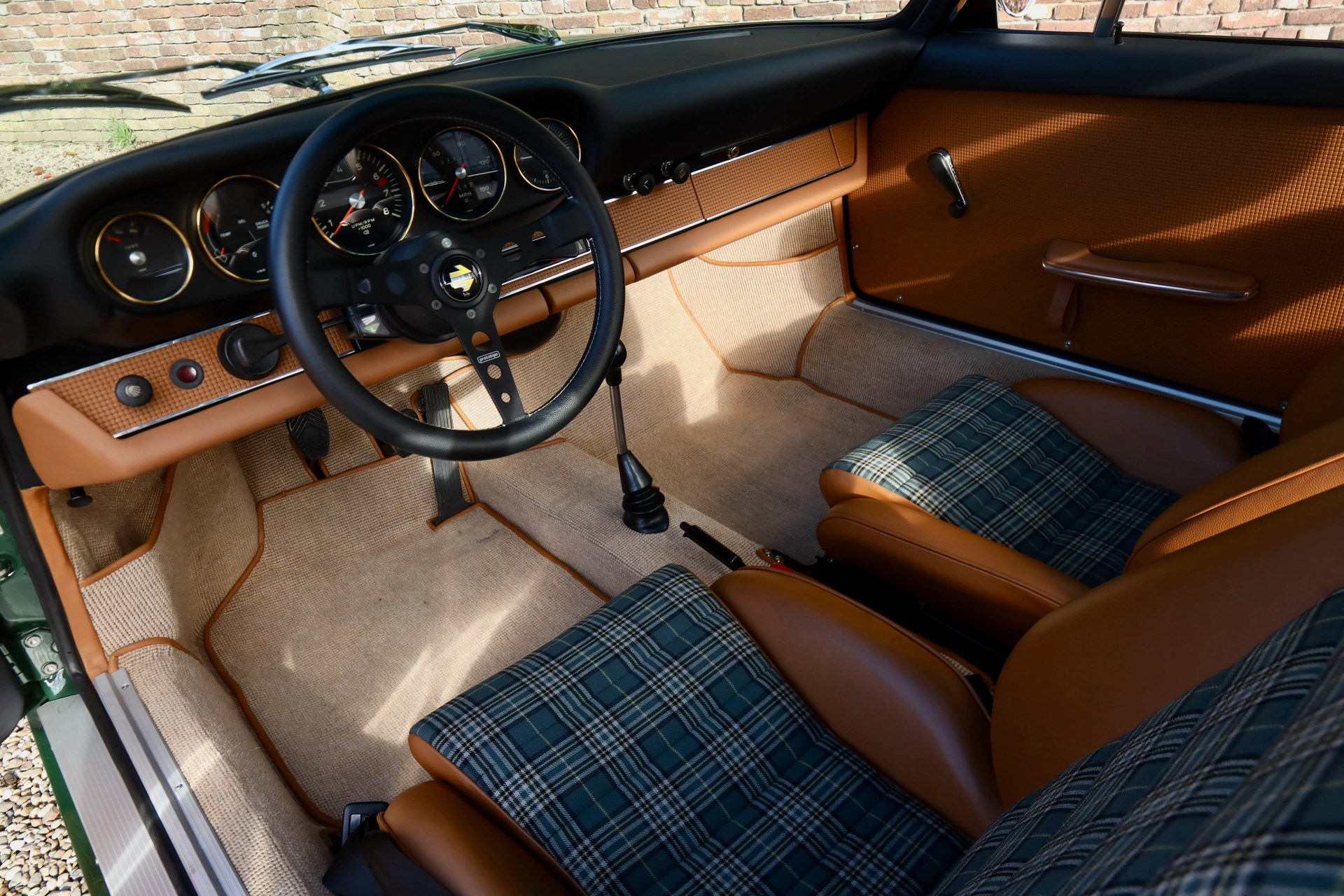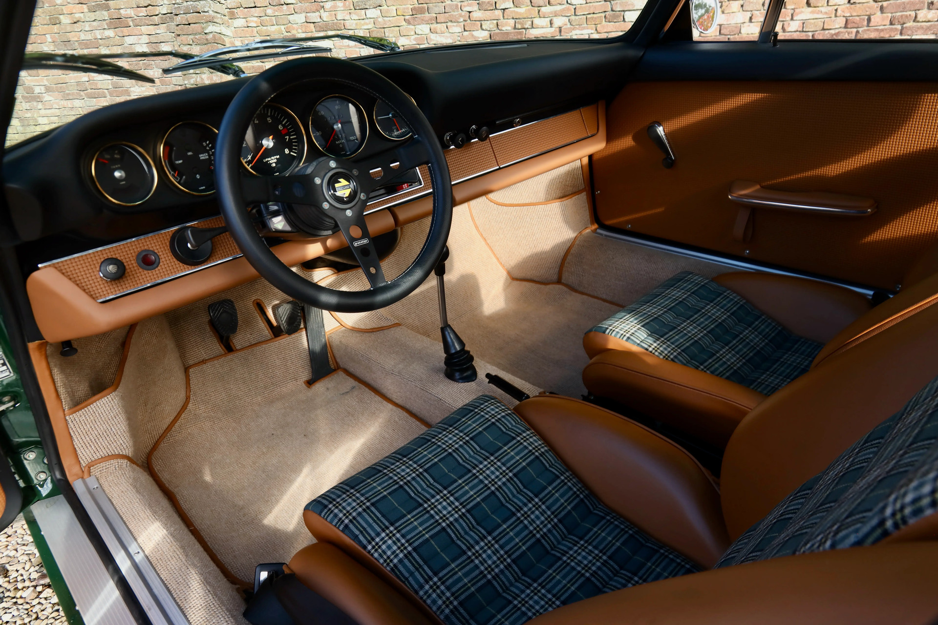 Visually, the car is nothing short of captivating. Finished in the iconic Irish Green, paired with a brown leather interior featuring classic houndstooth fabric in matching green tones, this is a color combination that radiates understated elegance and individuality. The widened steel fenders give it a muscular stance without disturbing the timeless purity of the 911’s lines. The front hood, featuring a centrally mounted fuel filler, nods to Porsche’s historic racing pedigree — a subtle but deliberate touch that makes clear this is not just a restoration, but a visionary reinterpretation.