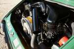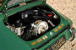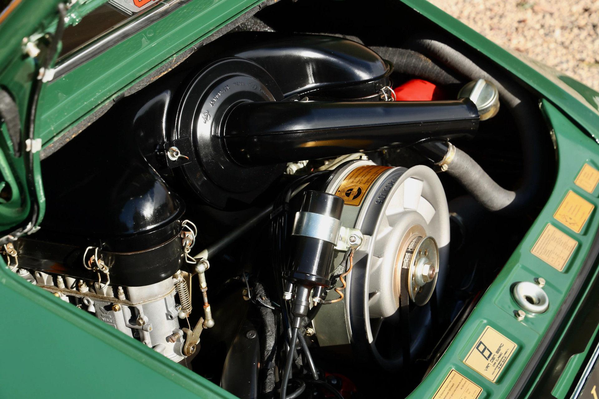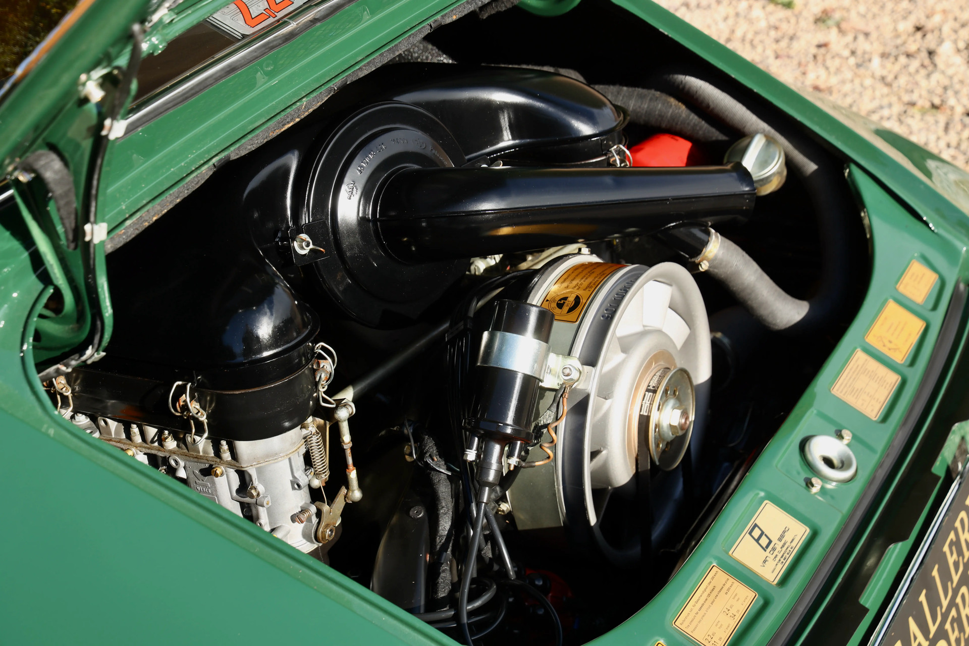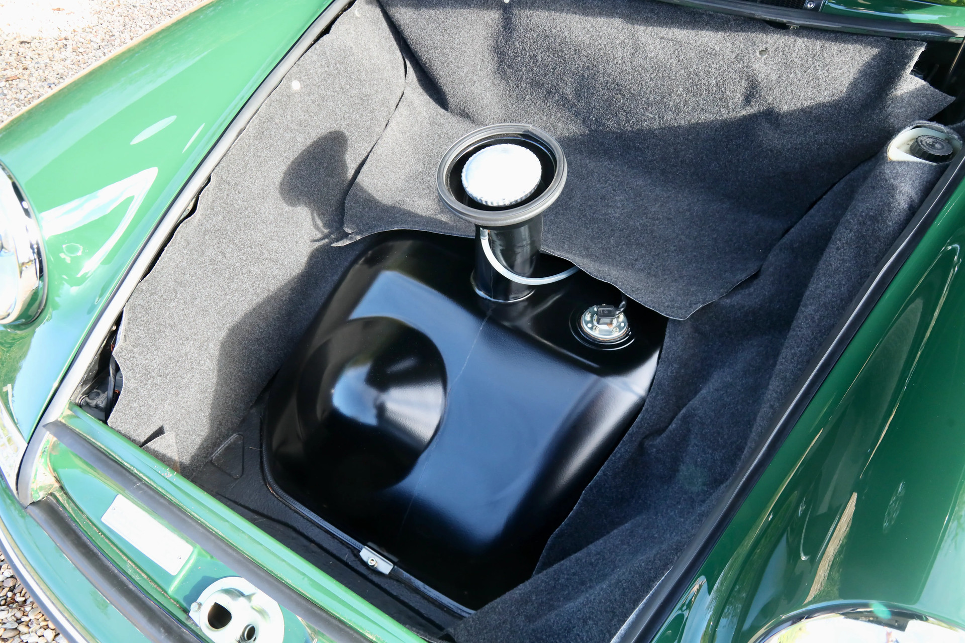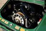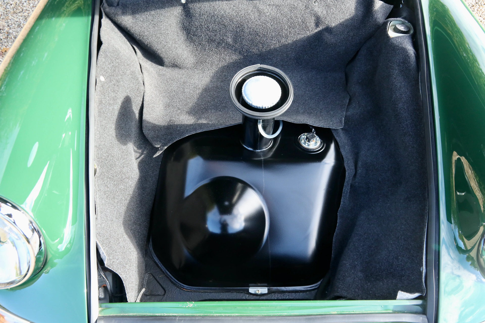 Visually, the car is nothing short of captivating. Finished in the iconic Irish Green, paired with a brown leather interior featuring classic houndstooth fabric in matching green tones, this is a color combination that radiates understated elegance and individuality. The widened steel fenders give it a muscular stance without disturbing the timeless purity of the 911’s lines. The front hood, featuring a centrally mounted fuel filler, nods to Porsche’s historic racing pedigree — a subtle but deliberate touch that makes clear this is not just a restoration, but a visionary reinterpretation.