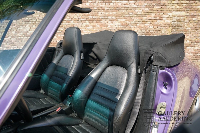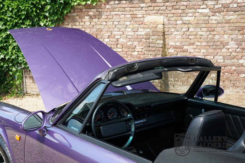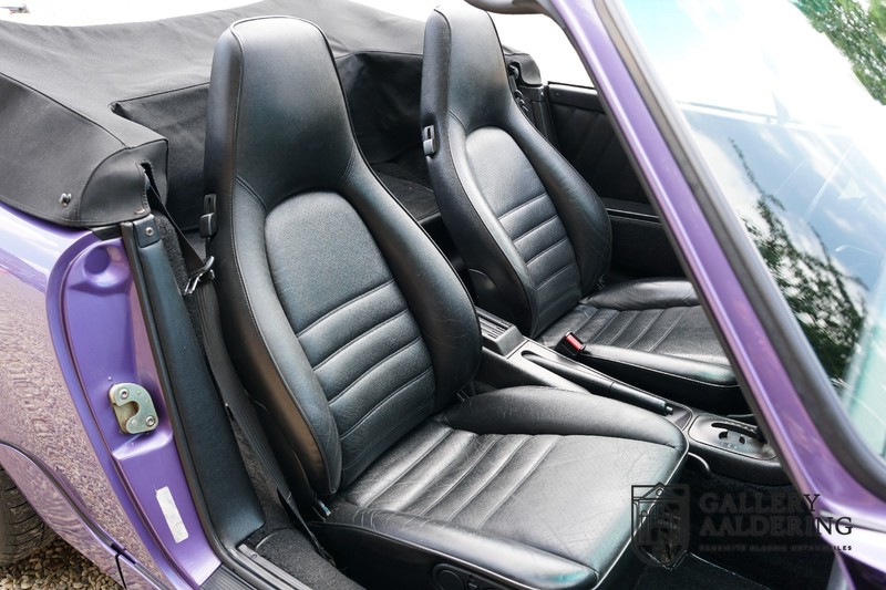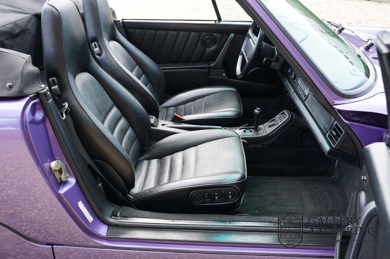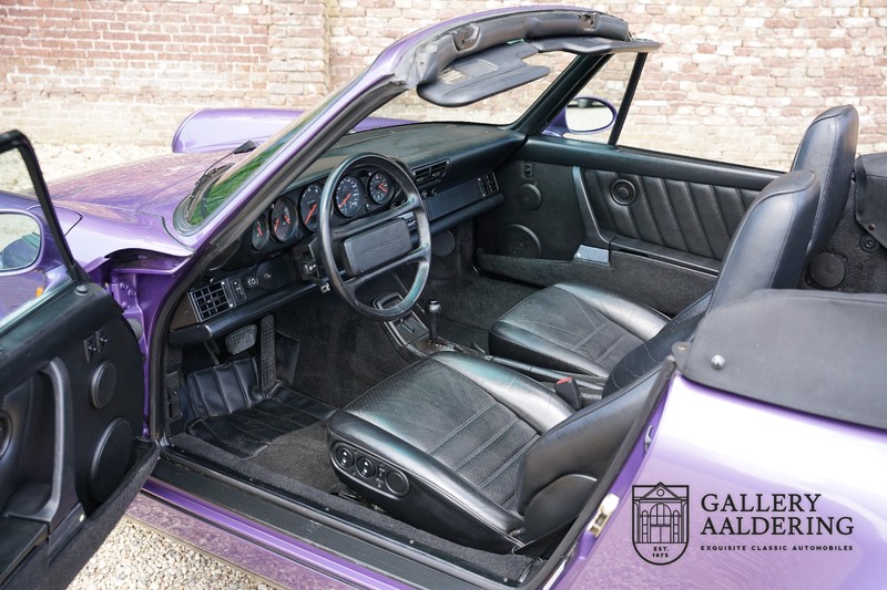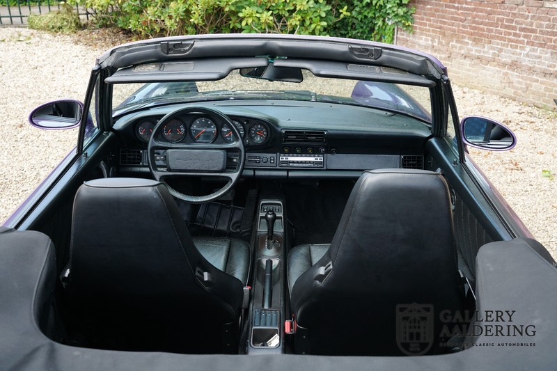 Het interieur is minstens zo fraai als het exterieur. De stoelen zijn bekleed met zwart leder dat in prima conditie verkeert. De rest van het interieur is voorzien van fraaie zwarte tapijten. Uiteraard is er een windschot aanwezig om comfortabel open te kunnen rijden. Verder valt de luxe uitrusting van de Porsche 964 op. Zo is er airconditioning aanwezig, cruise control, stoelverwarming, elektrisch verstelbare stoelen, is de kap elektrisch te bedienen, zijn stuur en pook eveneens met leder bekleed en is er een originele Becker radio aanwezig.